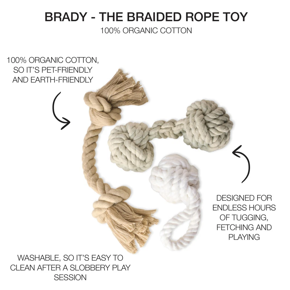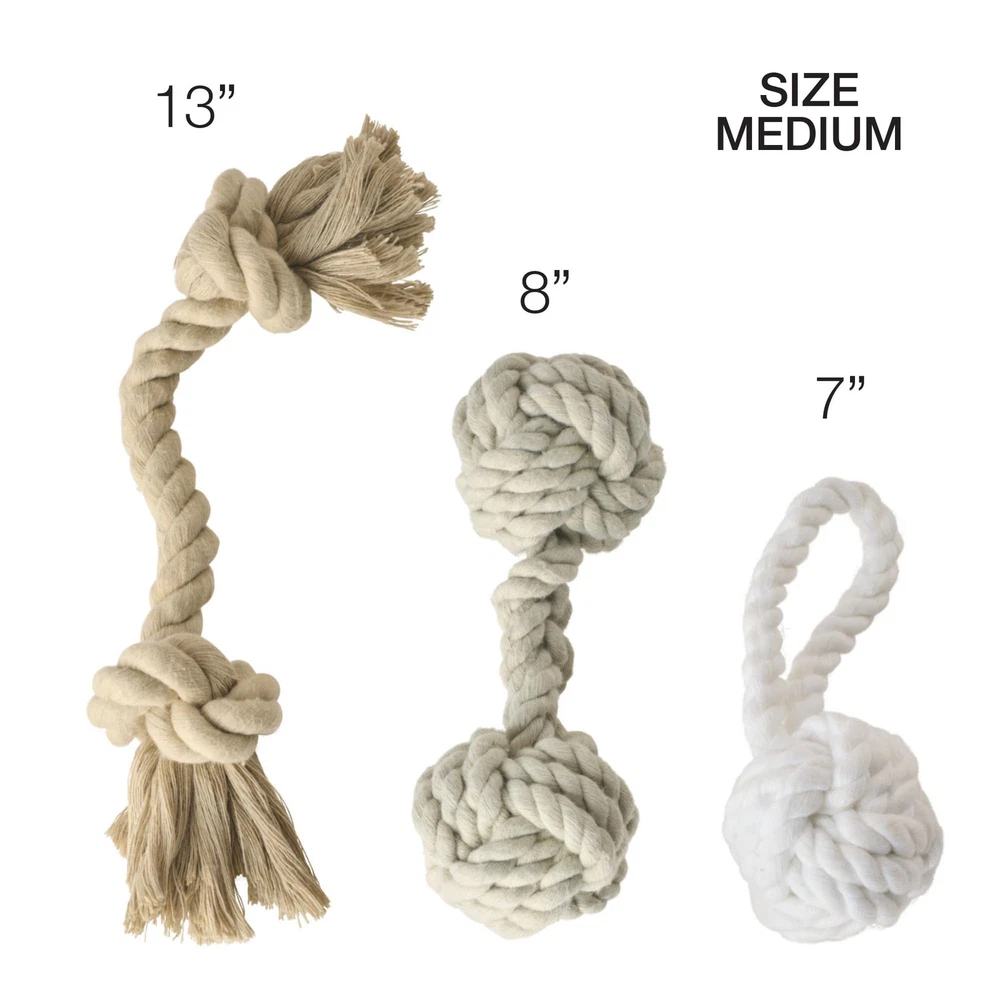 "Rope For The Best" 3-Pack Organic Cotton Dog Rope Pull Toys—the ultimate playtime companions for pets of all breeds! With these toys, it's play, tug, fetch, and repeat—keeping your furry friend entertained and happy for hours on end. Crafted from 100% organic cotton, they're not only pet-friendly but also earth-friendly, making them a guilt-free choice for environmentally conscious pet parents. Sturdy and washable, these toys are designed to withstand even the toughest play sessions. Their durable materials and tug toy design make them perfect for interactive play, promoting healthy exercise and bonding between you and your pet. Plus, they come highly recommended by our furry testers, earning 5-paws for fun! Whether it's a birthday, holiday, or just because, our 3-Pack Organic Cotton Dog Rope Pull Toys make the paw-fect gift for all your beloved fur babies! SUSTAINABLE - Crafted from 100% organic cotton FUNCTIONAL - Designed for tug and fetch. VERSATILE - For all dog breeds large and small and includes 3 different rope toys COMFORTABLE - Enjoy interactive play with your dog. Made of durable cotton for endless hours of tug and fetch. PACKAGING: Printed on recycled paper and sustainably made in eco-conscious solar-powered facility. Please recycle!