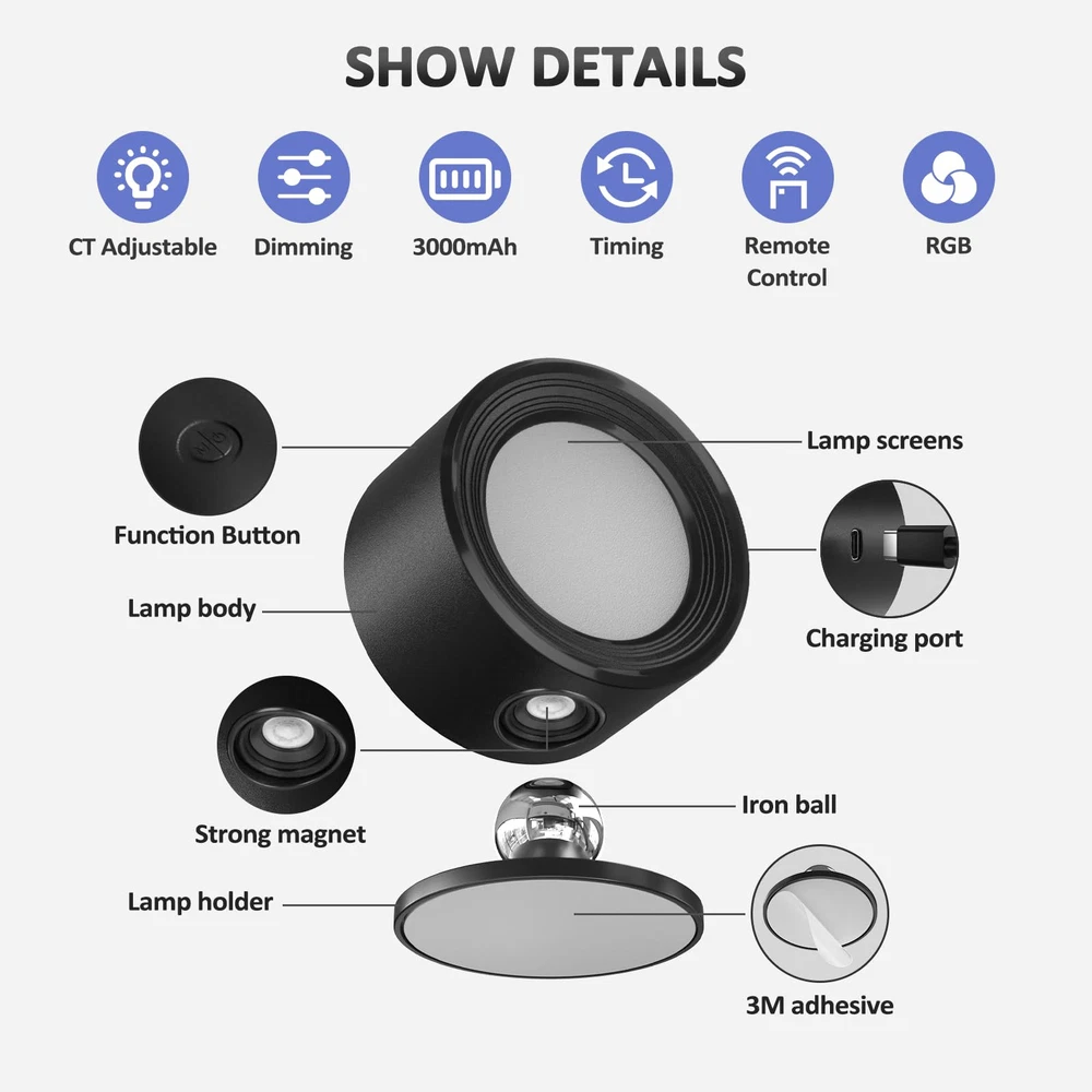 LED Wall Lights 3 Pcs with Remote, RGB Ambience Wall Sconces Lamp 3000mAh Rechargeable Battery Operated, 3 Color Temp & Dimmable Magnetic 360° Rotation Cordless Light for Living Room Bedside NOTE: Please Install The Lamp Holder First And Bond It To The Wall For At Least 4 Hours Before Installing The Lamp Body. Wet Weather, Uneven Wall, or Dust May All Affect The Bonding Performance Of The Lamp Holder. Rechargeable LED Wall Mounted Lights. LED wall mounted lamps built-in a 3000mAh rechargeable battery. The working time after full charge determined based on brightness. Fully charged less than 4hrs can work for up to 24hrs in medium brightness, maximum brightness is up to 15hrs. Portable cordless wall light sconces with USB-C charging port. NOTE: Please Install The Lamp Holder First And Bond It To The Wall For At Least 4 Hours Before Installing The Lamp Body. Wet Weather, Uneven Wall, or Dust May All Affect The Bonding Performance Of The Lamp Holder. LED Wall Lights with Button&Remote Control. LED wall sconce also comes with a remote. Therefore, two control methods for this magnetic wall lights which are button control and remote control. You can complete all settings through the remote control: ON/OFF; 3 color temperature switching; 7 RGB ambience lights switching; 6 colorful RGB combination lights switching; brightness adjustment and Timing. Button control(long press) can also adjust the brightness stepless. RGB Ambient & 3 Color Temperature. The RGB mode and 3 color temperature switches allow this wall lights to provide you with up to 10 different monochrome lights: Red, Orange, Yellow, Green, Cyan, Blue,Purple and the Warm Light, Cool Light, Natural Light. In addition, 6 combination lights can be provided: Colorful Gradient, Heart Beat, Romantic Breathing, Magic Forest, Colorful Breathing, Colorful Dance. This RGB ambient light can create a colorful atmosphere for you, is great helper for party. 360°Free Rotations Magnetic Ball. This bedside lamp use magnetic technology. The lamp body and lamp holder are adsorbed by a magnetic iron ball, so the lamp body can rotate at any angle. You can take it off the wall in 1s and use it as flashlight, removable light, portable light, emergency light etc. Adjust any angle according to your usage scenario. Easy to Install. LED wall lamp is Tools-Free installation: This led wall reading lights come with magnetic mount and strong 3M adhesive. It is easy to remove the light from the magnet mount for charging.(But also come with screw, If you want to permanently fix the lamp in a certain position, you can use screw mounting.) Application&Services. Our universal multifunctional wall lamp is small&simple design but modern&widely application. This magnetic wall light is widely used in wardrobes, TV walls, bedside, hallway, cabinet, closet, stairway, bedrooms, stairs and corridors. It's super bright but Eye-Caring, perfect for reading, working, study, makeup. Please feel free to contact us for any product issue. Better Light, Better Life !