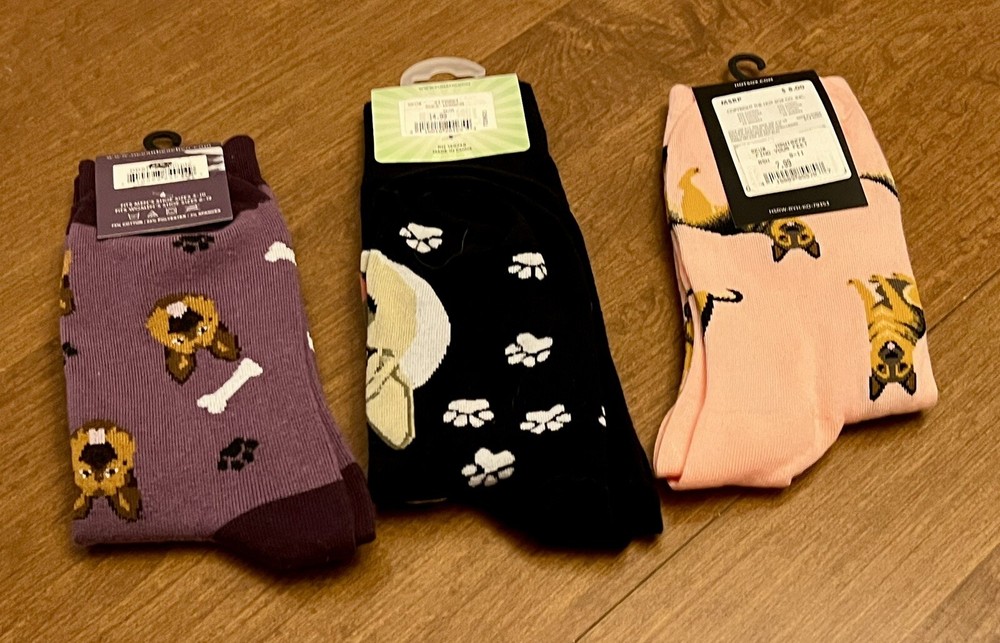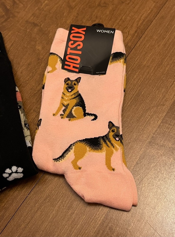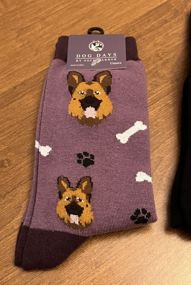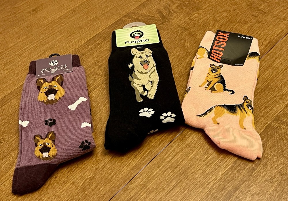 Brand New with tags Lot of 3 pairs ~ novelty German Shepherd socks •1 pair Hotsox brand (women’s) Color/Design: pink background with black & tan German Shepherds. Size Label states: “sock size 9-11/ Fits shoe size 4-10 1/2” Material: 53% Cotton, 24% Polyester, 21% Nylon, 2% Spandex. •1 pair Funatic brand (unisex) Color/Design: black background with German Shepherds and paw prints Size label states: Men’s 6-11 / Women’s 7 1/2-12 One Size Fits Most Material: 70% Cotton, 28% Polyester, 2% Elastic. •1 pair Dog Days brand (unisex) Color/Design: purple background with German Shepherd faces, white bones, black paw prints. Size label states: Fits Men’s Shoe Sizes 5-10, Fits Women’s Shoe Sizes 6-12. Material: 75% Cotton, 22% Polyester, 3% Spandex. Total Original retail value $34.96 Will ship out via USPS Ground Advantage within 2 business days of payment. However, I usually ship within 1 business day if possible. Thanks for looking!