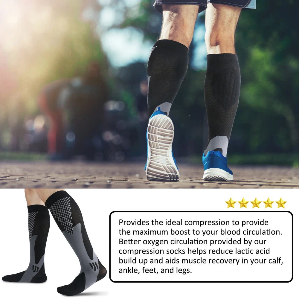 3Pairs Compression Socks 30-40 mmhg Knee High Running Sport Long Stockings Ankle Specification Products Name: Compression Socks Compression Level: first level (30-40mmHg) Size: S / M, L / XL, XXL Gender : Adults Socks Thickness: Medium Fabric: Elastic Nylon Function: Shaping, Anti-Friction,Pain Relief,Plantar Fasciitis,Spurs Arch Pain Suitable Season: Spring, Autumn, Winter, Summer Features 1. They provide pressure , promote blood circulation of legs and feet, and have a good effect of relieving fatigue of legs and feet. It offers the most perfect settlement scheme for those who sit for long period during travel or at work. 2. Can 360-degree stretch ,The compression technique is scientifically known to Relieve fatigue. We intend allay combining fashion, technology and science to bring you the triple comfort. Our compression socks' delivering 360-degree stretch for greater flexibility and durability. 3. Reduce Injiries ,Provide mild squeezing for warmness and protect legs from injury. Remove stress and help relieve discomfort, Provides true graduated compression to support your legs, reduce fatigue,soreness, and prevent injuries at the same time. 4. Increase Leg Comfort ,A veritable necessity for anyone working long-hours standing on their feet, or those heavily invested in athletics and a fitness lifestyle. It is great gift to joggers, athletes, workout fanatics, office workers, runners and climber. Package including(as your choice) 3Pairs of Compression Long Socks Tips : Please compare the detail sizes with you before you buy. FREE Shipping Any question , please contact us , we will try our best to help you solve your confusion.Thank you~