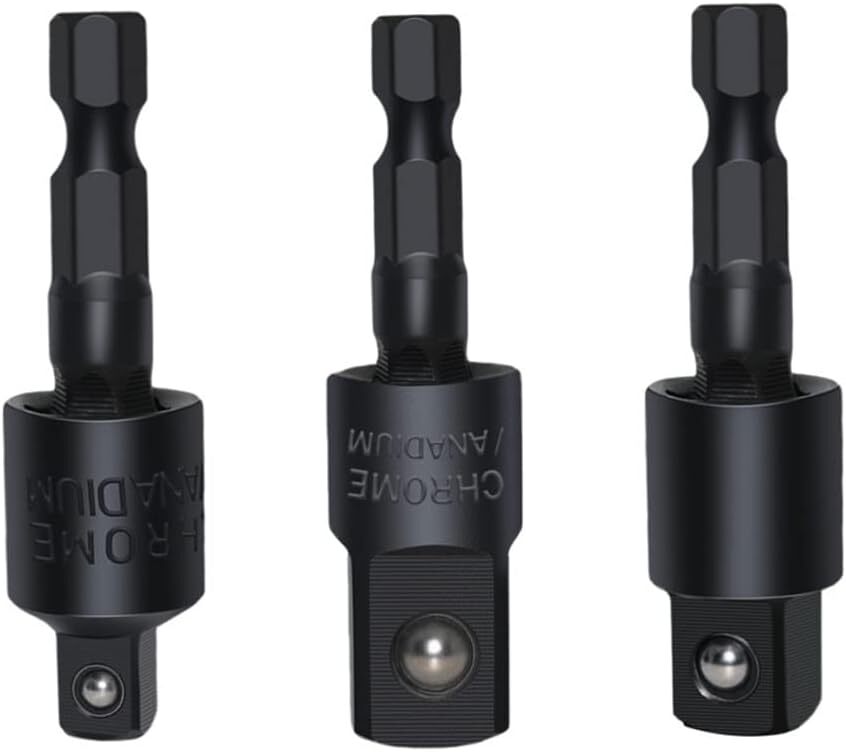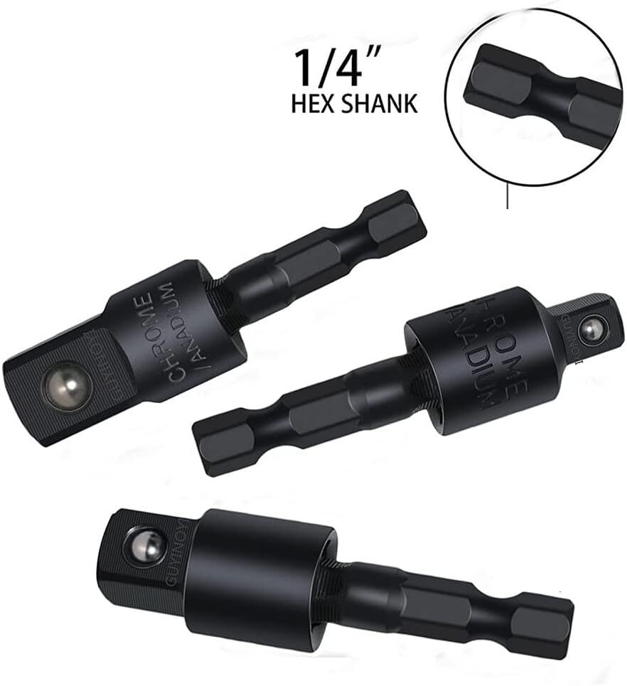 3 sizes: 1/4" hex to 1/4", 3/8" and 1/2" socket adapters. They will turn your power drill or impact driver into a versatile high-speed nut driver. Quick change 1/4-inch hex shank makes for easy, convenient bit switches and is compatible with impact ready power tools. This adapter set is designed to provide a securely locked in extension to your existing tool. Provides additional length to reach into a multitude of hard to reach spaces. The spring ball lock ensures a tight fit into the driver head to prevent slipping during use. Every adapter is embedded with a spring-loaded stainless steel tension ball to assure a quick and firm lock. The connected socket wrench will keep in place for heavy-duty work. Specification: Material: High-speed steel(HSS 4341) Color: Titanium coating Type of shank: 1/4 inch hex / 6.35mm Package includes: 1/4 * 1/4 * 65mm length -- 1/4 " shank can be converted to 6.35mm square head 3/8 * 1/4 * 65mm length -- 1/4 " shank can be converted to 9mm square head 1/2 * 1/4 * 72mm length -- 1/4 " shank can be converted to 13mm square head