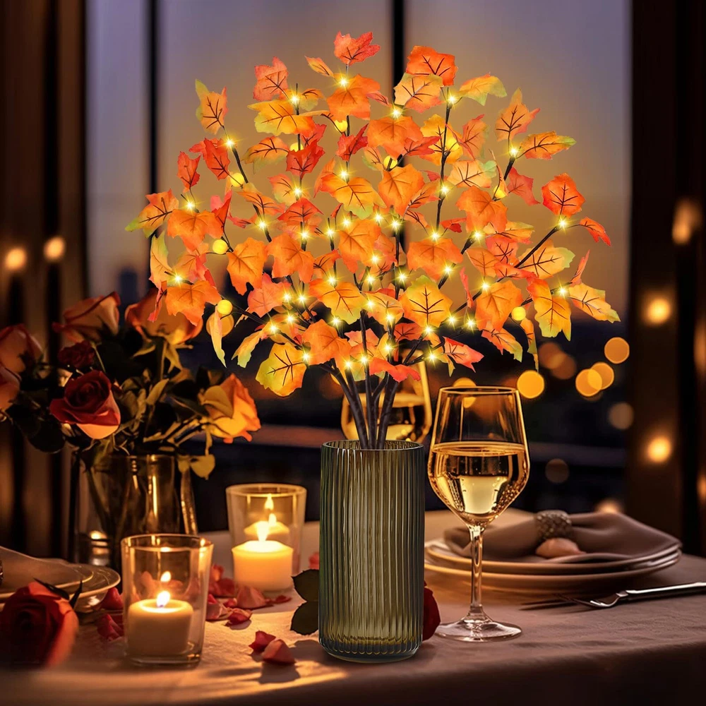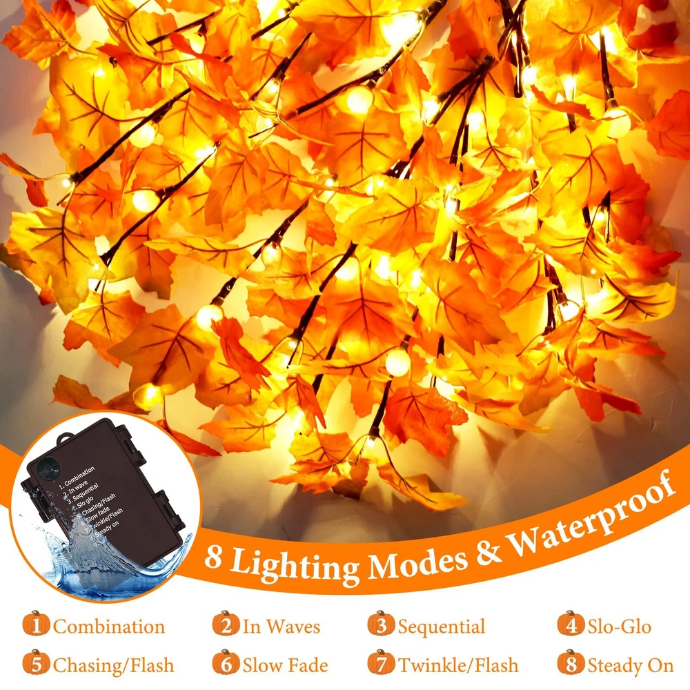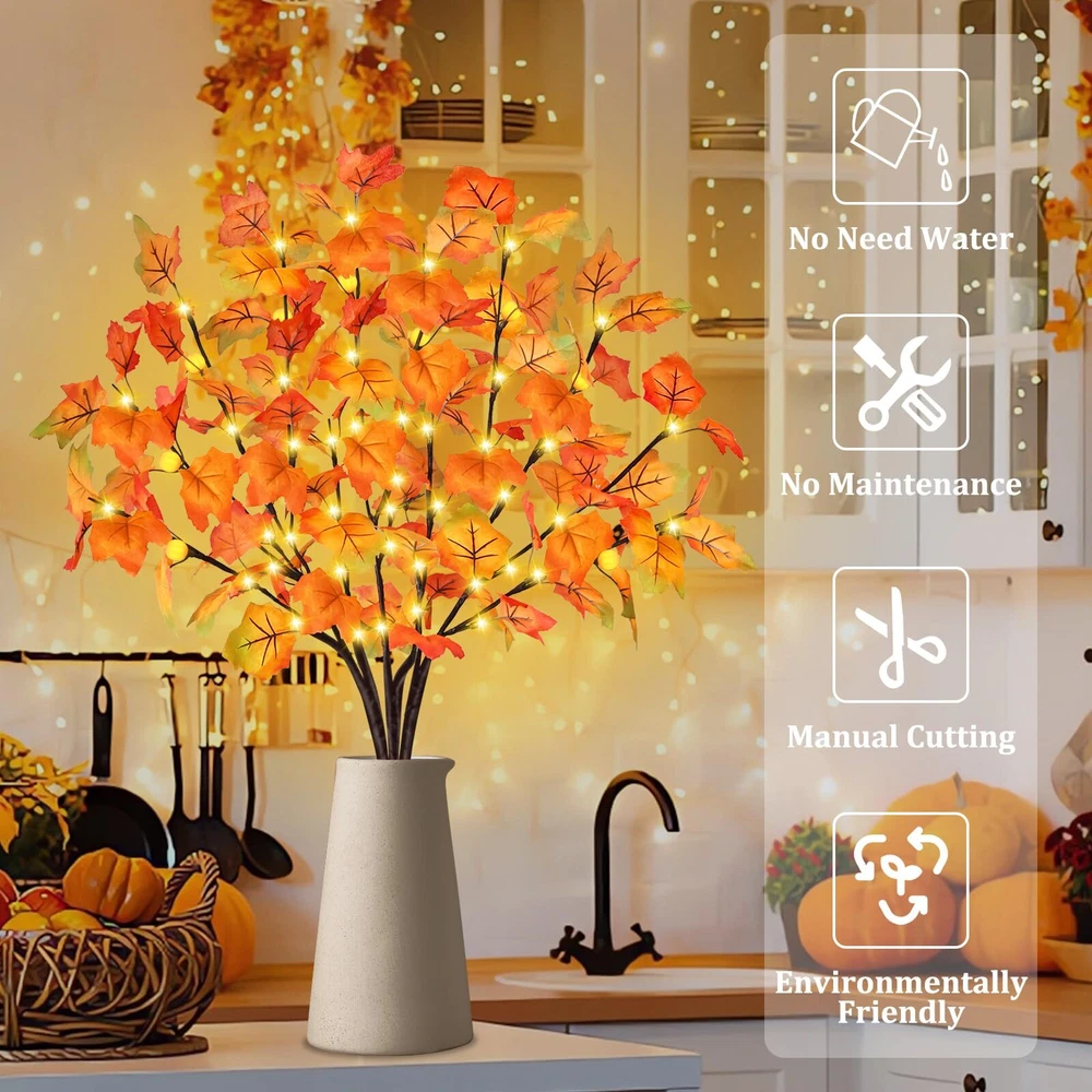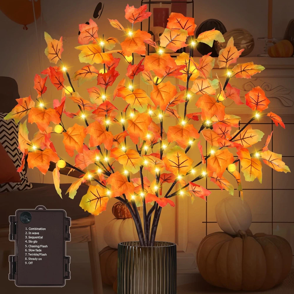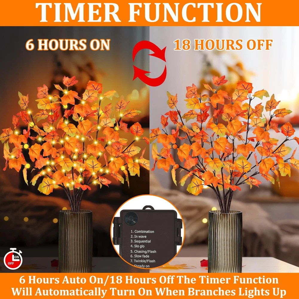 【Thanksgiving Lighted Maple Leaves Branches】You will get 3Pcs of lighted maple leaves branches, stem is about 30"/76cm in length.Lighted branches have total 60 LEDs, 120pcs maple leaves and 15 lighted LED pumpkins.Packaged in a sturdy cardboard box to keep the fall tree branches intact 【Timer & Battery Operated】Our lighted maple tree branches come with a convenient timer function, once activated, the branches will light up for 6 hours and automatically turn off for 18 hours.All 3 fall branches are connected by brown wire, non-detachable, and powered by a shared battery box, lighted branches with 60 LEDs require 3 AA battery (NOT included) 【8 Mode Lights】When you press the button on the battery box, you can switch 8 Flashing Modes: Combination,In Waves,Sequential,Slow Glow,Chasing/Flash,Slow Fade,Twinkle/Flash,and Steady On.Fill your vase with it and Immerse your home in a robust autumn atmosphere(Vase NOT included) 【Thanksgiving Centerpiece Look Real】Thanksgiving maple leaves branches decorations are made of plastic, copper wire, and silk leaves. The color of the maple leaves range from vibrant orange to red, which look like the realistic fall leaves, making for a great blend of colors to provide warm colors to any room. NOTE: due to the length of the stems, lighted stems may be bent for packaging. If leaves fall off during installation, simply reattach them to their original place 【Thanksgiving Decorations Indoor】The lifelike fall maple leaves stems creates a cozy fall ambiance, they can be used for fall dinner table decor, vase fillers, fall seasonal display or wedding party table centerpieces,Thanksgiving decorations indoor. The light is bright enough but not glaring, perfect for enhancing home interiors, weddings, hotels, fireplaces, offices, wreaths, guesthouses, gardens, parties, and seasonal celebrations like Thanksgiving and Autumn