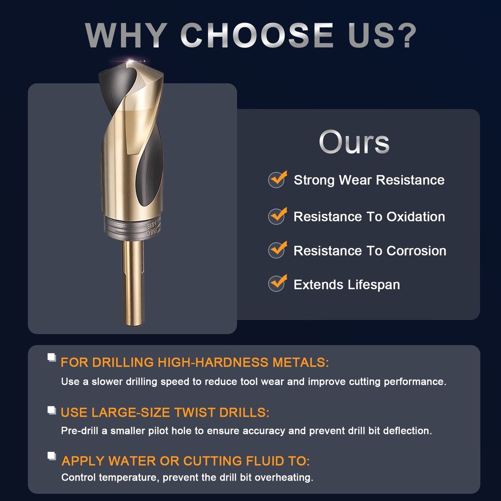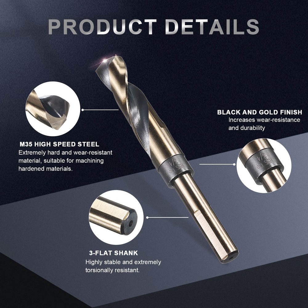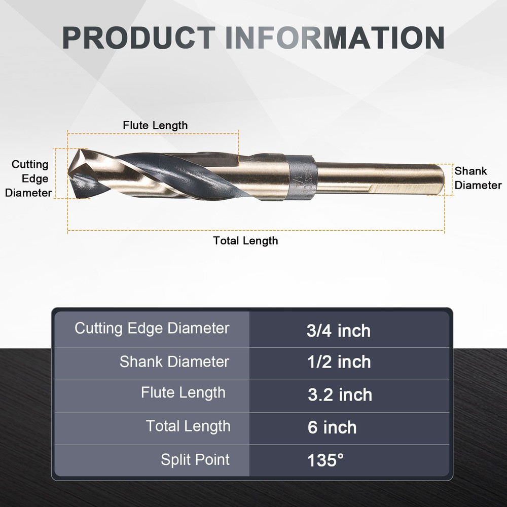 Document Handle Type:-Reduced Shank Drill Bit-The reduced shank design allows the drill bit to fit into a smaller chuck, expanding its usability.-This reduced design enables compatibility with various drilling machines, particularly portable electric drills and hand-held drills. If the drill works with hard materials, use a high-power drill or special equipment such as a drill press-Reduced Shank Drill Bit can drill a variety of materials, including stainless steel, carbon steel after heat treatment, iron, aluminum alloy, copper, wood, plastic, etc., with strong adaptability, also including auto repair, modification, appliance installation repairSpecifications:-Cutting Edge Diameter: 3/4"-Shank Diameter: 1/2"-Cutting Edge Length: 3.2 inch-Total Length: 6 inch-Split Point: 135°;Material:-The drill bit is made of M35 high-speed steel, which contains cobalt, has high molybdenum content, and features a high alloy composition. It possesses excellent red hardness and wear resistance, making it suitable for drilling various metals, including stainless steel, iron, copper, aluminum alloys, and cast iron.Surface Treatment:-The black nitriding layer formed during the nitriding process effectively resists oxidation and corrosion, making it suitable for use in harsh environments and reducing maintenance frequency, provides lubricity, while the small pore structure effectively retains coolant, enhancing the cooling effect during the cutting process and reducing wear-The oven-baked yellow surface treatment can eliminate or repair changes and damage to the material's surface.Package Content:-3Pcs x Reduced Shank Drill Bit 3Pcs 3/4" Drill Bit for Metal 1/2" Reduced Shank Twist HSS M35 Cobalt 135° Handle Type: -Reduced Shank Drill Bit -The reduced shank design allows the drill bit to fit into a smaller chuck, expanding its usability. -This reduced design enables compatibility with various drilling machines, particularly portable electric drills and hand-held drills. If the drill works with hard materials, use a high-power drill or special equipment such as a drill press -Reduced Shank Drill Bit can drill a variety of materials, including stainless steel, carbon steel after heat treatment, iron, aluminum alloy, copper, wood, plastic, etc., with strong adaptability, also including auto repair, modification, appliance installation repair Specifications: -Cutting Edge Diameter: 3/4" -Shank Diameter: 1/2" -Cutting Edge Length: 3.2 inch -Total Length: 6 inch -Split Point: 135°; Material: -The drill bit is made of M35 high-speed steel, which contains cobalt, has high molybdenum content, and features a high alloy composition. It possesses excellent red hardness and wear resistance, making it suitable for drilling various metals, including stainless steel, iron, copper, aluminum alloys, and cast iron. Surface Treatment: -The black nitriding layer formed during the nitriding process effectively resists oxidation and corrosion, making it suitable for use in harsh environments and reducing maintenance frequency, provides lubricity, while the small pore structure effectively retains coolant, enhancing the cooling effect during the cutting process and reducing wear -The oven-baked yellow surface treatment can eliminate or repair changes and damage to the material's surface. Package Content: -3Pcs x Reduced Shank Drill Bit Hot Item Payment 1.We accept eBay payment . 2.Payment must be received within 7 business days of auction closing. Shipping 1.We ship to your eBay or Paypal address. Please make sure your eBay and Paypal address is correct before you pay. 2.Items will be shipped within 1-3 business day when we received payment. 3.Delivery time depends on destination and other factors. Description Policy 3Pcs 3/4" Drill Bit for Metal 1/2" Reduced Shank Twist HSS M35 Cobalt 135° Handle Type: -Reduced Shank Drill Bit -The reduced shank design allows the drill bit to fit into a smaller chuck, expanding its usability. -This reduced design enables compatibility with various drilling machines, particularly portable electric drills and hand-held drills. If the drill works with hard materials, use a high-power drill or special equipment such as a drill press -Reduced Shank Drill Bit can drill a variety of materials, including stainless steel, carbon steel after heat treatment, iron, aluminum alloy, copper, wood, plastic, etc., with strong adaptability, also including auto repair, modification, appliance installation repair Specifications: -Cutting Edge Diameter: 3/4" -Shank Diameter: 1/2" -Cutting Edge Length: 3.2 inch -Total Length: 6 inch -Split Point: 135°; Material: -The drill bit is made of M35 high-speed steel, which contains cobalt, has high molybdenum content, and features a high alloy composition. It possesses excellent red hardness and wear resistance, making it suitable for drilling various metals, including stainless steel, iron, copper, aluminum alloys, and cast iron. Surface Treatment: -The black nitriding layer formed during the nitriding process effectively resists oxidation and corrosion, making it suitable for use in harsh environments and reducing maintenance frequency, provides lubricity, while the small pore structure effectively retains coolant, enhancing the cooling effect during the cutting process and reducing wear -The oven-baked yellow surface treatment can eliminate or repair changes and damage to the material's surface. Package Content: -3Pcs x Reduced Shank Drill Bit Hot Item Payment 1.We accept eBay payment . 2.Payment must be received within 7 business days of auction closing. Shipping 1.We ship to your eBay or Paypal address. Please make sure your eBay and Paypal address is correct before you pay. 2.Items will be shipped within 1-3 business day when we received payment. 3.Delivery time depends on destination and other factors.