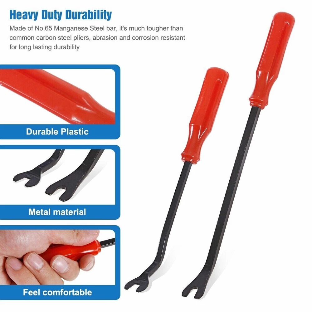 Feat ure : Fastener Removal Trim Tool : Work great for automotive interior and exterior trimming work, but also used as a bike tire remover and pushpin puller. Clip Remover Tool: Made of No.65 Manganese Steel bar, it's much tougher than common carbon steel pliers,Easy to hold in hand, effectively save effort and time, you will feel comfortable to use. Auto Trim Tools : Spring-loaded design allows quickly remove the nails, clamps, door panels, dashboards and interiors ; it will not damage your lovely car body. 2 in 1 Clip Pliers : with 1-2 mm thickness of the plier head, suitable for many types of round and square clips, fasteners and plastic rivets, easily slide into confined areas. Package Included : 3Pcs Clip Pliers Fastener Remover and a Storage Bag.