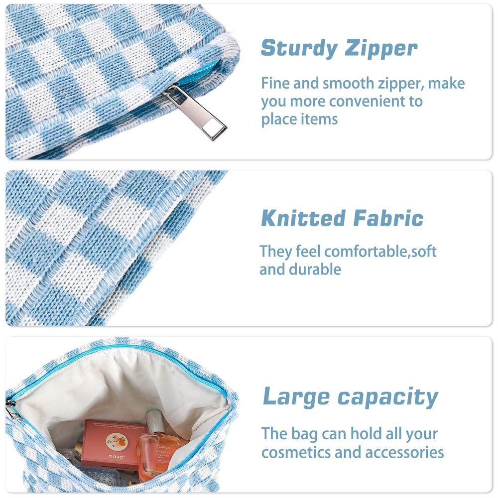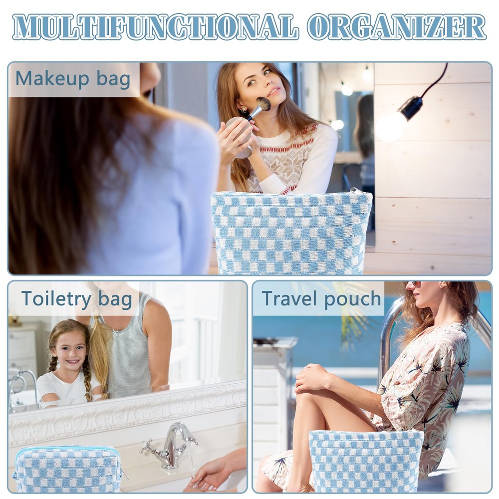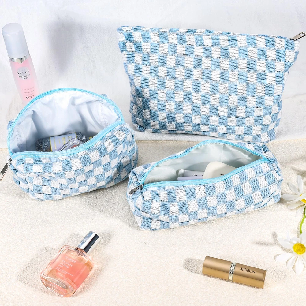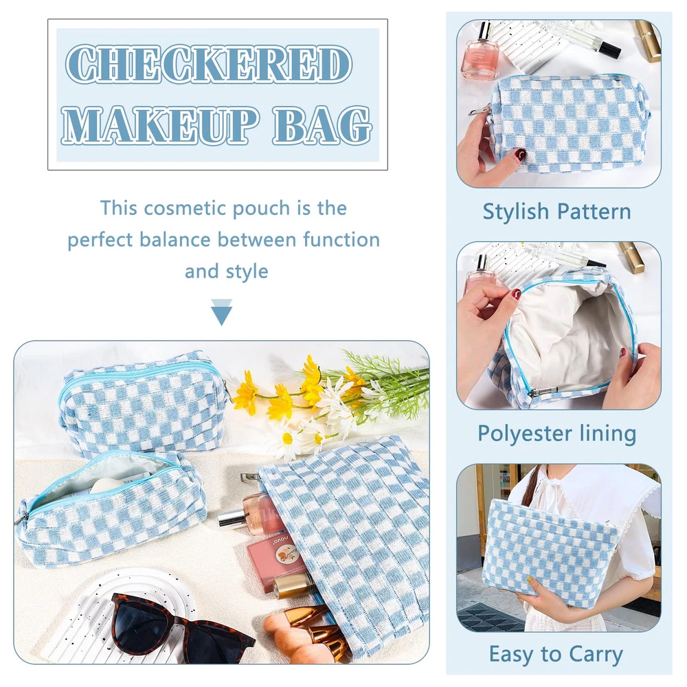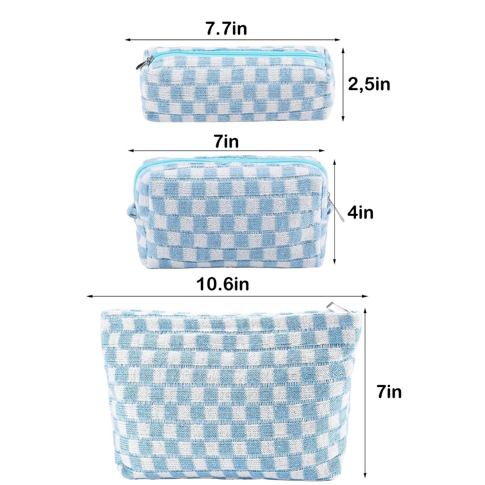 LARGE CAPACITY AND PREMIUM MATERIAL: The cute makeup bag measure 10.6×7 inches, 7×4 inches and 7.7×2.5 easy to carry. The checkered makeup bag is made of soft knitted fabric, easy to clean. This makeup travel bag can also hold small items such as makeup, skincare products, lipstick, eye shadow, eyebrow brush, etc. Makeup storage bag for women toiletries CHECKERED TRAVEL POUCH: The checkered cosmetic bag can be used as a toiletry bag or storage bag. Daily makeup, skin care samples, mobile can be put in the bag, and can also be used as a purse. The checkered makeup pouch can be used while traveling, since makeup bags are lightweight and don't take up a lot of space in your suitcase. Makeup pouches for organization FASHION DESIGN: This checkerboard makeup bag set is very cute. The unique design of the small travel bag, very fashionable, is also an ideal choice for travel.The smooth zipper closure can accommodate daily skin care cosmetics. Whether make up bags for women is a pocket bag or a single take shopping trip, our travel cosmetic bag is versatile and practical. Large makeup bag trendy. Travel toiletry bag. Cute makeup organizer LIGHT WEIGHT AND EXCELLENT WORKMANSHIP: The cute makeup pouch is made of soft knitted fabric and is comfortable, soft and lightweight. Checkered travel make up bag folds up when not in use and fits in a large bag without taking up space. The metal zipper pull keep your items secure and organized inside. Cosmetic bag accessories set for women A LOVELY GIFT: The women beauty accessories bags are perfect for everyday or travel use and are great pencil pouches, is also very suitable as a gift for your friends, family, sisters around you. The makeup pouches is the good choice for kids, can be used as pencil case or pencil bag. Large medium small makeup bag. Pouch bags for women ,makeup bag gift for girls