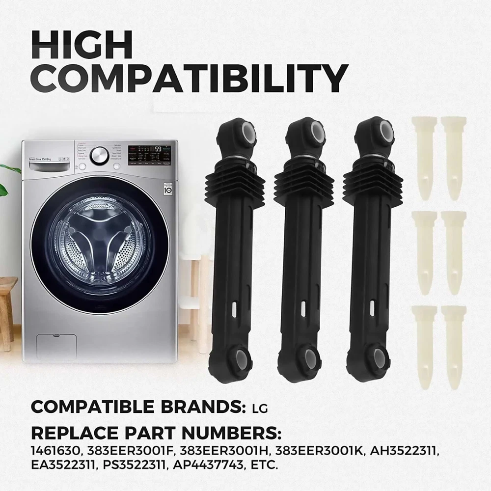 SAFE & SECURE SHOPPING 100% SATISFACTION GUARANTEED FAST SHIPPING Store Categories Store Categories You may also like 3Pcs Washer Shock Absorber Replacement Part For LG Washing Machine 383EER3001G Product Description Features: Easy installation and replacement: Designed with user convenience in mind, the shock absorber rod replacement parts feature standardized sizes and a simple installation structure, enabling home users to effortlessly complete the task without professional skills. This significantly shortens maintenance time and reduces installation difficulty. High durability: Crafted from high-strength, high-elasticity materials, the premium shock rod replacement parts withstand intense vibrations and long-term loads during washing machine operation, effectively prolonging the service life. This durability ensures a stable working condition for an extended period, minimizing inconvenience and costs associated with frequent replacements. Improved shock absorption: In comparison to aging or damaged shock rods, the new replacement parts excel at absorbing and dispersing vibrations and noise generated during washing machine operation. This safeguards internal components from damage while diminishing laundry-related noise, fostering a quieter, more comfortable living environment. Enhanced stability and safety: Maintaining the shock absorber rod's optimal condition is crucial for the washing machine's overall stability. Replacing worn-out shock rods significantly enhances the machine's balance, minimizes shaking and displacement, and prevents it from tipping or moving at high speeds. This, in turn, strengthens usage safety and safeguards the wellbeing of family members and the home environment. Specifications: OE Reference: 383EER3001G, ACV72909503, ACV72909501 Color: Black Quantity: 3pcs Replace: 383EER3001G, 383EER3001J, 4901ER2003A, 383EER3001F, 383EER3001H, 1461630, 383EER3001K, AH3522311, EA3522311, PS35222311, AP4437743, 1335104, AP5226074, PS3583320, Compatible: For LG Package Included: 3 x Washer Shock Absorbers 6 x Mounting Pins Shipping Returns Contact Us Payment Shipping We ship most of our orders within 24 hours, and may up to 48 hours. If you want faster shipping way, please contact us before making a payment. Sometimes due to problems with our transportation company system, your shipping information may be delayed to update. We recommend that you try again after 3-4 days. If you still haven't checked the shipping information, you can contact us via ebay message. Returns 1. 30 days warranty from the purchased date. Please contact us via email before returning the defective item. 2.Our warranty does not extended to any product that are physically damaged or that are not under normal operating conditions as result of misuse or improper installation on the buyer/user's part. 3.Return items should include the original packaging and all accessories. buyers MUST contact us for the returning address. 4.In all cases, buyers pay shipping fees at their own cost to return products for exchange or refund. We will be responsible for the postage of replacements. Refund will be made upon receipt of the returned item. Contact Us Pls contact us if you have any problems,we will try our best to solve for you Payment We accept all verified payment from eBay. Copyright © 2022 Tongtool