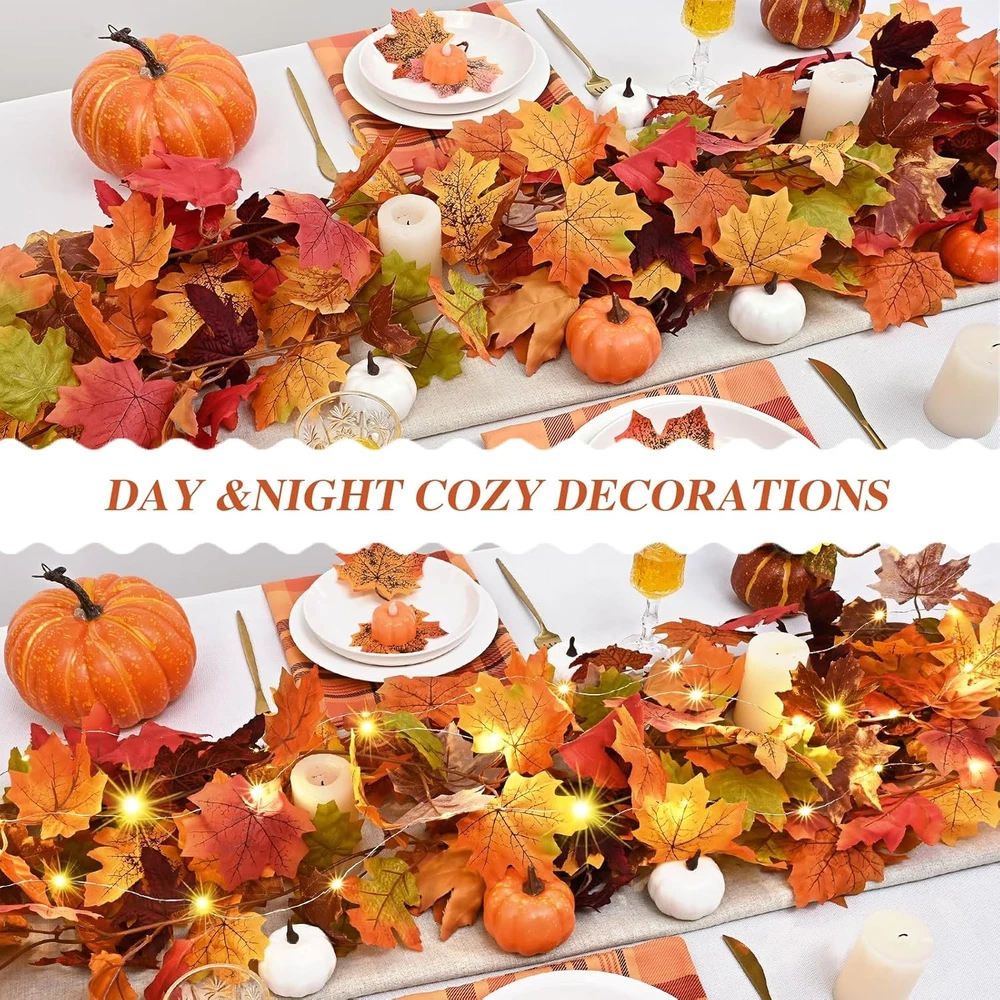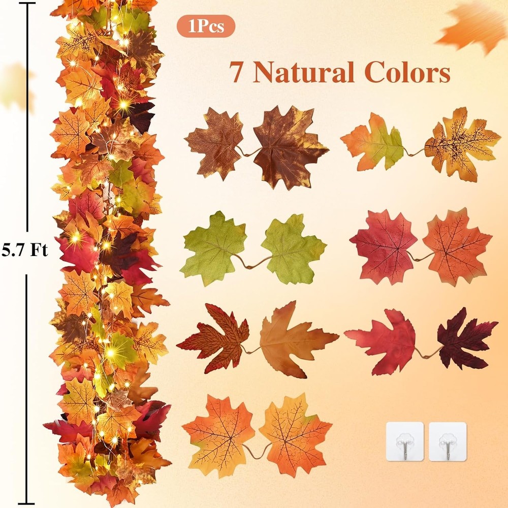 3Pcs Fall Garland with Lights, 17Ft Leaves for 3 Pcs, Orange LuxeFusion Product Description Features 【Elevate Your Fall Decor】Elevate your fall decor with our exquisite fall garland with lights! Each set includes 3 pcs fall garlands, measuring a total length of 17ft, along with a one 16ft string of lights. Easy to hang with two adhesive hooks included and loop on the end of garland. Appreciate the beauty of fall decor whether day or night. 【Pre-lit Lights Included】3 Pcs set with one string of light, which adds creativity to the fall garland. The power supply requires 3 AA batteries (not included). 2 lighting modes as twinkling and steady on to create the perfect ambiance. The warm and cozy glow combined with the vibrant colors of the fall leaves garland will instantly transform your space into a haven of comfort and relaxation. 【Realistic Design】Our fall garland features lifelike maple leaves in a beautiful mix of autumn colors. The fall leaves in 7 different colors captures the essence of the fall season, the realistic and intricate design of the maple leaf vine brings the beauty of nature indoors, creating a warm and inviting atmosphere in your space. 【Durable & Delicate】The maple leaves on fall garland are crafted of delicate silk , ensuring a durability and realistic feel, while the branches are made of high-quality elastic plastic,making them flexible and easy to shape. Unlike real leaves that wither, embrace the eternal beauty of our Thanksgiving decorations. 【Perfect Thanksgiving Decorations】Whether you want to adorn your mantels, staircases, doorways, windows, and even as a table centerpiece, the fall garland can be easily shaped and draped to fit any area, making it a versatile decoration option. Also suitable for weddings, Thanksgiving events or wherever you choose to use it to bring a rustic and romantic touch to the occasion. Product Details Manufacturer: Waipfaru Package Dimensions: 9.02 x 6.14 x 4.02 inches Item Weight: 12.6 ounces Country of Origin: China Item model number: Orange Brand: Waipfaru Color: Orange Material: Vinyl Size: 3 Pcs Shape: Runner Free Shipping All orders ship free and fast to your doorstep. Easy Returns Satisfaction guaranteed. 30-day returns, no questions asked. 24/7 Support Contact us anytime; we’re here to help, day or night. Brought to you by LuxeFusion – Quality you can trust.
