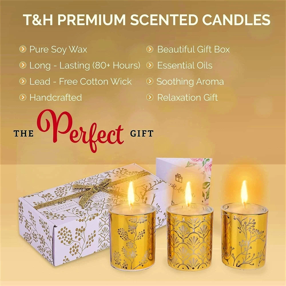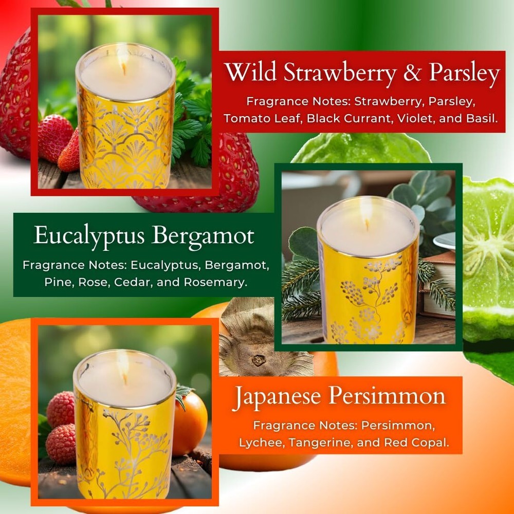 Aromatherapy Candle Gift Set of 3 | Strawberry Parsley, Persimmon, Eucalyptus Bergamot Holiday Scented Candles Set, Gold Candles Gift Set, Relaxing Candles for Women Stress Relief Small Soy Candles 🕯️ Gold Candle Gift Set: Our 4.25 oz candle gift set of 3 will fill your room with uplifting scents of Wild Strawberry and Parsley, Japanese Persimmon, and Eucalyptus Bergamot essential oils. These sweet, sensuous, earthy fragrances will evoke a sense of comfort and indulgence to perfectly match the mood of every season. Made from 100% natural soy wax, essential oils, and cotton wicks. Hand poured into gold votive candle holders. 🏡 Small Candles for Home Scented: Using aromatherapy candles in your home is a simple, but effective way to influence the mood of a room and create a harmonious environment. One of our favorite ways to enhance the aesthetic is by adding small, beautiful candles with a relaxing fragrance and warm glow. 🎁 Stress Relief Candles Gifts for Women: Our aromatherapy candle gift set includes captivating aromas that provide a warm and harmonious glow for a stress free ambiance. These beautiful, scented candles arrive securely packaged in a signature gift box with greeting card, complete and ready for gift giving! 😌 Aromatherapy Candles for Relaxation: Highly scented, yet beautifully subtle, these sensuous, earthy fragrances of Wild Strawberry and Parsley, Japanese Persimmon, and Eucalyptus Bergamot will transform your home to instant Zen. Allowing you to unwind, relax, and enjoy the present moment. 💛 Natural Essential Oil Candle Set: Pamper yourself and experience natural stress relief with our soy wax candle set derived from plants, flowers, fruits, and herbs. Clean burning and soot free, so you can indulge your senses. The first burn is most important and must be long enough to fully liquefy the wax to the edge of the jar. This can take 1-2 hours for our gift set candles, so please be patient, relax, and enjoy! Shipping We offer FREE shipping on all orders! We ship within Three business days of payment, usually sooner. We use a selection of shipping services such as UPS, FedEx, USPS etc. We only ship to the lower 48 states, no APO/FPO addresses or PO Boxes allowed. Local pickups and combined shipping options are not provided at this time. International buyers – please note: Import duties, taxes, and charges aren't included in the item price or postage cost. These charges are the buyer's responsibility. Please check with your country's customs office to determine what these additional costs will be prior to bidding or buying. Order Cancellation Policy * Order Cancellation Policy ** You can return a product for up to 30 days from the date you purchased it. 1. The seller reserves the right to cancel the special case only due to eBay cancellation fee. 2. The decision of seller is the final. 3. The seller will respond to the cancellation request within 2 business days. Please wait for the result of cancellation. 4. In case the cancellation is not completed by some reasons, the buyer can follow the options below to get the refund. 4.1 The buyer can reject the item when it arrives. 4.2 The buyer can send the item back to the seller within 30 days If the buyer receives item (USA Shipment ONLY). The seller will provide the FREE return label to the buyer when the buyer opens " Return Item" case on eBay by using the reason as "Change my mind" ONLY. 5. When buyer has placed the order. The order will be processed and completed by automatic warehouse system within 5 minutes. In case that buyer sends the cancellation request after 5 minutes of placing the order, the request will be rejected. **Sending direct message to cancel the order is not allowed for every case.* Return Policy - If buyer would like to return the items for refund or replacement, please CONTACT SELLER to receive the free return label from seller. The refund or replacement will be processed with the tracking number of return label which is provided by seller only. The other ways of return which are not approved by seller will not be processed for the refund or replacement. Return You can return a product for up to 30 days from the date you purchased it. Any product you return must be in the same condition you received it and in the original packaging. Please keep the receipt. Payment We accept payment by any of the following methods: eBay Payments Please pay as soon as possible after winning an auction, as that will allow us to post your item to you sooner! Feedback Customer satisfaction is very important to us. If you have any problem with your order, please contact us and we will do our best to make you satisfied. Contact Us If you have any queries, please contact us via ebay. We usually respond within 24 hours on weekdays. Please visit our eBay store to check out other items for sale! Thank you for shopping at our store.