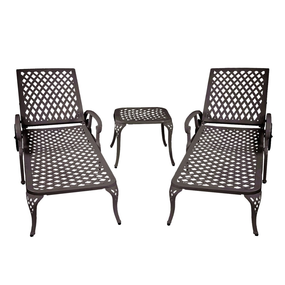 As an elegant and classic touch to your outdoor space, this cast Aluminum Chaise Lounge combines the appearance, function and quality all together, offering you with the best experience. When having a conversation, reading a book, or just simply enjoying the sun, this deep seating outdoor lounge help you sink in comfort and style. Whether in backyard, patio, deck or garden, you'll enjoy this piece for years to come. Elegant choice: cross weave design, hardened antique bronze powder coating in details, cast aluminum frame with zero air pollution coating, odor-free Constructed with solid cast aluminum for durability, wide-leg stance for stability, 2 wheels for easy portability Reclining function: 3 backrest tilting positions to select, 120° for reading, 150° for relaxing and 170° for Free Shipping Over $49.99* Details 3-Piece Aluminum Reclining Outdoor waterproof Chaise Lounge with Wheels And Product Description: As an elegant and classic touch to your outdoor space, this cast Aluminum Chaise Lounge combines the appearance, function and quality all together, offering you with the best experience. When having a conversation, reading a book, or just simply enjoying the sun, this deep seating outdoor lounge help you sink in comfort and style. Whether in backyard, patio, deck or garden, you'll enjoy this piece for years to come. Elegant choicecross weave design, hardened antique bronze powder coating in details, cast aluminum frame with zero air pollution coating, odor-free Constructed with solid cast aluminum for durability, wide-leg stance for stability, 2 wheels for easy portability Reclining function3 backrest tilting positions to select, 120° for reading, 150° for relaxing and 170° for napping Adjustable foot pads to deal with the uneven ground high quality material of cast aluminum with much better weight capacity, compared with wicker or wooden chaise lounges Weather proofeasy to care for with protective antique copper finishing, UV and rust resistance, years to enjoy without corrosion damage Easy to movewheels for improved mobility Included 2 chaise lounge chairs And 1 Table Assembly is required