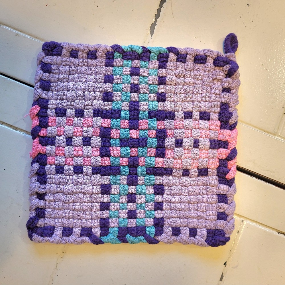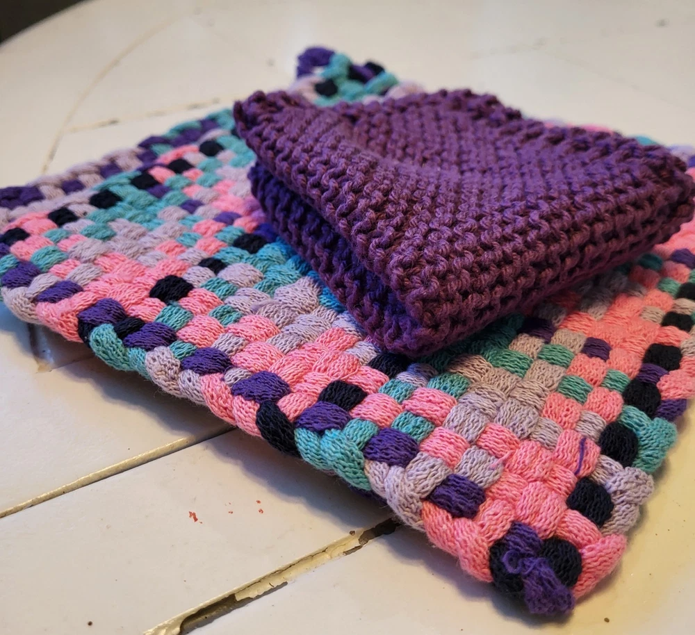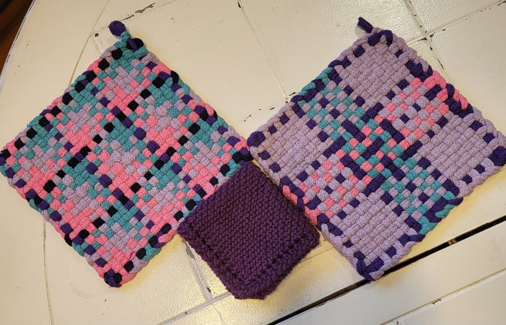 Add a touch of spring to your kitchen with this set of 2 handmade purple, pink, and turquoise woven potholders and 1 purple dishrag. Made from cotton, these traditional-style kitchen accessories are perfect for Easter and multipurpose use.