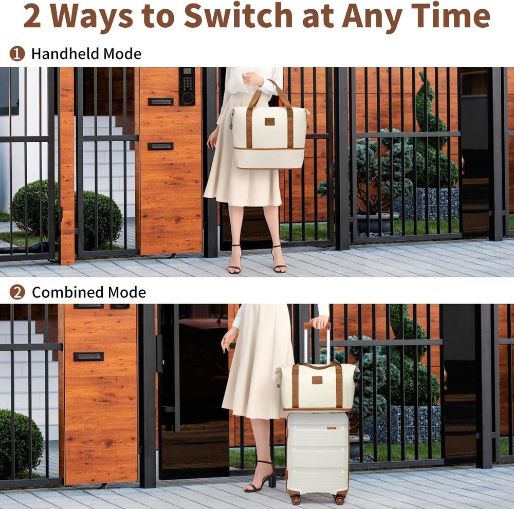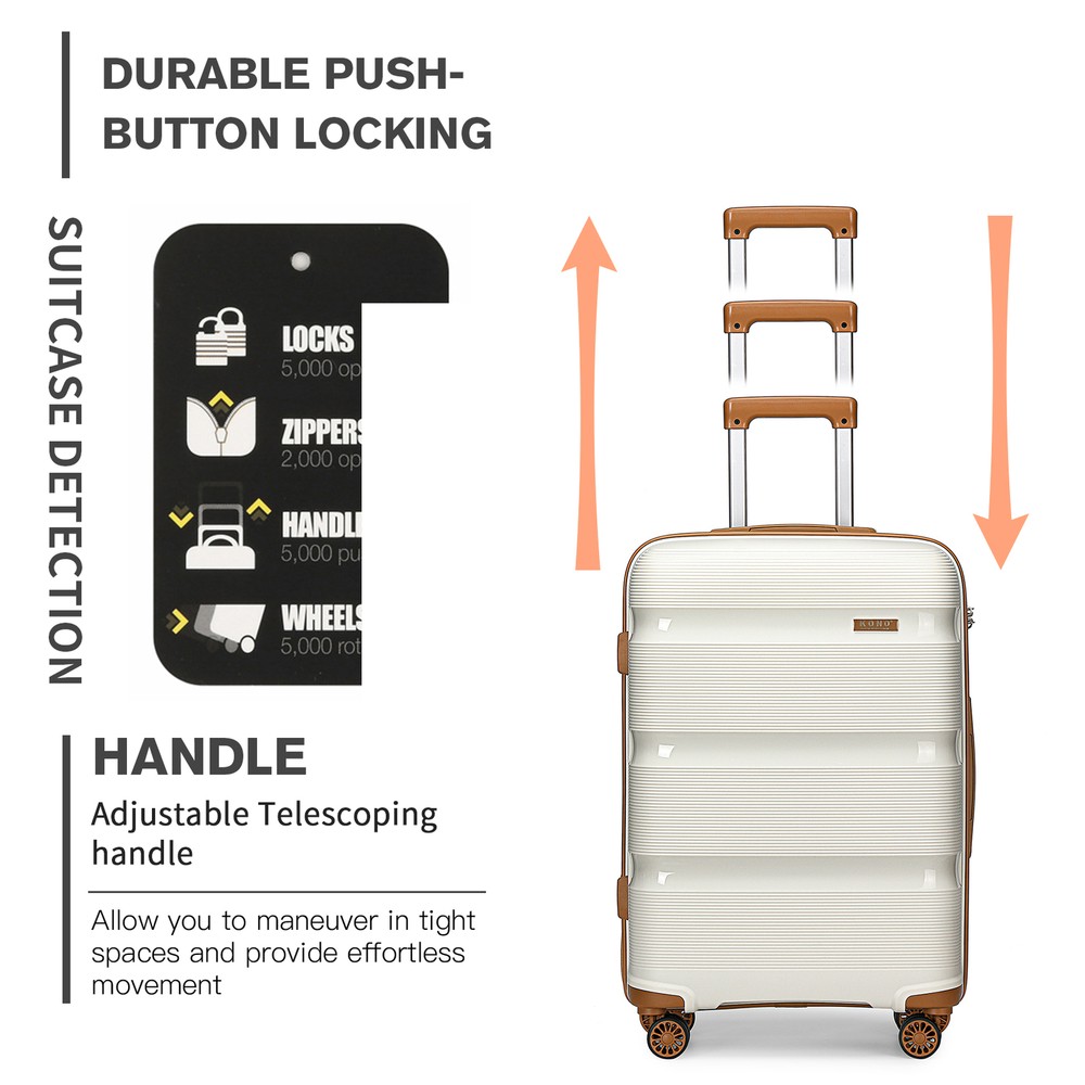 This set is perfect as it will cover you whether you are going on a city break or a sunny holiday. Material: Outer material: strong and durable ABS (Acrylonitrile Butadiene Styrene) Inner lining: polyester Aluminium telescopic handle Silver-tone metal hardware - YKK zippers Wipe clean only Size: 20 inch - 51.5cm(H) * 38cm(W) * 21cm(D); 2.465kg, approx. 44 litres 20 inch suitcase is cabin friendly - always check with your airline as cabin luggage dimensions can differ. Bag: 40cm(L) * 22cm(W) * 30cm ~ 42cm(H) / 15.7"(L) * 8.6"(W) * 11.8" ~ 16.5"(H); 0.64kg Top handles - 18cm high Clutch bag: 22cm(L) * 9cm(W) * 12cm (H) /8.6"(L) * 3.5"(W) * 4.7"(H); 0.11kg All measurements are external, internal measurements may differ approx 1-2cm. Color: Cream Features: 【2-Year Warranty for 3-Piece Luggage Sets】 Dimensions include a 21.7" x 15.7" x 8.3" carry - on suitcase, a 15.7" x 11.8" x 8.7" weekender bag, and an 8.6" x 4.7" x 3.5" toiletry bag. Tailored for stylish leisure travelers, weekend adventurers, and short - term business commuters. Our 2 - year replacement guarantee covers all manufacturing flaws. 【Hard - Shell Suitcase and Waterproof Travel Bag Combo】 The Kono suitcase, crafted from lightweight yet durable polypropylene hard shell, resists scratches and pressure. The travel bag, made of waterproof nylon fabric, ensures your items stay safe and dry even in wet weather. 【TSA Lock and Smooth Gliding 360° Spinner Wheels】 Ideal for international trips, the TSA lock allows agents to inspect without lock damage. The suitcase's silent 360° swivel twin wheels enable quiet and easy movement through crowded airports or train stations. 【Expandable Duffel Bag for Added Capacity】 This duffel bag expands for extra packing room. A bottom zipper instantly boosts its capacity. A small strap lets you attach it to your suitcase handle, freeing your hands for a more enjoyable journey. 【Multi Purpose and Flexible Combinations】 The 3 - piece luggage set with a carry - on bag can be arranged according to your needs and trip duration. Perfect for travel, weekends, sports, and social gatherings. The bags can be nested for space - saving storage. How to set the code: All locks are preset to '000', to change this you need to press the reset button (with a pen or toothpick). Change the three numbers to your desired code. Let go of the reset button and now the code is set. Make sure it is something memorable for you but not too simple.