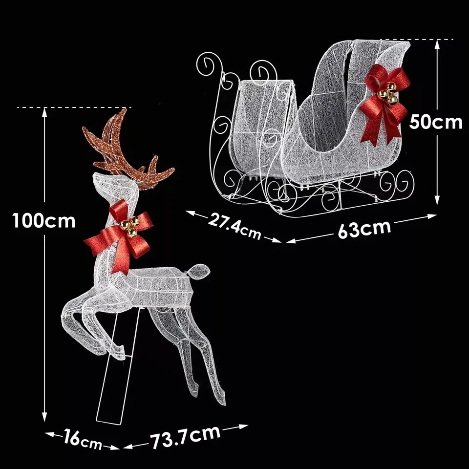 Product Description:- Introductions: This charming 3-Piece Lighted Set of 2 Reindeer & Sleigh is the perfect addition to your holiday décor. Featuring two reindeer pulling a santa's sleigh, this set is beautifully adorned with festive bowknots and sparkling glitter, capturing the magic of the holiday season. With its durable, weatherproof design and warm LED lights, it adds a cozy, enchanting glow to any indoor or outdoor space. Easy to assemble and store, this reindeer set will bring joy and festive cheer to your home year after year. Features: 1. Charming Reindeer & Sleigh Set: This delightful set features two reindeer pulling a santa's sleigh, each detailed with a festive bowknot and glistening glitter for added holiday sparkle. Loved by both kids and adults, this reindeer and sleigh set is sure to bring warmth and festive joy to your outdoor or indoor Christmas decorations. 2. Eye-Catching LED Lights: Pre-lit with 270 white LEDs, these reindeer glow beautifully in the night, creating an inviting holiday atmosphere. The well-placed LED lights make the reindeer a stunning focal point for your Christmas display, both day and night. 3. Weather-Resistant and Sturdy Build: Made from a durable, rustproof metal frame with waterproof fabric, the reindeer set is built to withstand wind, rain, and snow. The included ground stakes provide extra stability, ensuring your decorations stay secure in winter weather. 4. Easy Assembly & Storage: This collapsible reindeer set can be set up in minutes, allowing you to enjoy your festive display without hassle. The lights are pre-installed, simply connect the wires and plug them in to watch them come to life. 5.Perfect Holiday Decor for Indoor & Outdoor: Whether placed indoors near your Christmas tree, on the porch, or outdoors in the yard, this lighted reindeer set enhances any holiday setting. Perfect for holiday parties, weddings, or as a festive yard display, these reindeer bring elegance and a joyful touch to your celebrations. Specifications: 1. Overall Dimensions: (83 x 10.8 x 39.4) in / (211 x 27.5 x 100) cm 2. Number of Lights: 270pcs 3. Light Color: White Package Includes: 1 x 2 Reindeer & Sleigh Set 1 x Set of Ground Stakes