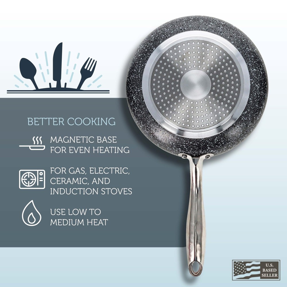 Evenly cook an omelet or fry steak tips with the Potted Pans 3 Piece Non Stick Frying Pan Set. Constructed of pressed aluminum and coated with a marble splatted glaze creates a non-stick surface on these frying non stick pan skillets. Ergonomic stainless steel handles stay cool to the touch for comfortable use and to beautifully compliment your breakfast stone pans. 2.3mm heat inducing base ensures even heating to precise temperatures for easier cooking. Use on your gas and electric stove. 8, 9.5, and 11-inch frying pan nonstick set provides optimal sizes for day to day cooking. Nonstick surface makes it easy and quick to clean after any meal. Simply rinse and wipe with a towel. Warning: This product can expose you to chemicals which is [are] known to the State of California to cause cancer and birth defects or other reproductive harm. [A Pan for Every Part of Your Meal]: Whether cooking eggs and large pancakes or frying up steak and sauteing vegetables, the Potted Pans Marble-Coated Stone Cookware Set has 3 sizes of nonstick frying pans to meet your needs [Excellent Heat Transfer]: Magnetic conductive base on small frying pan nonstick skillet pan ensures quick and even heating; Compatible with electric, ceramic, and gas stoves and induction cookers [Non Stick Surface]: Marble-coated aluminum construction prevents food from sticking while you cook; Use on low to medium heat with minimal oil; Cleans easily with water [Perfectly Sized Cooking Pans]: Small 8-inch (20.3cm) wide nonstick pan has an internal 1.6 by 7.8-inch (4.1 x 19.8cm) size; 9.5-inch (24.1cm) pan has an internal 2 by 9.4-inch (5.1 x 23.9cm) size; Large 11.1-inch (28.2cm) pan has a 2 by 10.9-inch (5.1 x 27.7cm) internal size [Built to Last]: Pressed aluminum pans and stainless steel handles keep your fry pans lightweight for easier use when cooking; Long handles are securely connected to the pan for solidity
