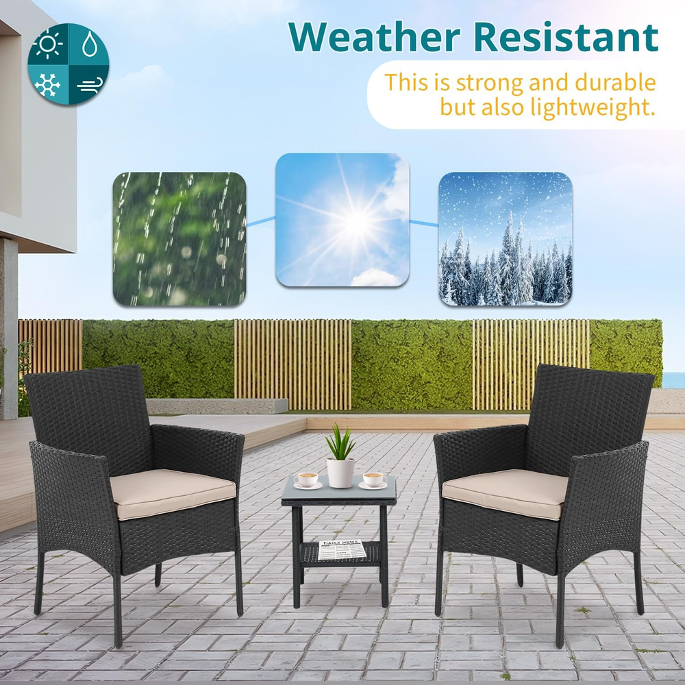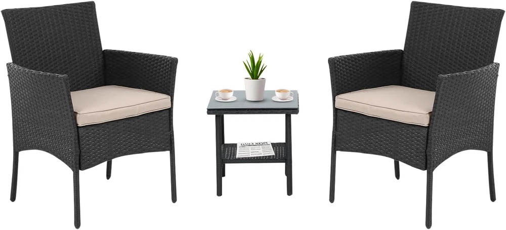 『Excellent Stability & Durability』: This front porch furniture is equipped with non-slip feet pads to protect your floor and make the balcony furniture more stable. Thanks to bottom of the chair has Ten-shaped brackets, the whole chair has a large load-bearing capacity. Small patio furniture set is made of excellent PE rattan and strong steel frame, which are not easily deformed or corroded thus the furniture set can be used for long time. 『Comfortable & Convenient』: Soft sponge-filled seats give you extra comfort, Conversation Sets gives you a excellent seating experienceand,the covers can be removed for easy clean and maintain. Toughened glass is strong and light, which can be swabbed or washed with water. 『Ergonomic Outdoor Chair』: This outdoor patio chairs are ergonomically balanced with backs for extra lumbar support, and comes with two wicker chairs and a coffee table. The curve of armrest on the both side, comfortable and skin-friendly support, fits your body line. You can put some drinks or snacks on the table, and then sit down to enjoy the cozy life. 『Best for Outdoor Living』: The all-weather wicker with a nature look is suitable for using in all seasons. The combination of two chairs and a table is perfect for close conversations. Premium lightweight rattan makes it easy to move this outdoor seating from patio to lawn or from backyard to garden. 『EASY ASSEMBLY』: This Outdoor Furniture Set Comes With All Hardware & Necessary Tools. Follow The Instruction, You Can Easily And Quickly Assemble The Bistro Set.NOTE: When you try to install the patio bistro set, try to line the hole together in all side, do not over tight one hole, then try to tight it slowly in each side What We Offer: A new 3 pieces patio furniture sets, Complete installation tools, An installation instruction, Our worry-free 6-month after sale service and Friendly customer. Product Description The table in the patio set is made of high-quality tempered glass,Our Outdoor Patio Wicker Sets all kinds of outdoors. Style and settings, convenient storage, save space.This patio set is designed to be modern and stylish with a low-maintenance feature. Our rattan set includes two comfortable chairs and a table with tempered glass. This set is elegant and very well matched. It is suitable for balcony, garden, teahouse, living room, etc. Product Specifiacion Package included: 1 x Tempered Glass Top Coffee Table 2 x Rattan Chair 2 x Thick Cushion Rattan Chair Dimension: L20"*W18.89"*H32.28" Table Dimension: L15.75"*W15.75"*H16.93" Table with removable tempered glass adds allows you to places drinks,meals,or decorative items on top. The 2-inch seat cushion brings you a more comfortable experience, and the zipper design makes regular cleaning easier. Strong non-slip table legs and chair legs can protect the floor and maintain stability Patio chairs 3 piece set is made of excellent PE rattan and strong steel frame, which are not easily deformed or corroded thus the furniture set can be used for long time. Quality manufacturing, unique craftsmanship, cross-shaped table and chair frames are stronger The chair is not only lightweight, but also has a super load-bearing capacity of 200 pounds.