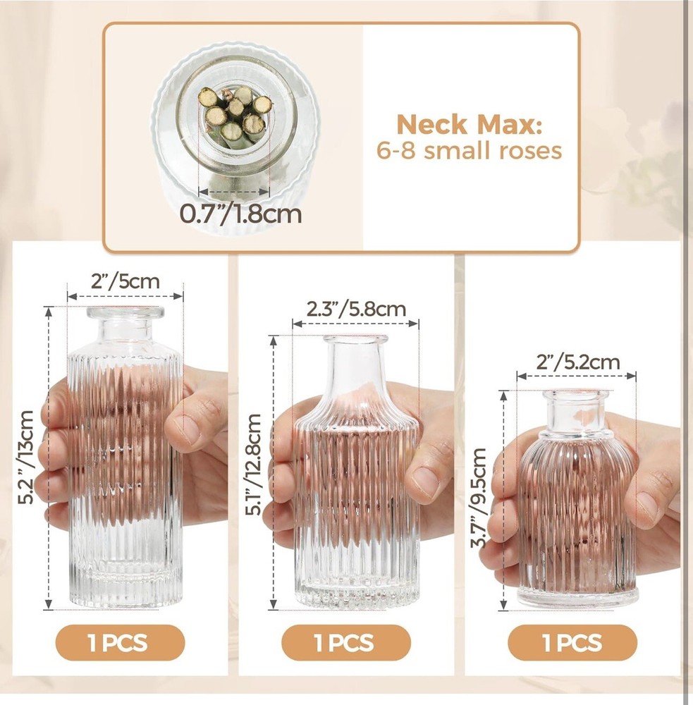 The Glass Bud Vases Set of 3 features small ribbed vases in a vintage Style-2 design. Suitable for various occasions like Christmas and weddings, these clear glass vases are perfect for home decoration. With a round shape and recommended use as a vase, they are ideal for displaying flowers in rooms such as the bathroom, living room, bedroom, home office, or dining room. Lot E