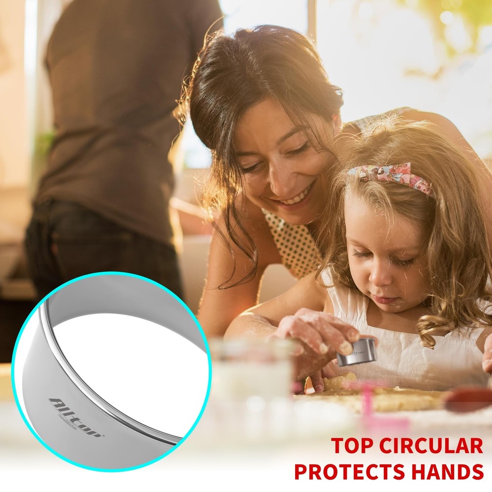 Experience the joy of baking with the Cookie Cutters Set – a premium collection of stainless steel baking tools designed to elevate your treats to new heights. Crafted from 430 stainless steel, our biscuit cutter set guarantees durability and longevity, outlasting flimsy plastic or ceramic alternatives. Oven and freezer safe, these cutters open up a world of baking possibilities. With three different sizes included, you have the flexibility to create cookies and treats of varying dimensions. The smooth weld seams and rolled top edges ensure a safe cutting experience, minimizing the risk of accidents while effortlessly gliding through dough. Beyond biscuits, our cookie cutter set shines in a multitude of baking applications. From round cookies and small cakes to cheese-cakes, chocolate decorations, donuts, crumpets, tarts, and more, this versatile tool unlocks your creativity in the kitchen. Cleaning up is a breeze with these dishwasher-safe cookie cutters. Bid farewell to tedious hand washing and save valuable time and effort. To maintain their pristine condition, it's advisable to dry them promptly after washing, preventing rusting and maximizing their lifespan. Trust for premium quality baking tools that deliver exceptional results. Elevate your baking game with the Cookie Cutters Set today and let your imagination soar in the kitchen! Premium Quality Materials: Crafted from durable 430 stainless steel, our biscuit cutter set ensures long-lasting performance and won't break like plastic or ceramic cutters. Safe to use in the oven and freezer, these cutters will be your trusted baking companions for years to come. Versatile Set with 3 Sizes: This set includes three round cookie cutters in varied sizes, catering to all your personalized baking and cooking needs. The diameters are 2.95 inches, 2.55 inches, and 2.15 inches, with a height of 1.3 inches. Safe and Easy to Use: The rolled top edges and smooth weld seams of these biscuit cutters provide a safe cutting experience, keeping your fingers protected while effortlessly slicing through sticky dough. Say goodbye to sharp and dangerous edges! Multi-purpose Baking Tool: Beyond biscuits, our cookie cutter set is ideal for creating perfectly round cookies, small cakes, cheese-cakes, chocolate decorations, donuts, crumpets, tarts, and more. It's a truly versatile tool that enhances your dessert preparation process. Hassle-Free Cleanup: No more tedious hand washing! These dishwasher-safe cookie cutters save you valuable time and effort. For optimal longevity, it's recommended to dry them immediately after washing to prevent rusting and extend their service life.