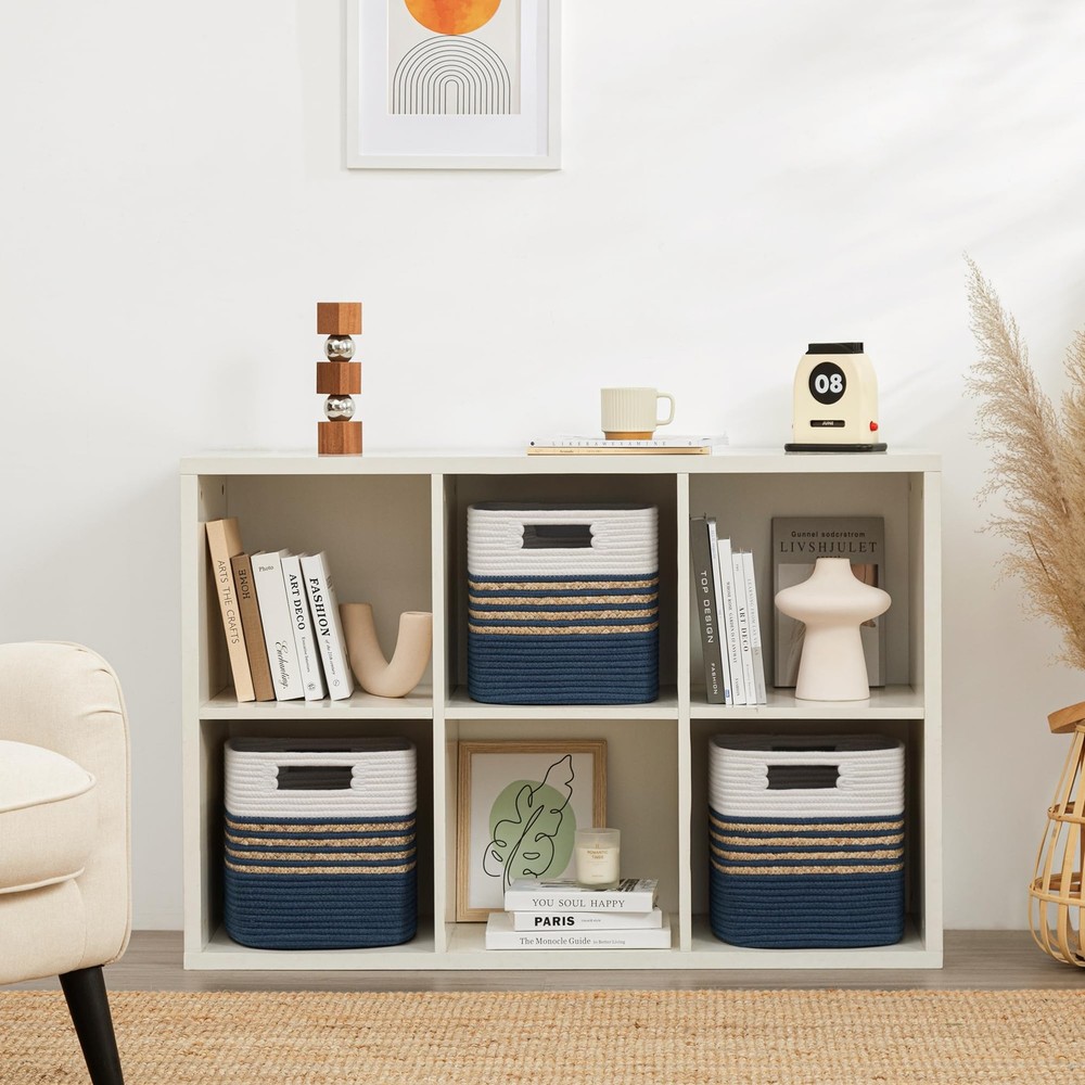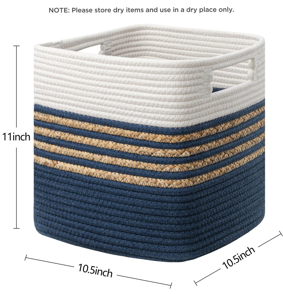 3-pack storage baskets are made of natural cotton ropes and water hyacinth which has no chemical smell, soft and also has no sharp edges. They are hand-woven to be durable and sturdy, ensuring years of use. Soft & Safe Materials: Our 3-pack storage baskets are made of natural cotton ropes and water hyacinth which has no chemical smell, soft and also has no sharp edges. They are hand-woven to be durable and sturdy, ensuring years of use. Special Design: The special design of combining the premium thick cotton ropes with water hyacinth not only can match any other interior decor but also provides a practical solution for organizing your home. Storage cube baskets have a variety of rich colors for you to choose from to match your personal style. Multi-Purpose Woven Basket :11 X 10.5 X 10.5 in 3-pack cube baskets are perfect for baby nursery items, toys, clothing, towels, books, magazines etc. Use alone as a decorative basket or with a bookshelf, cabinet, closet , shelves. With this basket, the home will be neat and tidy. Convenient Handles:Each basket for organizing has 2 sturdy & soft handles. It is convenient for moving and even if you carry items of high weight, do not hurt your hands. Built-in handle design makes your cube rope basket more beautiful. Tips:Your woven storage basket will arrive folded. It will regain its elegant shape by filling it with towels or blankets. If desired, you can also iron the basket to remove its creases. When not in use, the squarl basket can be folded into a flat shape for convenient storage.