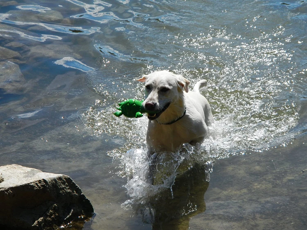 Three times the fun! 's 3-PLAY Turtle combines a squeaking play head, a treat hiding tummy and webbed footed float toy. Features Super Float to float above the water surface, making it easier to find for all water dogs. The 3-Play Recycled Turtle is made with Ecolast high durability post-consumer recycled material, for hours of fun while reducing your dog's carbon paw print. The Busy Belly tummy slot can be filled with kibble, treats or other tasty items your dog loves. Tough Squeak internal squeaker for extended playtimes. INDESTRUCTIBLE TOY FOR AGGRESSIVE CHEWERS: Does your dog keep chewing through all the toys you buy them? Don’t worry. The 3-Play Dog Toy is a tough, near-indestructible toy for even the most aggressive chewer. It’ll keep your pup occupied for hours of fun. SUSTAINABLY MADE WITH RECYCLED MATERIAL: At , everything we make uses durable post consumer recycled material. This toy is built from special Ecolast material to reduce your dog’s carbon pawprint. INTERACTIVE TOY FOR OUTDOOR DOGS: A great toy to take on-the-go, the 3-Play features Super Float to float above any surface of water so your water dog doesn’t ever lose track of it. TREAT DISPENSER: Does your furry friend deserve a treat? Fill the Busy Belly tummy slot with kibble, treats or other tasty items your dog loves to give them an extra reason to play. LONG LASTING FUN: Built to last long, the 3-Play Dog Toy comes in adorable Hippo form and features a Tough Squeak internal speaker for extended playtimes.