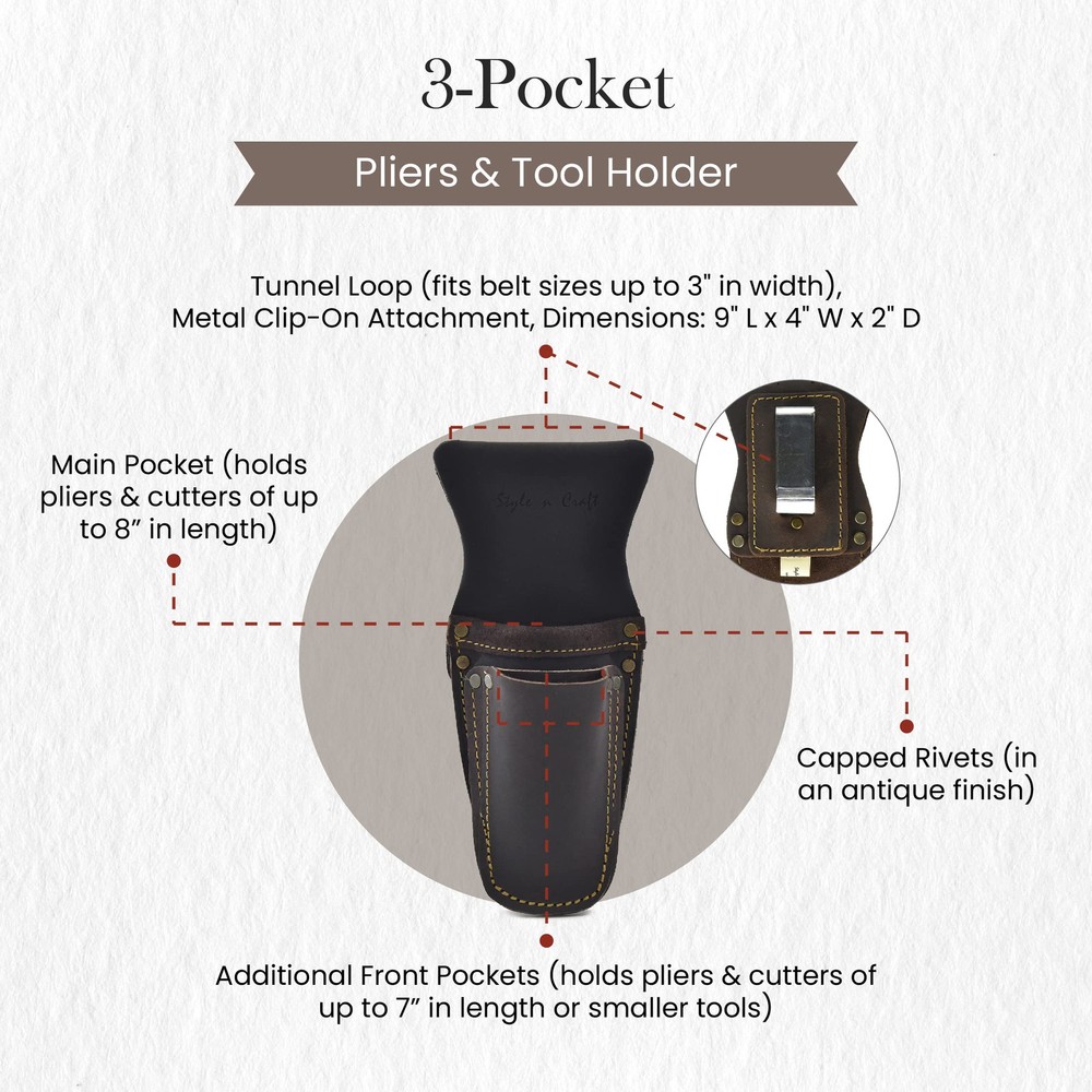 Product Description Are you looking for a comfortable yet spacious tool holder? presents an innovative 3-pocket pliers and tool holder that is durable, extremely versatile, and ideal for everyday use. It is made with heavy full-grain oiled leather reinforced with heavy-duty nylon thread stitching. Our dark brown color tool pouch has multiple pockets for your various needs. You can easily keep your pliers, cutters, snips, pruning shears, or other smaller tools in different-sized pockets. It is equipped with a tunnel loop and a clip-on attachment, allowing you to connect and detach this tool pouch easily. This leather tool pouch has rivets with caps for safety, and all its hardware comes in an antique finish. Our pliers and tool holder is a perfect addition to your work equipment. From the Manufacturer 3 pocket pliers/multiple tool holder in heavy top grain oiled leather; 1 main pocket and 2 additional pockets in front to hold multiple tools; contrast heavy duty nylon thread used for stitching; rivets with caps for safety; all hardware in antique finish; holds pliers, cutters, small tools etc.; tunnel loop can fit belt size up to 3-Inch wide. Ideal Belt Pouch: presents an innovative 3-pocket pliers and tool holder that will make your work easier and more efficient. Our tool pouch is durable, extremely versatile, and ideal for everyday use. Rugged Construction: Built to last for years, our tool pouch is made with superior quality, heavy full-grain oiled leather in dark brown color. It is reinforced with heavy-duty nylon thread stitching, ensuring long-lasting performance and durability. Multi Tool Holder: Our leather tool pouch is very comfortable, lightweight, and spacious. With 3 different-sized pockets, you can easily your pliers, cutters, snips, pruning shears, or other smaller tools in this tool pouch. Tool Belt Pouches: No matter who you are, a carpenter, electrician, framer, or construction worker, this leather pouch is super beneficial; it even works as a garden holster. Just attach it to your belt and keep all your tools together in one place. Tool Pouch with Belt Clip: With the help of a tunnel loop and clip-on attachment, you can easily attach our tool pouch to a 3" wide belt. This pliers and tool holder measures 9” L x 4” W and is a perfect addition to your work equipment.