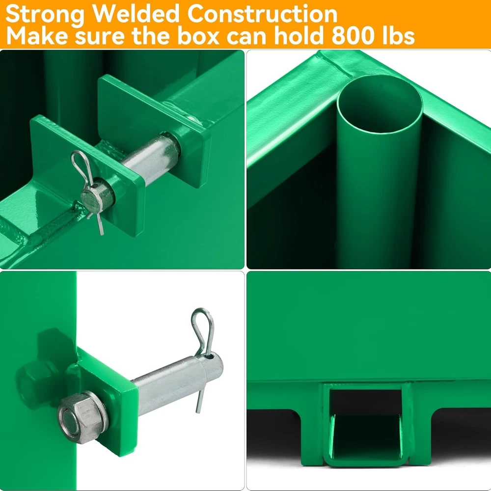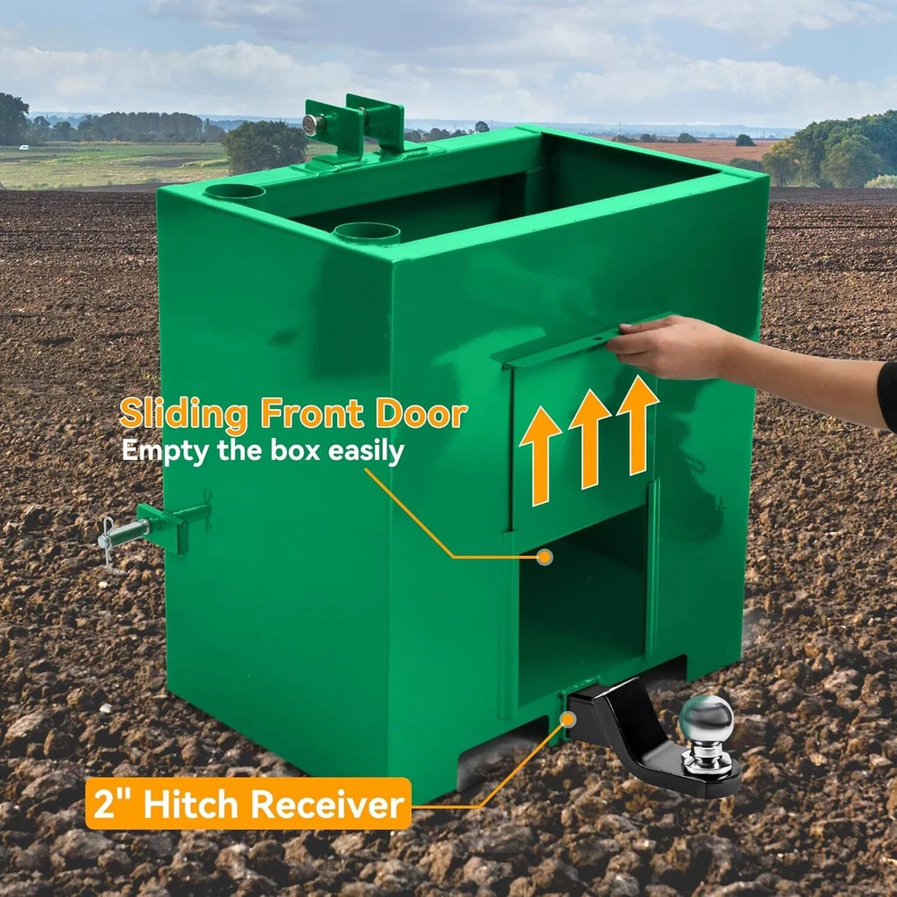 Description: The heavy-duty tractor ballast box is an indispensable accessory for any tractor owner who needs to enhance the stability of their machine during heavy-duty lifting or towing operations. This ballast box is engineered to evenly distribute the additional weight across the tractor, effectively reducing the risk of tipping and ensuring the safety of both the operator and the equipment. Boasting robust construction and exceptional durability, the ballast box is a trustworthy solution for stabilizing your tractor during demanding tasks. Fill the box with your preferred heavy material, such as sand, rocks, steel, or concrete, and witness the increased stability and maneuverability of your tractor. Don't let the threat of a tipping tractor compromise your productivity - invest in a ballast box to elevate the overall safety and efficiency of your work. Features: - 800 lb Capacity - Can be filled with a variety of materials to add weight to your tractor - Detachable bottom door for easy emptying of the ballast box - Provides storage space for gear and accessories - Fits any standard 3-point category I tractor - Large bottom pockets for easy forklift handling - Attention: Does not fit with quick hitch iMatch systems Specifications: - Finish: Powder Coated - Hitch ball receiver: 2" -Weight Capacity: 800lbs -Color: Green -Product Dimension: 23.6"x15.8"x24.3" -One Year Warranty Package Included: 1 X Counterweight Ballast Box Shipping The shipping rates listed are only for residential or commercial destinations in the continental 48 United States. All international sales will go through eBay Global Shipping Program.Please ask us if there are any questions. We only ship the item to the address that is sent to us at the time of checkout. Please verify the correct shipping address in your PayPal account before making your payment. If we ship your item to an old or invalid address and you are not able to locate the item, we are not responsible for shipping a replacement. Currently, we do not ship to Hawaii, Alaska, Puerto Rico,APO/FPO/PO Boxes. We use USPS, UPS & FedEx as shipping method. Payments cleared before 12 PM PST, will be shipped on the same day. Payment We accept PayPal and all forms of credit card. We will only ship to the confirmed Paypal shipping address given with the payment. We do not offer local pick up service. Return 30 days Money Back Guarantee. If any package that needs to be returned, please contact our customer service first to receive a RMA form. All return items MUST be in brand new condition. About Us Specialized in aftermarket auto parts since 2012, we source and work directly with professional manufacturers to provide the highest quality parts at the most economical prices. We also has over 5 years of shipping experience with FedEx and USPS . Our packing quality is guarantee ,item shipping is timely! On Jan 14, 2025 at 03:41:03 PST, seller added the following information: On Jan 18, 2025 at 18:34:43 PST, seller added the following information: On Jan 18, 2025 at 23:54:05 PST, seller added the following information: On Jan 19, 2025 at 00:44:49 PST, seller added the following information: On Jan 19, 2025 at 01:59:46 PST, seller added the following information: On Jan 20, 2025 at 05:25:28 PST, seller added the following information: