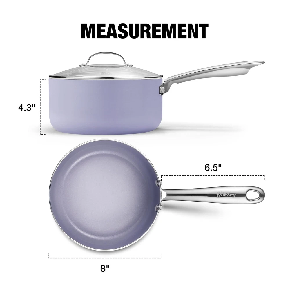 3QT Nonstick Saucepan with Lid Toxin Free Ceramic Coating Small Pot with Stainless Steel Handle Easy to Clean Suitable for All Stoves Oven Safe Gradient Purple Pan Y-SHAPED HANDLE & GLASS LID: The ergonomic handle provides a comfortable grip, while the tempered glass lid makes the cooking process easy to observe and locks in heat and moisture. If used over an open flame for a long time, beaware of metal getting hot and use pads and gloves ULTRA NONSTICK SURFACE: 3QT saucepan features a ceramic non-stick interior and exterior for easy cooking and cleaning, allowing for enjoyable smooth cooking with effortless cleanup BIULT FOR DIET: The non-stick ceramic coating of this 3QT milk pan is toxin-free and requires only a small amount of oil for stick-free cooking, reducing fat intake and ensuring healthy diet DISHWASHER & OVEN SAFE: For added convenience and practicality, 3 quart saucepan is designed to be dishwasher safe and oven safe up to 420℉ VERSATILE MAGNET BASE: The magnetically conductive stainless steel base allows the saucepan to be used on all stovetops, including induction, and the aluminum alloy core is for fast and even heating