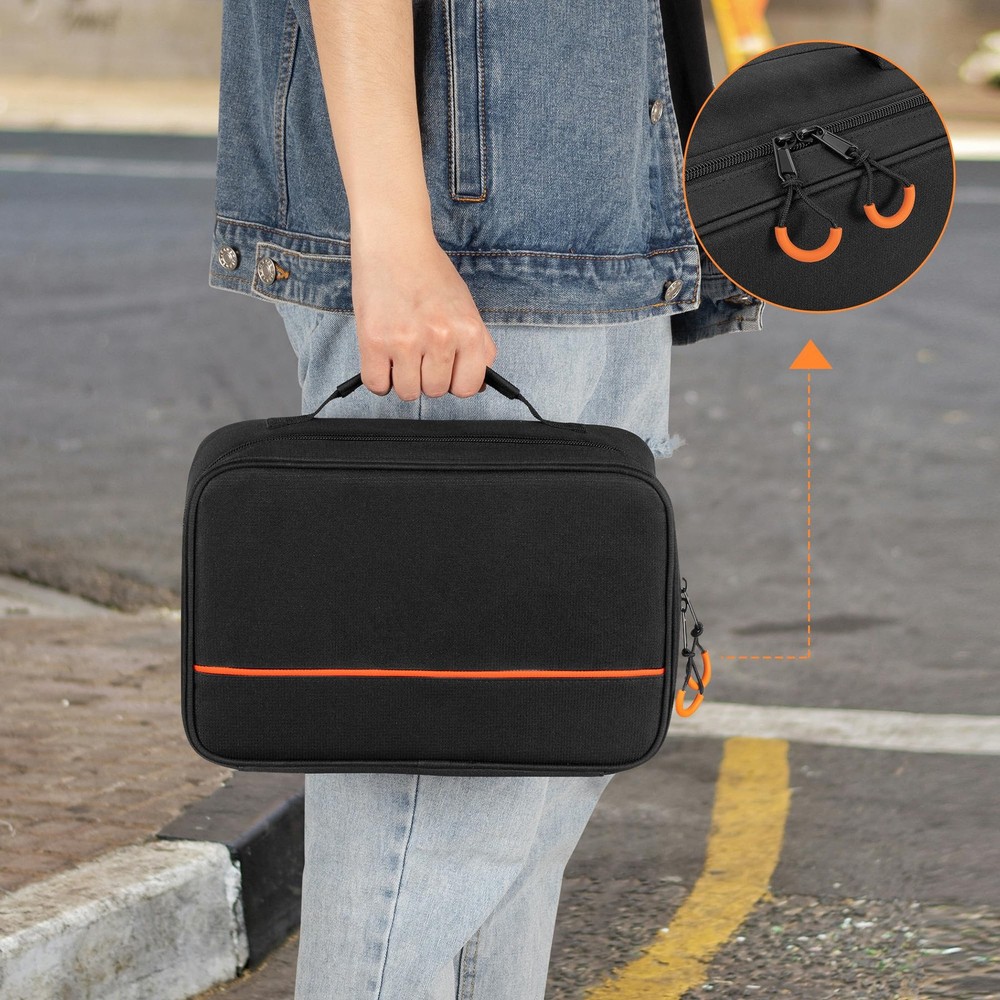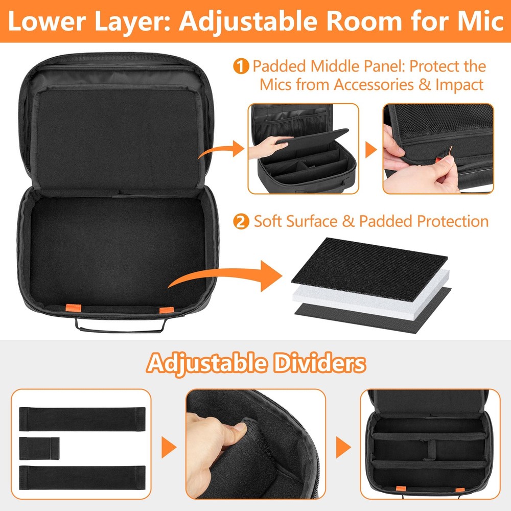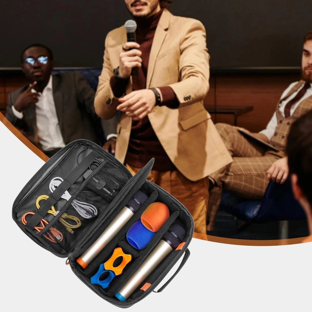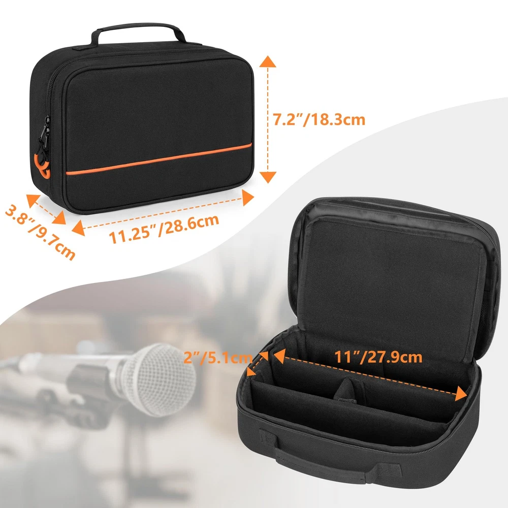 3 Slots Wireless Microphone Carrying Case, Microphone Storage Bag Fits for 3 Mic System Microphones Up to 11’’, Portable Mic case for Singing, Karaoke HOLDS 3 MICS: The microphone case features 1 short and 2 long dividers, you can use the 2 long dividers to divide the room into 3 individual slots for 3 mics or customize the room based on your needs WELL PROTECTION: The microphone compartment is equipped with thick velvet padding, even the interior dividers are all padded; All-round keep your valuable mics from bumps and friction PARTITION DESIGN: The middle divider with touch fastener separates mics from the mesh lid storage area, which can keep your mics in place during transport COMPACT & PORTABLE: Our microphone bag has a compact and lightweight size, which is convenient to carry; Besides, this bag also has 3 extra mesh pockets for holding accessories, such cables, adapters; Dual zippers for easy access IDEAL FOR: This mic case can compatible with Sennheiser*, Shure*, JBL* microphone and more (Our product is unrelated to brand mentioned); It is not only suitable for traveling, but also for home use. Great solution for Singing, Karaoke