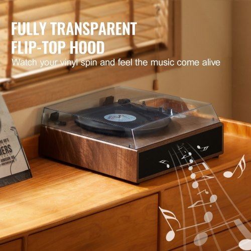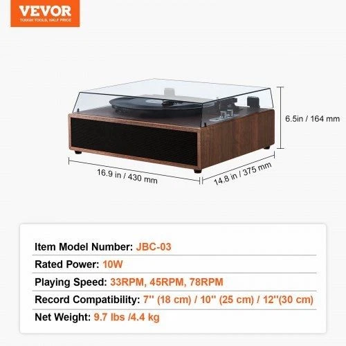 VEVOR Vinyl Record Player, 3-Speed, Belt Driven Turntable Player with Built-in 10W Stereo Speakers Magnetic Cartridge, Support 33/45/78 RPM Bluetooth Aux in RCA Output, for 7/10 /12 in Vinyl Records A Perfect Blend of Tradition and Modernity Built-In Speaker Stable Playback Automatic Stop The Perfect Romantic Gift Innovative Design Record Compatibility: 7'' (18 cm) / 10'' (25 cm) / 12''(30 cm),Playing Speed: 33RPM, 45RPM, 78RPM,Item Model Number: JBC-03,Rated Power: 10W,Product Dimensions (L x W x H): 16.9 x 14.8 x 6.5 in/430 x 375 x 164 mm,Net Weight: 9.7 lbs /4.4 kg *Photo Colors may vary on your device. With any product, the color may appear different based on device, monitor settings, configurations, browsers, the lighting/setting for the photograph, etc. Shades may slightly vary during manufacturing runs/processing. Photos are for informational purposes only and represent a basic design. Dimensions are approximated and may vary during manufacturing runs. Manufacturers may make modifications to the design of an item at any time. About Bargains Delivered Bargains Delivered gives personal attention that only a small business can offer. Wherever you prefer to shop, Bargains Delivered will be there with the widest selection possible for your convenience. See our feedback history with thousands of satisfied customers. We have been serving you since 2005, and we are committed to maintaining your trust! Returns/Refunds Our return policies are simple: brand new items may be returned up to 30 days from receipt. Customer covers shipping (initial and return) and no restocking fee applies if item is brand new. Brand new includes all packaging, tags, etc in perfect condition. Items which are not brand new may be subject to a 50% restocking fee or not accepted at all. All returns require a Return Merchandise Authorization number (RMA #).Please contact us for return RMA and return address. Please note that RMA # does not guarantee final disposition for a return and all returns are inspected before any credit would be given. Customer should use a trackable, insured return service. If item is damaged or lost in transit to us, customer would need to file a claim with their return carrier and we would not be able to process the return. Shipping fees are non-refundable, including expedited shipping, even if item is defective or arrives later than estimated. For any return requests involving variations in the color, shade, approximate dimensions, included accessories, or features listed in the description, normal return policies apply. If parts are missing or damaged, we will send replacement parts if available or it may be processed as a standard return. Shipping We ship fast, usually in 1-2 business days, with delivery expected 2-5 days later. Messages will be sent automatically with shipping updates. All items ship to the address provided in checkout. Please submit an order cancellation request if you need the item shipped to a different address. We may require Signature on any orders. All orders for bikes require Signature. Refusal of delivery, invalid address, unable to sign and receive, and any other reason beyond our cause of error will be treated as standard return, with all shipping and restocking fees deducted. Please inspect your package and merchandise as soon as possible to report any shipping damage or other concerns. Please save all packaging and materials until you are sure there is no damage and you will not be returning the item. If you need to return, we don't provide replacement packaging. For shipping damage, we can usually replace any specific part that is damaged. Let us know which parts need replacement. We do not provide any credits for work done to correct shipping damage (such as at local bike shops) or for the inconvenience of parts arriving damaged. We will work with you to correct any problems. Payment/Tax Sales Tax: Tax is charged for orders shipped to all states where such taxes are applicable. The amount of tax charged is based on current state and local tax rates. We collect Sales Tax for multiple states, and marketplaces also collect sales tax for some states. If your state requires the payment of use tax on out-of-state purchases, then that is fully the responsibility of the buyer. State and local tax rates are subject to change at any time By making a purchase from us, buyer agrees to above policies. Thank you!