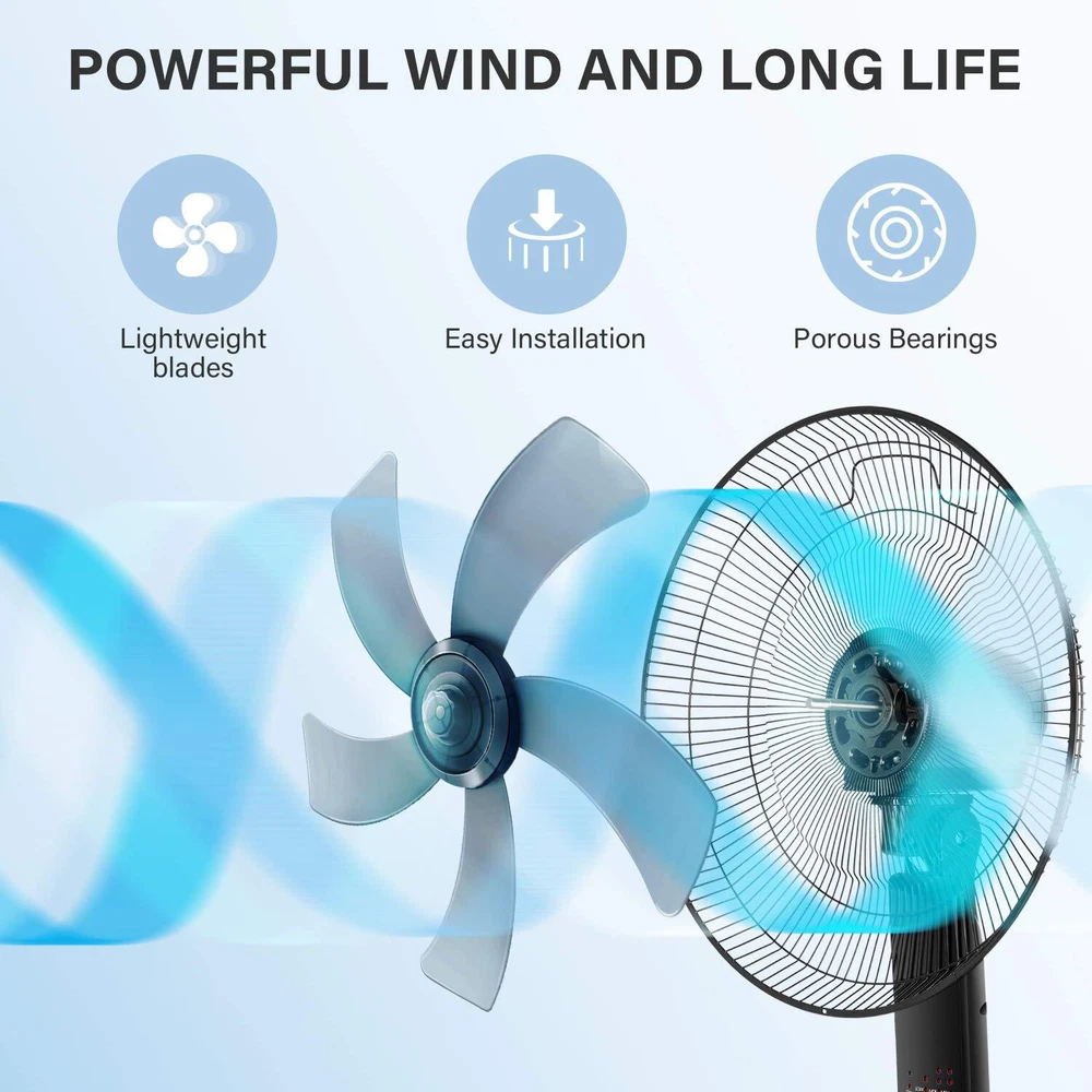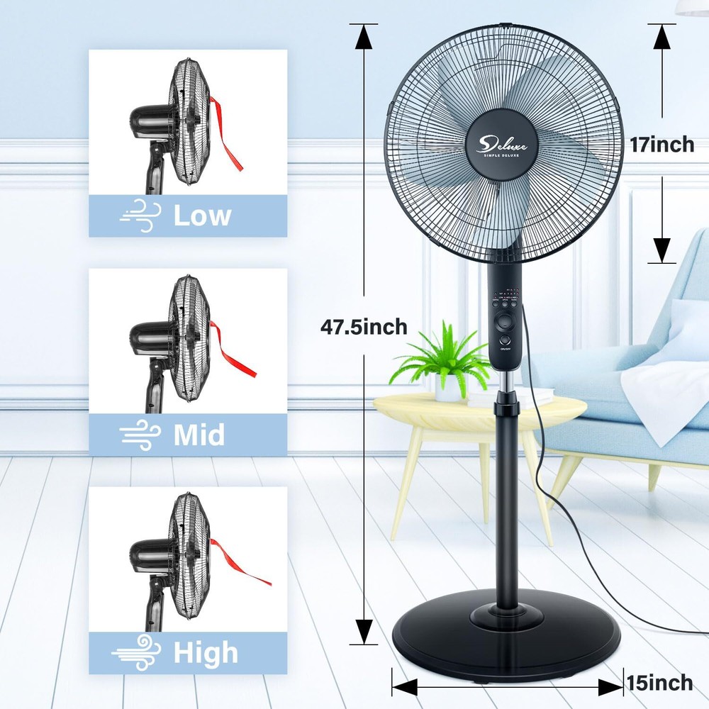 About this item Remote Control: Featuring blue LED display, remote control and auto power off functions, the standing fan is designed for long-range and full function control (up to 20 ft). 3 Adjustable Speeds: Different speeds make our pedestal fan ideal for different places. There are low, medium and high wind speed for you to choose according to different situations and temperature. Different wind speeds make our pedestal fan ideal for many places like office, home and so on. 90 Degree Oscillation: The 90 ° wide oscillation angle makes air around the room and make the whole room cool. The direction of the breeze could aim anywhere between the floor and the ceiling through tilt angel of fan head. Stable and Low Noise: Simple Deluxe' s new technology reduces the noise level by 40% making it one of the quietest fans on the market. dB Levels of Sounds – Less than 60db. Superior Quality with Worry Free - Customer service is our pleasure and we will take care of any issues with our products . Feel free to email us any time for any concerns.