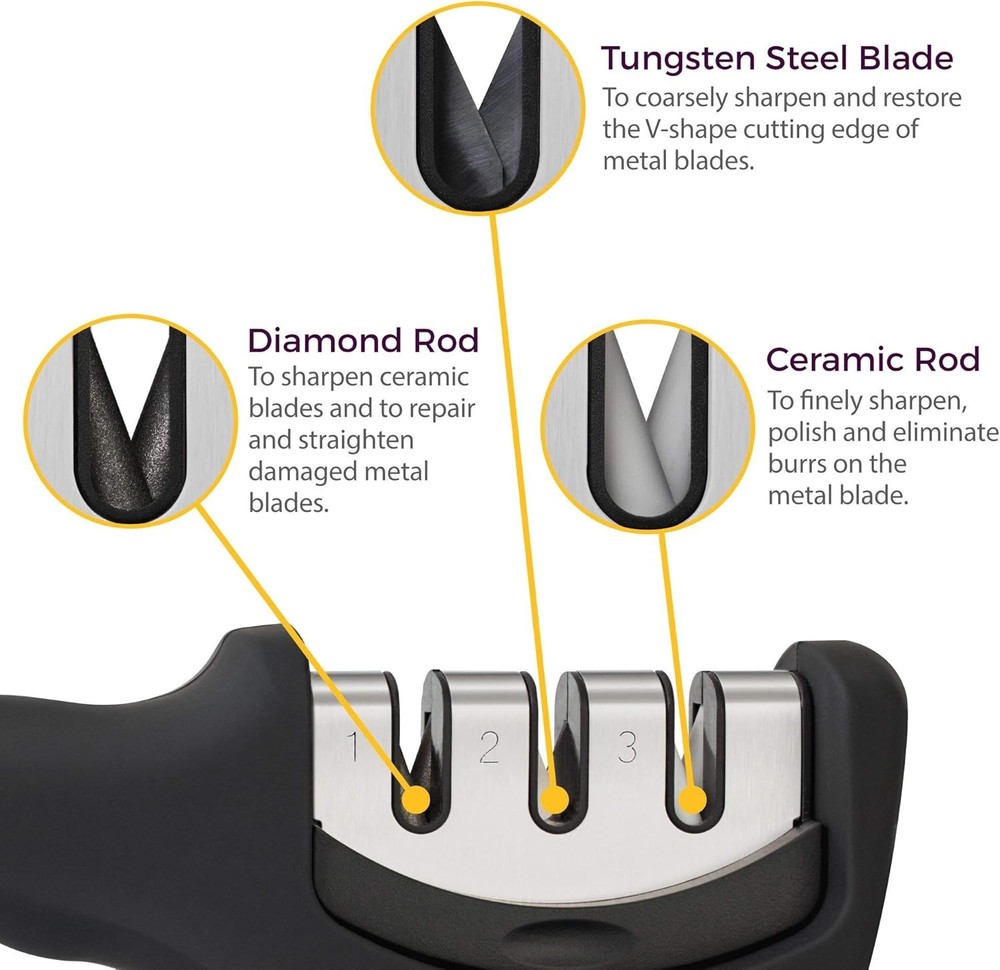 3-Stage Knife Sharpener 🧤 w/ Glove – Restore, Sharpen & Polish Blades Fast 🔪 Revive Your Knives—Cut Like a Pro Again! Tired of dull kitchen knives slowing you down? This 3-step sharpening system is your go-to solution for restoring blades to razor-sharp precision—safely and effortlessly. Whether you're prepping for a dinner party or just making lunch, this tool brings your knives back to life in seconds. 💡 Key Features & Benefits: ⚙️ 3-Stage Sharpening System Stage 1: Diamond rod repairs and straightens damaged blades Stage 2: Sharpens and restores the blade’s V-shape Stage 3: Fine hones and polishes for a clean, smooth edge 🎯 Perfect for Home Cooks & Kitchen Pros Great for chefs, home cooks, and anyone tired of struggling with dull blades Revive your kitchen tools with professional results at home 💪 Durable, Long-Lasting Quality Made from solid ABS plastic for strength and durability Crafted with high-grade materials to make your knives look and cut like new 🧤 Includes Cut-Resistant Glove Stay protected while sharpening Non-slip base for stability and added safety 🙌 User-Friendly Design Ergonomic handle for both right- and left-handed users Just insert your and pull gently— quick, safe, and effective Item model number KS37 P Number of Items 1 Color Black Material Tungsten, Ceramic Item Weight 180 Grams Grit Type Fine Is Discontinued By Manufacturer No Product Dimensions 8.3"L x 2.2"W x 3.4"H Shipping Fast shipping is very important for us. Our standard US shipping service is FREE. Your order will be shipped within 2-5 business days upon full payment received. Your order will be delivered within 2-3 business days after the handling time. We only ship to the confirmed PayPal address. We reserve the right to cancel any order for any reason at any time. We are not responsible for undeliverable addresses. Returns and payment We have a No Refund/No Return Policy but we are backed by Ebay Policy if product is not as described or damaged upon delivery. Please contact us within 24 hours of delivery to make a claim. FeedBack Your feedback very important to us, after you get your package and you are satisfied with our service please leave us positive feedback If you have any problem with your order / any questions please before leave any type of feedback For any questions, using eBay contact system Please visit our eBay store to check out other items for sale! Thank you for shopping at our store.