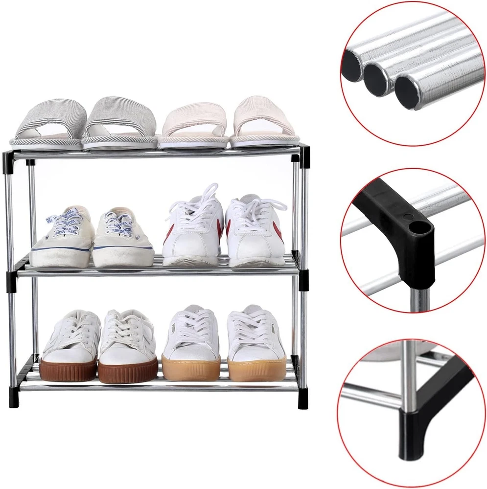 Recommended Uses For Product: Shoes Color: Black Item Width: Does not apply Batteries Required?: No Min Required Door Width: 7.69 Centimeters Care Instructions: wipe with dry cloth Room Type: bathroom Brand: Unbranded Product Care Instructions: Wipe with Dry Cloth Product Dimensions: 10.24"D x 17.32"W x 15.51"H UPC: Does not apply Features: Stackable, portable Number of Compartments: 1 Shelf Thickness: 17.2 Inches Assembly Required: Yes Unit Count: 3.0 Count Item Depth: 10.3 in Mounting: Free Standing Finish Type: Stainless Steel Type: Shoe Rack Shelf Type Plastic: plastic Installation Type: Freestanding Finish: Stainless Steel gtin13: Does not apply Item Weight: 0.85 pounds Country of Origin: China Style: Shoe Furniture Finish: Black Included Components: plastic connectors Number in Pack: 1 Number of Items in Set: One-Piece Item Length: Does not apply Material: Plastic, galvanized pipe Special Features: Portable Batteries Included?: No Capacity: 6 pairs Number of Shelves: 3 Number of Drawers: 0 Special Feature: Portable Material Plastic: Plastic Number of Items: 1 Item Height: Does not apply