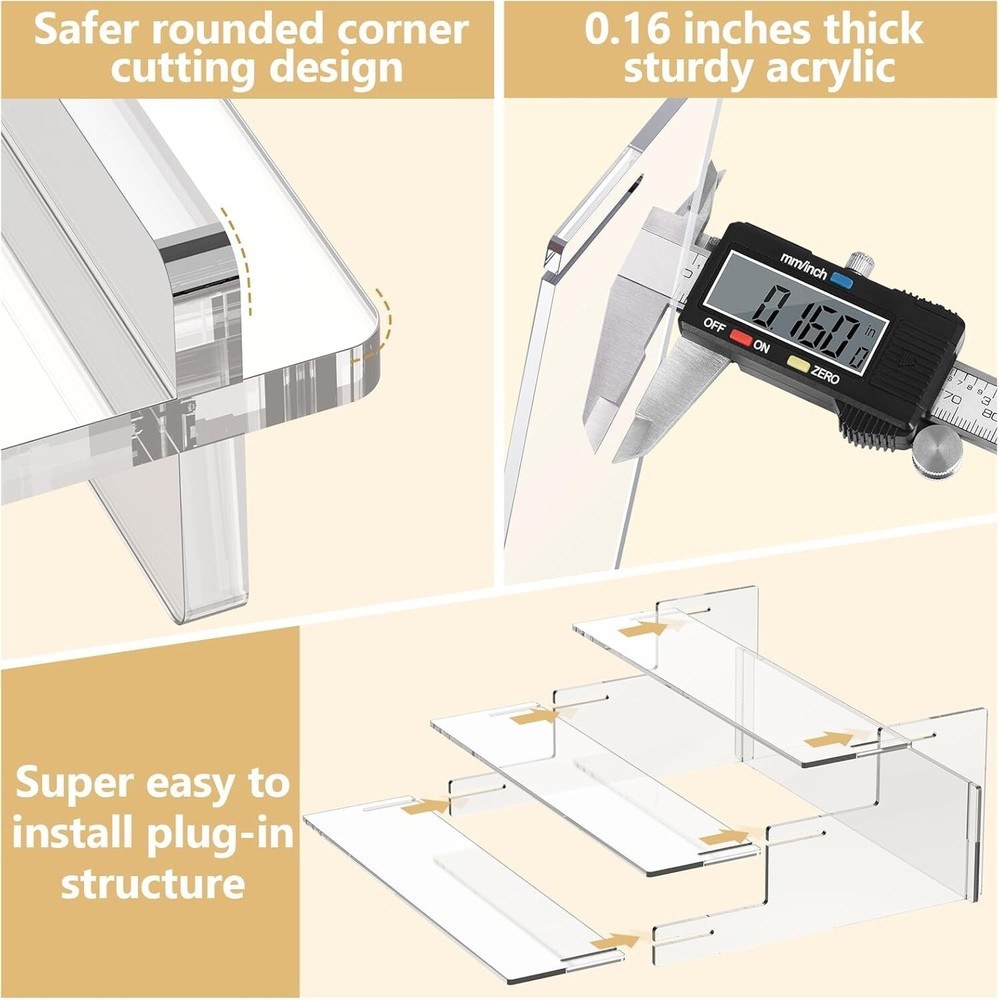 Show off your favorite items with this versatile 3-tier acrylic display riser . Whether you're organizing collectibles, displaying desserts, or showing off products, this clear stand adds a stylish and functional touch to any space. Features: Multifunctional Use : Perfect for cupcakes, figurines, perfumes, nail polish, and more. Great for parties, kitchen counters, stores, or personal collections. Durable & Stable : Made from 0.16-inch thick high-quality acrylic with a strong triangular base for excellent support and stability. Sleek Clear Design : Transparent acrylic offers a clean, modern look that highlights your items without distraction. Easy Assembly : Tool-free setup and breakdown. (Note: Remove protective film before installation.) Dimensions : 8.9" L x 8.9" W x 4.7" H Make your items stand out and stay organized with this elegant and space-saving display solution!