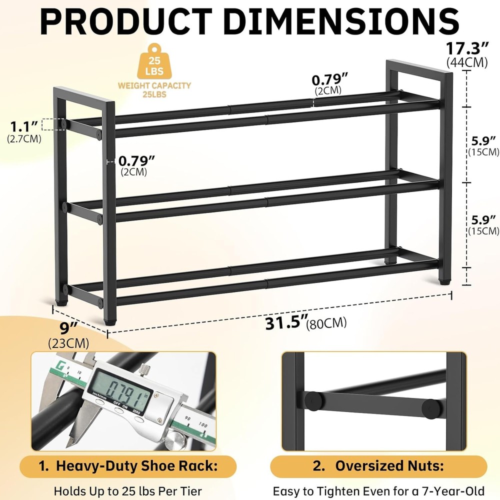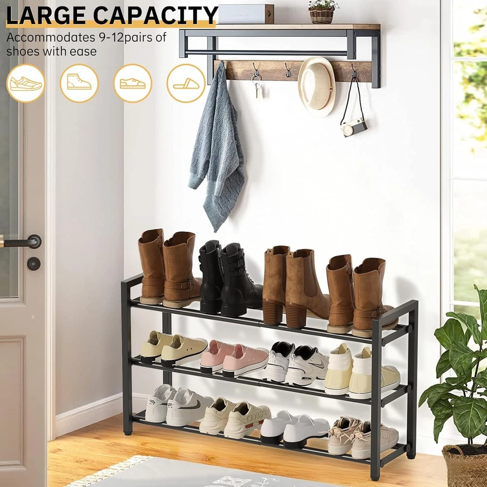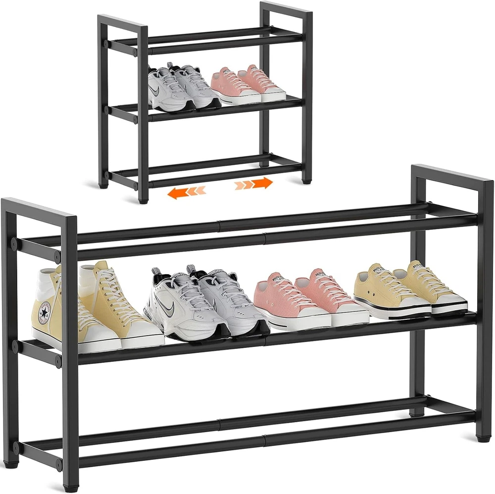 This shoe rack is a game-changer for small spaces! The adjustable width makes it super versatile—fits perfectly in my closet and entryway. No tools needed for assembly, and it holds up to 12 pairs of shoes without wobbling. Sturdy, space-saving, and totally worth it!