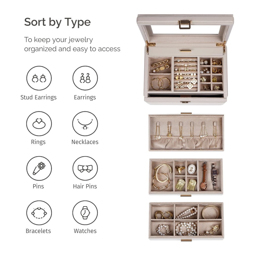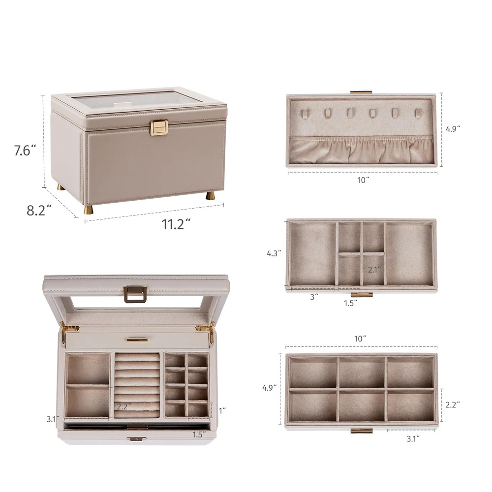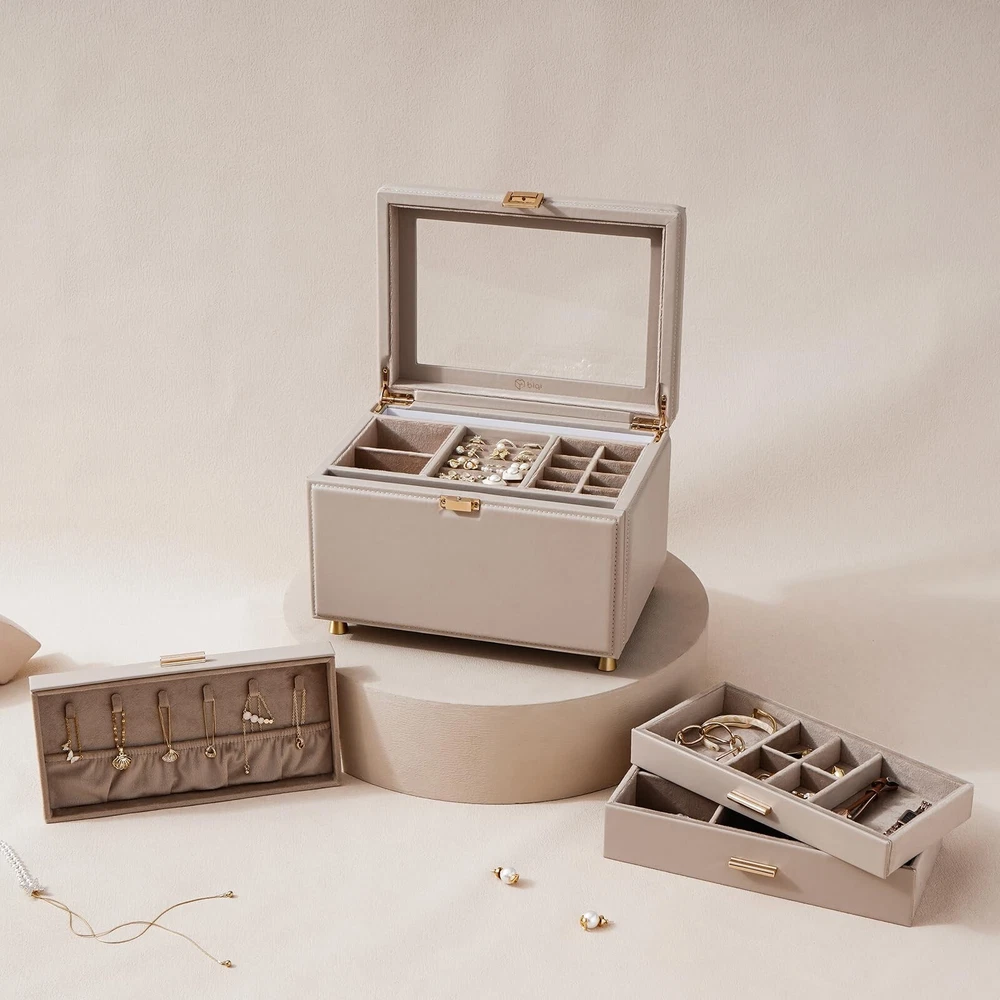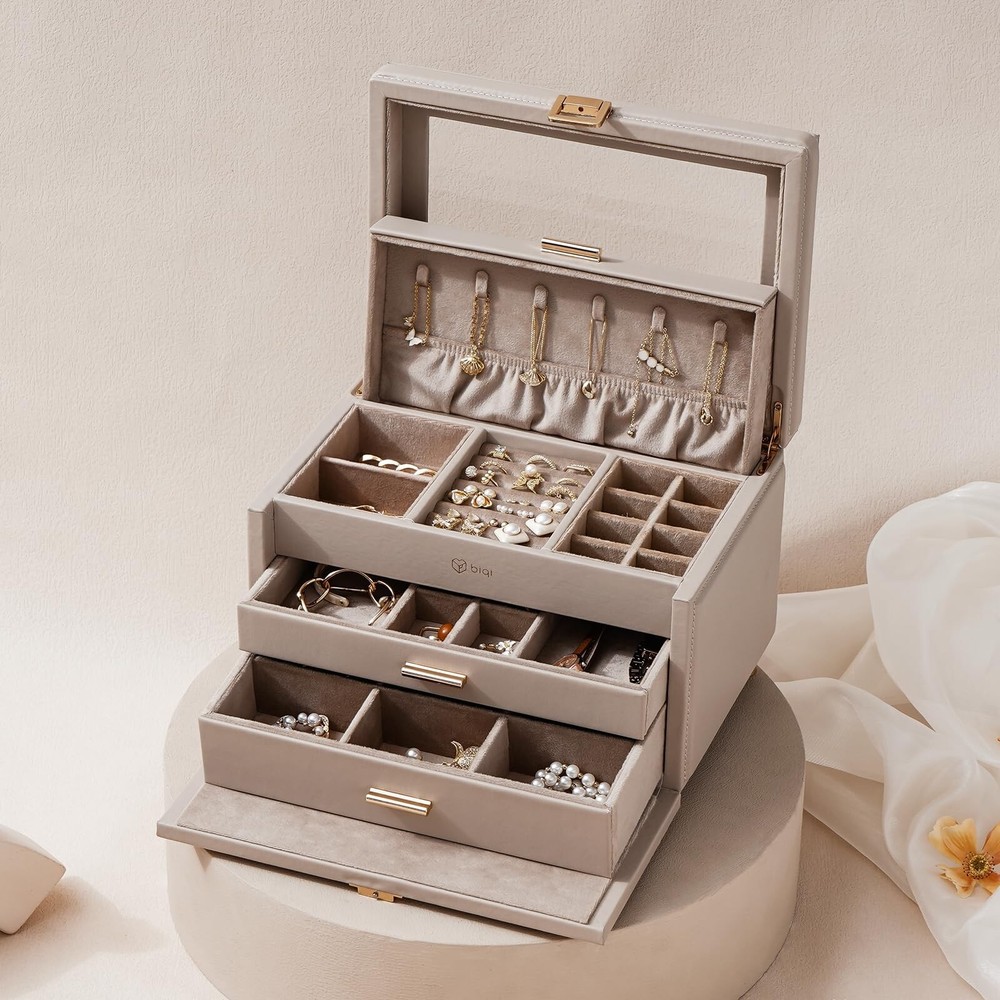Jewelry Box with Glass Window, 3-Tier Jewelry Organizer with 2 Drawers, Large Jewelry Storage Box for Necklaces, Bracelets, Rings, Earrings, Women Gift - Buy Now with Fast Shipping! Jewelry Box with Glass Window, 3-Tier Jewelry Organizer with 2 Drawers, Large Jewelry Storage Box for Necklaces, Bracelets, Rings, Earrings, Women Gift Product Details Color: light taupe Brand: BIQI MUSSE Material: Faux Leather Style: Modern Special Feature: Hinged, Waterproof, Secret Compartment, Dustproof, Adjustable Recommended Uses For Product: Necklace, Bracelet, Ring, Watch, Earring, Bangle Product Dimensions: 11.22"D x 8.2"W x 7.64"H Target Audience: Women, Girls Shape: Rectangular Finish Type: Coated Color: ‎light taupe Brand: ‎BIQI MUSSE Material: ‎Faux Leather Style: ‎Modern Special Feature: ‎Hinged, Waterproof, Secret Compartment, Dustproof, Adjustable Recommended Uses For Product: ‎Necklace, Bracelet, Ring, Watch, Earring, Bangle Product Dimensions: ‎11.22"D x 8.2"W x 7.64"H Target Audience: ‎Women, Girls Shape: ‎Rectangular Finish Type: ‎Coated Number of Drawers: ‎2 Number of Compartments: ‎12 Jewelry Storage Type: ‎Jewelry Box Manufacturer: ‎BIQI MUSSE Occasion: ‎New Year, Christmas, Housewarming, Anniversary, Birthday Mounting Type: ‎Table Top Closure Type: ‎Buckle Item Weight: ‎7.98 pounds Country of Origin: ‎China Finish: ‎Coated Special Features: ‎Hinged, Waterproof, Secret Compartment, Dustproof, Adjustable Batteries Included?: ‎No Batteries Required?: ‎No Date First Available: May 29, 2024 Key Features ✅ Modern&Luxurious Outlook: Jewelry organizers box selected from premium leather with neutral color, crafted with precision by skilled craftsmen, every detail exudes a comfort texture. Interior beaded flannel keeps your jewelry from scratches and damages. Thoughtful clear glass window design, allowing you to showcase your favorite jewelry pieces without having to open the lid, making it easy to select the perfect accessory for any occasion, Also adding a touch of luxury and delication to your vanity ✅ Functional Storage: 3-Tier jewelry box equipped with multiple independent compartments, it allows you to store various jewelry items separately. Built-in hidden necklace storage tier, elastic pocket preventing them knots. Whether it's bracelets, rings or earrings, they can all find their rightful places, keeping your beloved jewelries always well-organized ✅ Considerate Details: Each tier features thoughtfully designed compartments, ensuring your jewelry is stored neatly and securely, preventing tangles and collisions. Removable partitions in the drawer create space for larger items also meet your different needs, flexible design make it more practicality. Safely store your cherished accessories and let every moment of beauty become an eternal memory ✅ Maximize your Space: Jewelry storage box measures 11.2L*8.2W*7.6H inch. Perfectly integrates simple with stylish, providing a cozy home for your precious collections ✅ Perfect Gift Idea: Simple elegant design, perfect for those who love a minimalist aesthetic. Thoughtful present for someone special in your life, this large jewelry organizer box is a stylish addition to any woman's collection. Also comes nicely wrapped, would be a very nice gift for someone special or just for yourself! Product Description