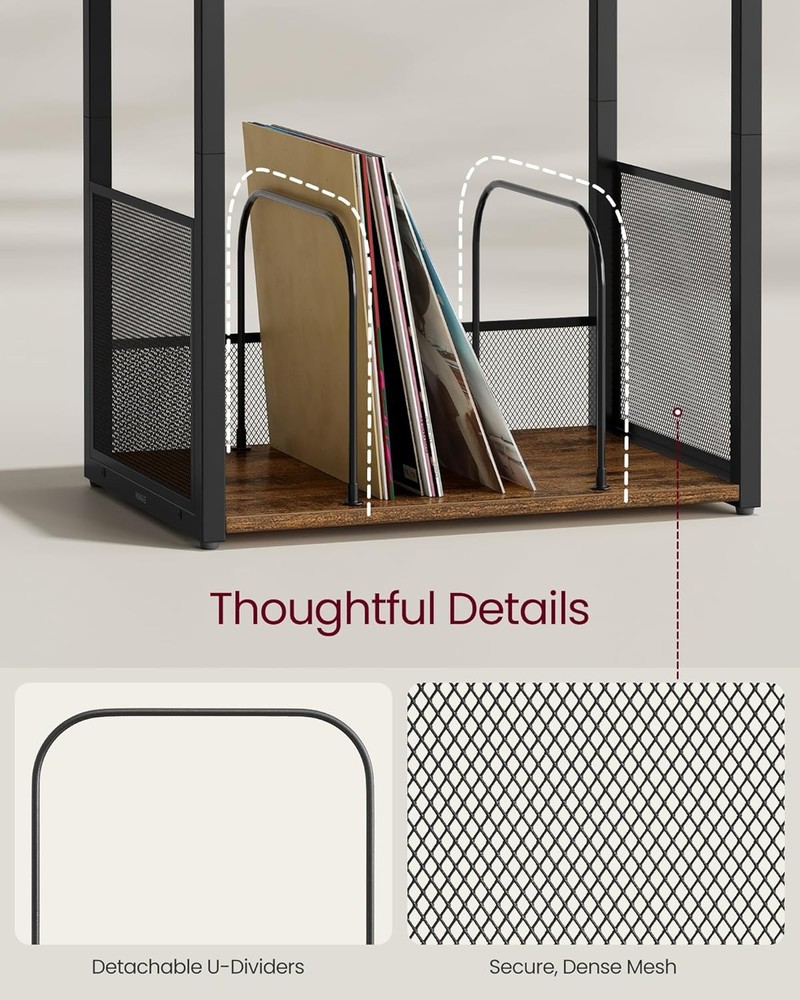 【3-TIER DESIGN】This bedside table features a tabletop for your record player and 2 open shelves that can hold up to 100 albums. Enjoy a tidy and organized music area 【EASY ASSEMBLY】This record player stand comes with detailed instructions and labeled parts, making it a breeze to assemble in just 6 simple steps 【VERSATILE USE】This turntable stand doubles as a side table, making it a versatile addition to your living room, bedroom, or study. Enjoy your afternoon tea or store daily essentials with ease 【STURDY AND STYLISH】Crafted from robust particleboard and steel, this couch table is built to last. The combination of rustic brown and black colors creates an industrial look, adding a touch of vintage charm to your decor 【THOUGHTFUL DETAILS】The dense mesh prevents items from falling off, while the removable U-shaped dividers at the bottom allow you to customize your storage space to fit your needs