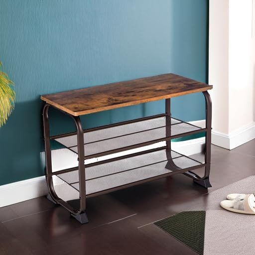 Always wasting time looking for the right shoes in a big, messy pile? Hopping around on one leg to put on your shoes before heading out? Longing for a tidy, magazine-like entryway with everything organized? This 3-tier shoe bench is the answer you’re seeking! Rescue your shoes from the piles and provide them a handy perch. Next time, sit on the bench, grab the right pair, tie your shoes, and go! Quality—The steel frame and particleboard surface give this bench a sturdy, stable structure that supports up to 198 lb. Storage—Your sneakers, flats, and high heels go on the 2 mesh shelves, and bags go on the top shelf. Holding about 6-8 pairs of shoes, it takes little floor space. Look—With two tones of rustic brown and bronze, this industrial shoe rack is a hallway beauty that will wow your guests! Specifications: - Color: Rustic Brown, Bronze - Material: Particleboard, Steel - Product Size: 11.8”D x 26.0;W”W x 17. 7”H (30 x 66 x 45 cm) - Top Board Size: 11.8”D x 26.0”W (30 x 66 cm) - Product Weight: 11 lb (5 kg) - Max. Static Load Capacity: 198 lb (90 kg) Package Contents - 1 x Shoe Bench - 1 x Assembly Kit - 1 x Instructions Notes: - For daily maintenance, wipe the product with a damp cloth. - Children are not allowed to climb or stand on the product; kids under 6 years old should use it with adult supervision. [Make It Happen] Before: Shoe piles eat up your hallway, blocking your entry and a way to a tidy home. After: Have a seat, take your shoes off, and put them away. What happened? You got this 3-tier shoe bench! [Assembly? Easy Job] You don’t have to go a long way to have this shoe rack in your hallway, as the assembly is only 3 steps! The clear instructions and labeled parts help you set it up in leaps and bounds [Made with a Mix] The frame? Steel. The top surface? Particleboard. This shoe storage organizer is the result of a perfect combination of robust, durable materials, offering you a stable structure that supports up to 198 lb [Storage with Style] Don’t sacrifice style when it comes to storage. Instead, invite this chic, industrial piece in. The 2 metal mesh shelves can hold about 6-8 pairs of shoes, while the rustic brown surface stages purses. Is this a cutie? We think so! [What You Get] A shoe bench and rack in one that offers 3 storage shelves to clear the mess in your hallway and a comfortable seat for your family or guests to change their shoes