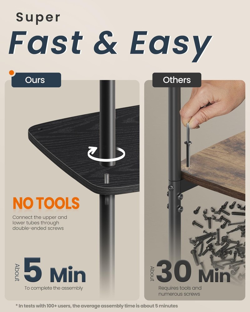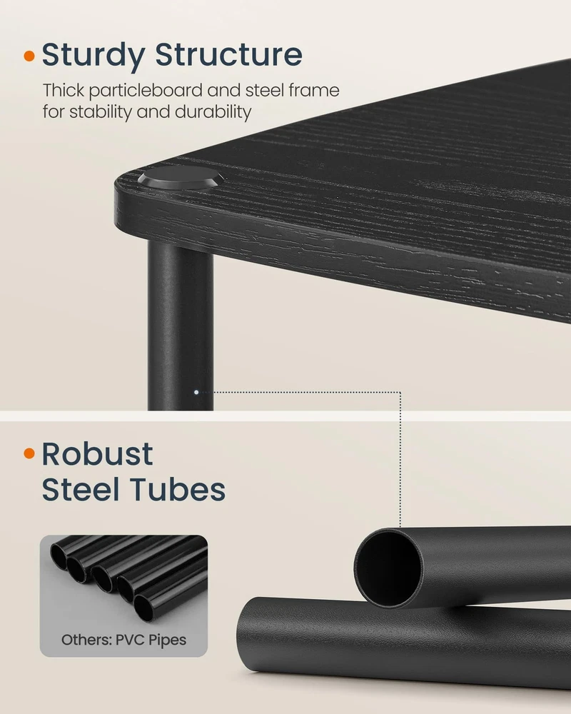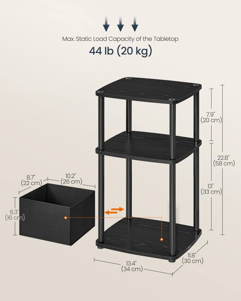 【SUPERFAST TOOLLESS ASSEMBLY】Set up this end table in just about 5 minutes—no tools required. By connecting the tubes with double-ended screws, you can quickly set up all the tiers. It's as easy as building blocks! 【AMPLE STORAGE】Boasting 3 shelves and an additional fabric basket, this side table offers ample storage space—an ideal storage solution for your odds and ends! 【SPACE-SAVING SOLUTION】Designed for narrow spaces, this 11.8"D x 13.4"W x 22.8"H nightstand is a practical storage solution for vases, lamps, cups, books, and other items in compact living rooms or bedrooms 【ROBUST AND LONG-LASTING】Sturdily crafted from premium particleboard and robust 0.7" dia. steel tubes, this bedside table is durable enough to withstand the test of time 【MODERN CHARM】Featuring clean lines, rectangular shelves, and a minimalist design, this ebony black side table exudes a modern charm that complements various decors