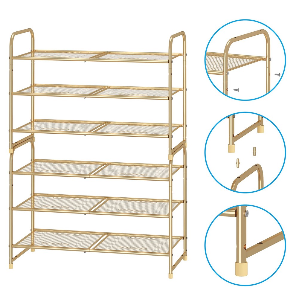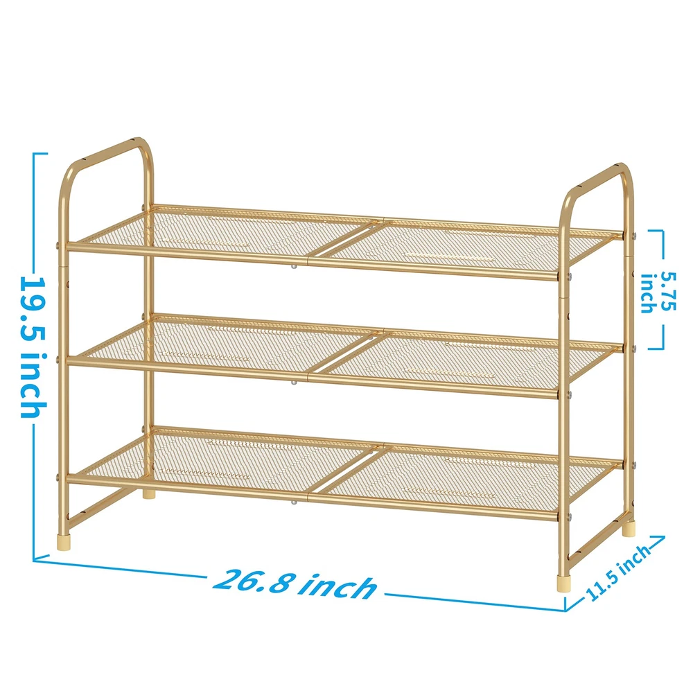 What does this DIY shoe rack have to offer? Stackable: This 3-tier shoe rack provides shelves for keeping flats, boots, high heels, kids’ shoes. Two sets can be stacked or placed side by side to create a large capacity shoe rack and fit your space. Versatile Storage Shelf: You can place this rack anywhere you want, such as in the entryway, closet, garage, living room or mudroom; also great as a storage shelf for dry food, books, games, toys, craft supplies, etc. Will you find any more possible uses? Just find out yourself with this versatile utility rack. Specifications: Color:Gold Material: Metal Product Size: 26.8" * 11.5" * 19.5" Package Contents: 1x 3 Tiers Shoe Rack 1 x Assembly Manual 1 x Allen Key 4 x Metal Connectors ( for stacking ) 【3-TIER SHOE RACK】 Stores up 9-12 pairs of shoes for men, women, additional bottom storage for slippers. Allow extra storage which can hold sundries in your kitchen, living room 【PERFECT FOR HEELS】The narrow metal wire mesh prevents even the small items from falling down and keep your stilettos, boots, shoes and high heels shoes stable 【STACKABLE & EXPANABLE】Include 4 connectors and stack up to multiple units that maximizes storage space in the same footprint, or bridged horizontally to expand the unit (Purchase 2 and more units to build horizontally and vertically storage) 【ADJUSTABLE TIER HEIGH】Easy assembly- Simple clip the shelves into the frame. You can easily adjust the height of shelves accommodates different sizes of shoes. Even the High Boots, you can it easy 【STURDY & DURABILITY】Made of thickened metal tube with power coated finish which is smooth and with strong corrosion resistance. Each shelf holding up to 30 lbs; Dimension: 26.8"W x 11.5"D x 19.5"H; USPTO Patent Pending