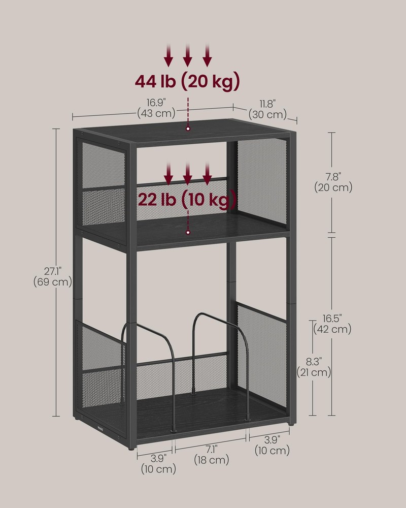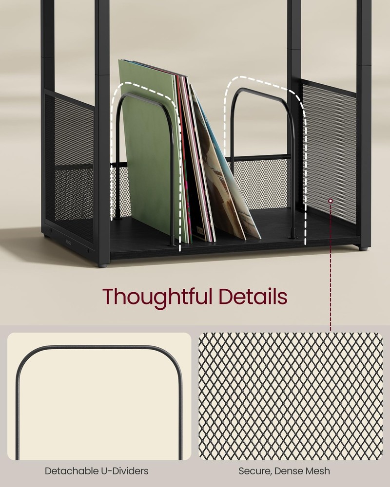 Are you tired of having your vinyl collection scattered all over the place? Meet the record player table, the practical and elegant solution to keep your records and player organized in style. Highlights of This Record Player Stand at a Glance: - 3-Tier Design: The top holds your record player, while 2 open shelves up to 100 albums. - Versatile Use: Doubles as an end table for your living room, bedroom, or study. - Sturdy Build: Made with particleboard panels and a steel frame for durability. - Rustic Charm: This side table's industrial look and clean lines complement your home decor. - Details Matter: Dense mesh prevents items from falling, and the U-shaped dividers allow for categorized storage. Specifications: - Color: Ebony Black - Product Size: 11.8"D x 16.9"W x 27.1"H (30 x 43 x 69 cm) - Material: Particleboard, Steel - Product Weight: 13.4 lb (6.1 kg) - Max. Static Load Capacity of the Top: 44 lb (20 kg) - Max. Static Load Capacity of the Middle Shelf: 22 lb (10 kg) - Max. Static Load Capacity of the Bottom Shelf: 44 lb (20 kg) Package Contents: - 1 x Record Player Stand - 1 x Accessory Kit - 1 x Instructions Notes: - Do not sit on the side table. 【3-TIER DESIGN】This bedside table features a tabletop for your record player and 2 open shelves that can hold up to 100 albums. Enjoy a tidy and organized music area 【EASY ASSEMBLY】This record player stand comes with detailed instructions and labeled parts, making it a breeze to assemble in just 6 simple steps 【VERSATILE USE】This turntable stand doubles as a side table, making it a versatile addition to your living room, bedroom, or study. Enjoy your afternoon tea or daily essentials with ease 【STURDY AND STYLISH】Crafted from robust particleboard and steel, this couch table is built to last. The ebony black color creates an industrial look, adding a touch of vintage charm to your decor 【THOUGHTFUL DETAILS】The dense mesh prevents items from falling off, while the removable U-shaped dividers at the bottom allow you to customize your storage space to fit your needs
