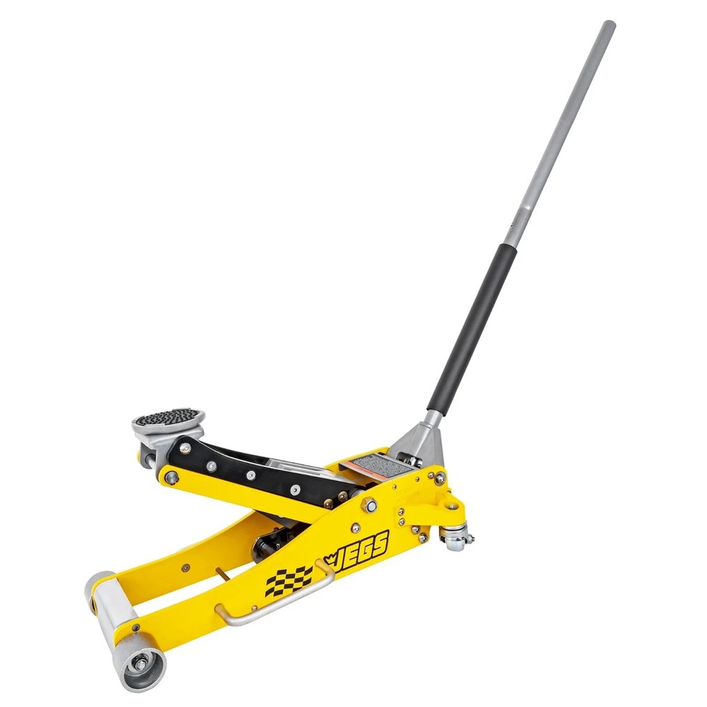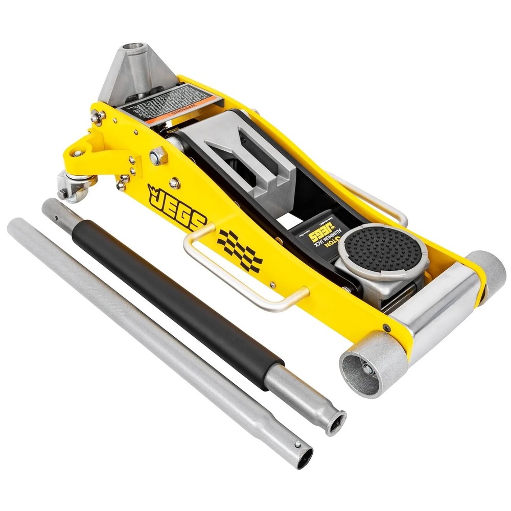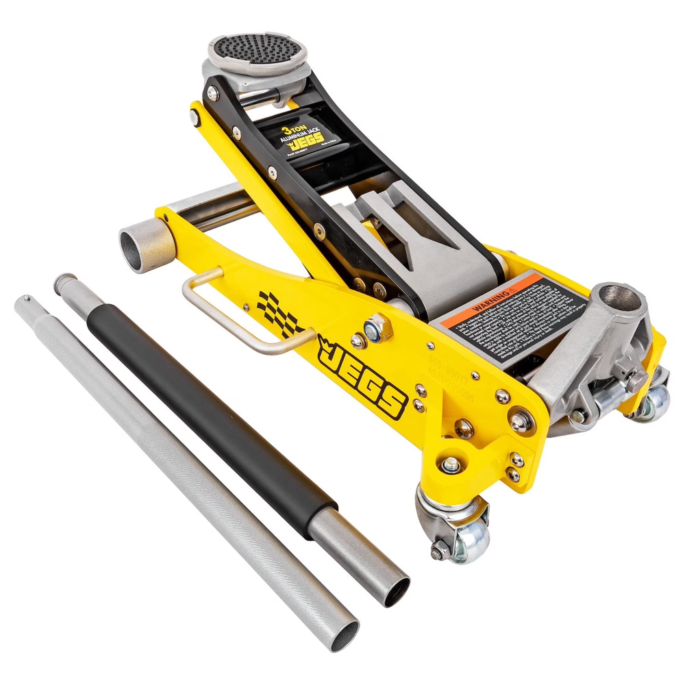 3-Ton Aluminum Floor Jack JEGS 555-80077 3-Ton Aluminum Floor Jack Features: Aluminum construction Lightweight The saddle rotates 360 degree Minimum Saddle Height: 3 7/8 in. (good for low-clearance vehicles) Maximum Saddle Height: 19 1/2 in. 45 3/8 in. two-piece handle with sleeve (protects vehicle during use) Knurled grip reduces slippage Dual side handles simplify maneuvering/positioning Hydraulic Lift: 15 5/8 in. Rubber lift pad prevents marring Chassis Length: 25 1/2 in. Chassis Width: 13 in. Seals protect the hydraulic system from contaminants Overload & bypass valves prevent the jack from being used beyond its rated capacity Specifications: Part Type Jack Product Line Professional Low Profile Floor Jacks Jack Capacity 3-ton Jack Color Yellow Jack Material Aluminum Jack Type Floor Maximum Lift Height 19.50 in. Minimum Lift Height 3.875 in. Overload Protection Yes Package Depth 8.00 Package Height 32.00 Package Width 16.00 Part Category Accessories Part Fitment Universal Shipping Weight 67.00 Weight Capacity Per Jack Stand Sold Individually