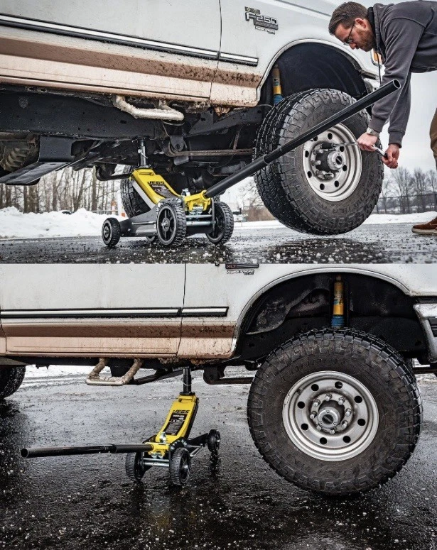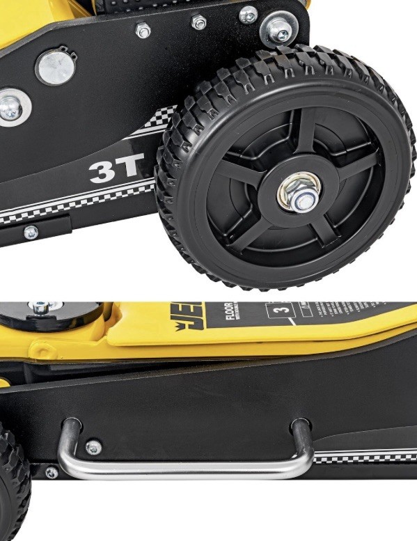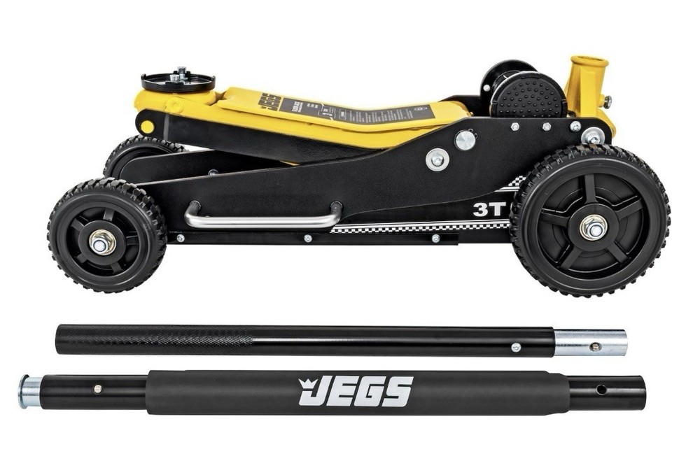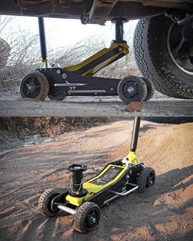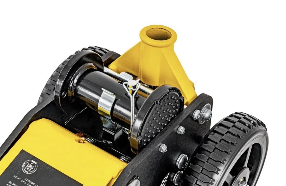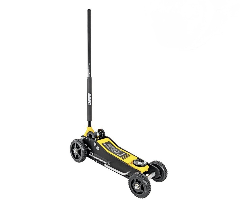 Lightweight aluminum sides combined with a sturdy steel center for enhanced strength and durability Large 5.75-inch front wheels and 7.75-inch rear wheels for easy maneuvering of your off-road or racing vehicle in sand or gravel areas Dual handles on both sides for convenient carrying A bottom skid plate improves jack stability on sand and gravel surfaces Includes two extra interlocking sections, providing a lifting range of 6.1 inches to 28 inches Designed for easy and convenient storage when not in use 6.75 in. minimum clearance needed Total weight is 72 lbs.