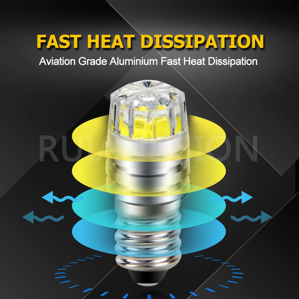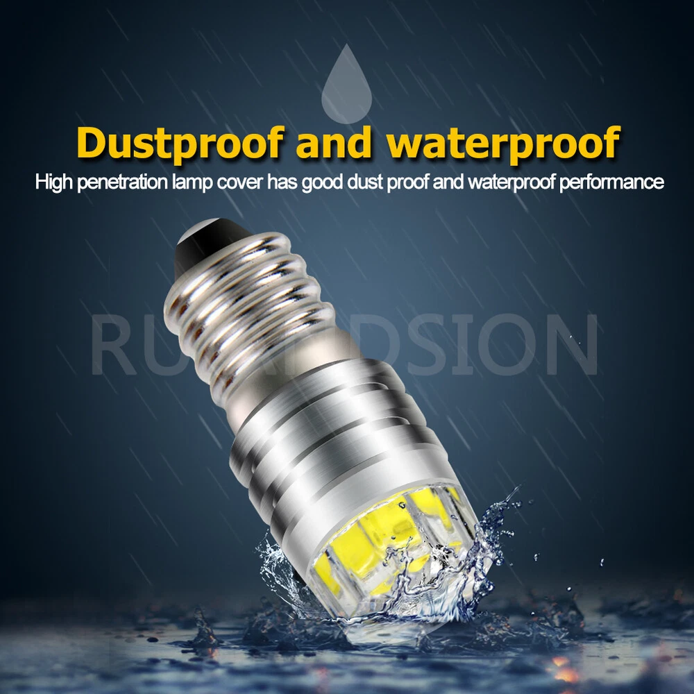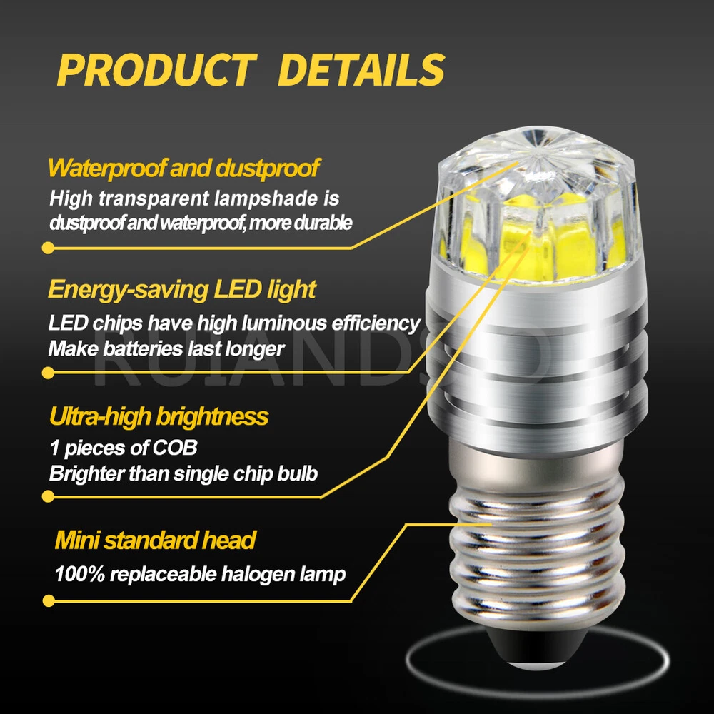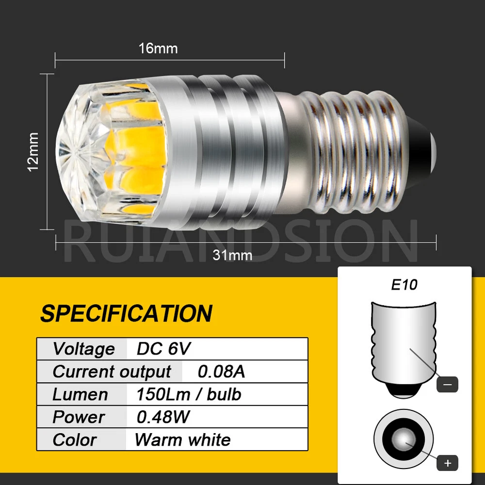 1. Model: E10 2. Color: White/ Warm White/ Yellow 3. Voltage: DC 3V/ 6V/ 12V Negative Earth (bulb side"-", tip"+") 4. Lumen: 150lm 5. LED Chip: COB LED 6. LED QTY: 1pc LED 7. Usage: Torch Flashlight bulb/ Screw Base Bulb 8. Lifespan: up to 50,000 Hours 9. Warranty: 12 Months 10. Certification: CE, RoHS