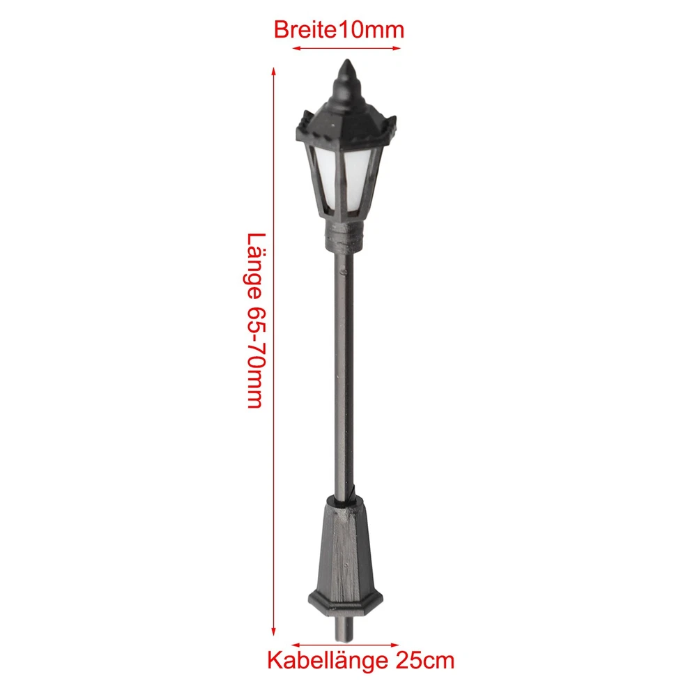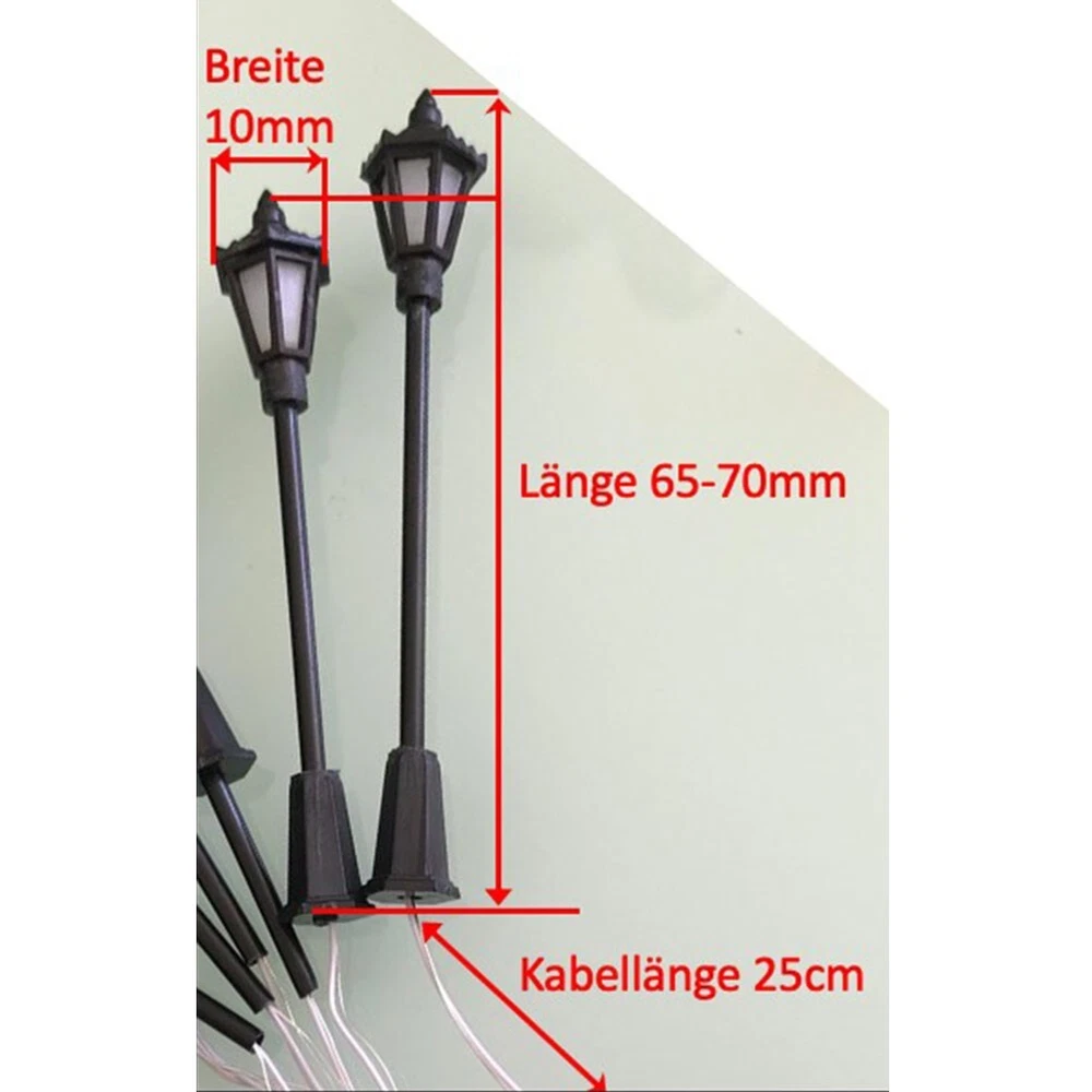 Model Street Lamp 3V Building Lighting Train Garden Decoration Railway DESCRIPTION Note: Since the size above is measured by hand, the size of the actual item you received could be slightly different from the size above. Meanwhile, please be reminded that due to lighting effects, monitor's brightness / contrast settings etc, there could be some slight differences in the color tone of the pictures and the actual item. Features: * brand new and high quality *Made of high-quality materials, safe, environmentally friendly, and *Model train scenery or street layout accessories, very suitable for model railway landscape *High quality work light with wiring *Equipped with wires and LEDs, and can be lighted *These lamp posts are only suitable for 3V supply voltage *Please apply correct Operating Current 20mA to each LED too. *Uses: accessories for building sand table models, garden decoration, supporting landscape, leisure and entertainment, scene model lights, moss microlandschaft equipment, DIY ecological bottle materials *Light up your model lay out with this great model lamp post Specifications: *Length: 65-70mm (adjustable) *Width: 10mm *Cable length: 25cm *Scale: 1: 50-1: 100 *Gauge: H0 for TT 00 *Material: Plastic *Voltage: 3V Package Contents: 10*LED street lights 10*Resistance Note: 1. The real color of the item may be slightly different from the pictures shown on website caused by many factors such as brightness of your monitor and light brightness. 2. Please allow slight manual measurement deviation for the data. POLICES Shipping Payment WARRANTY We only ship to confirmed ebay Order addresses. Please comfirm that your Order address is in line with your shipping address. Please kindly note that the c ombined shipping is not provided because the shipping fee is calculated by weight. Also, the each additional item means exactly the the same color and size. It takes about 7 -15 working days to US; about 10-30 working days to other countries. Transit time may be a little delayed because of the bad weather and customs inspection . If you do not receive your item within 30 working days since payment finished, please contact us immediately for further assistance. Payment must be completed within 5 days. If you have any problems about payment, please contact us via ebay message. We strive for 100% customer satisfaction! Positive Feedback is very important to us. If you have any questions, p lease feel free to contact us via "Ask seller a question" . We will reply your email within 24 working hours. On Feb 4, 2025 at 19:45:47 PST, seller added the following information: