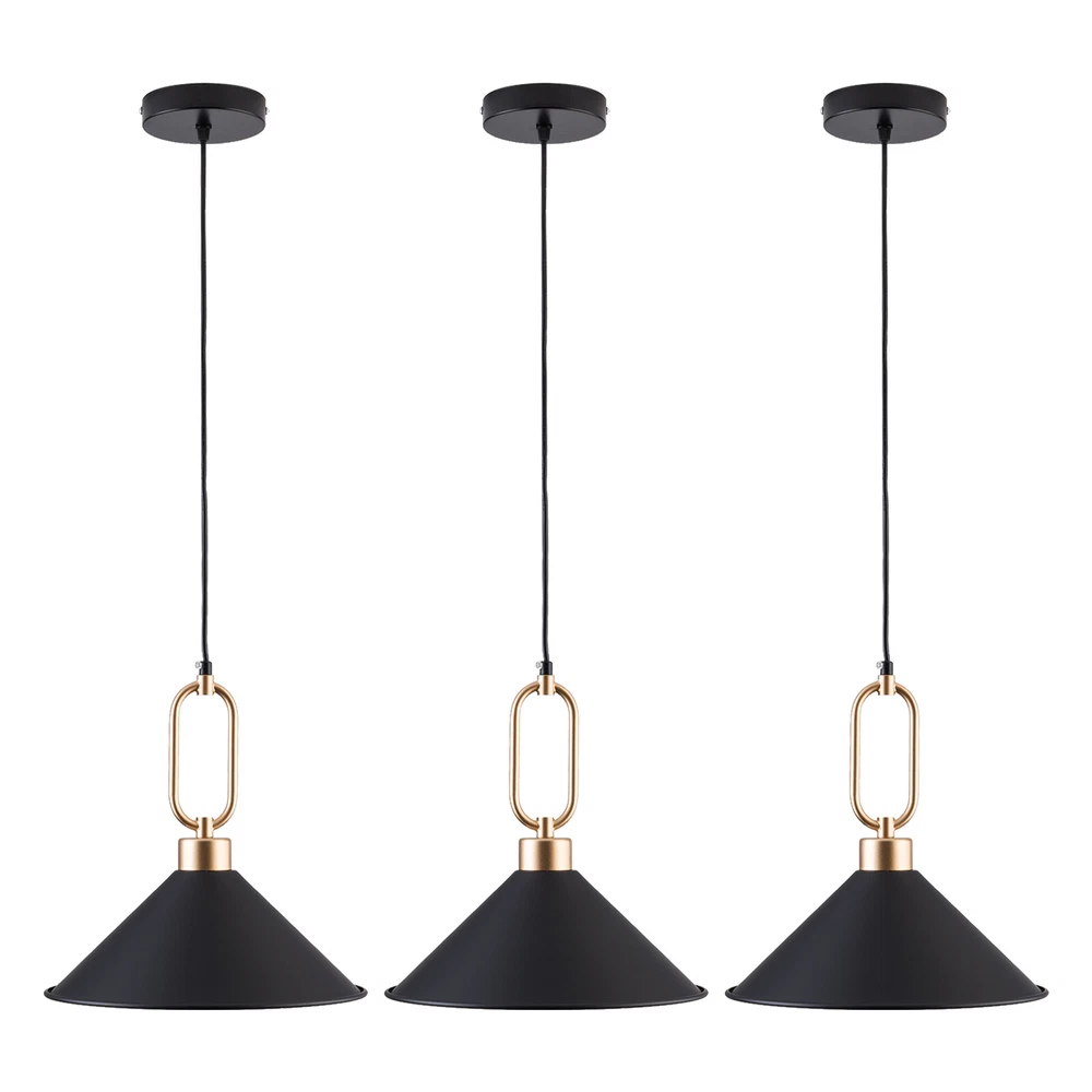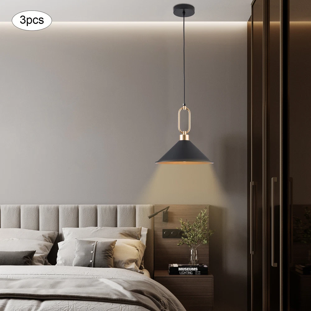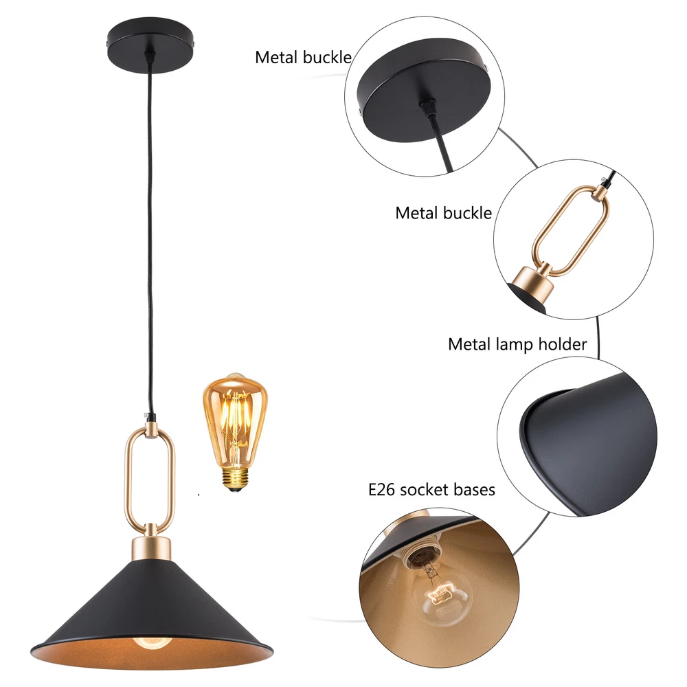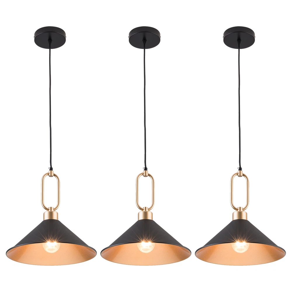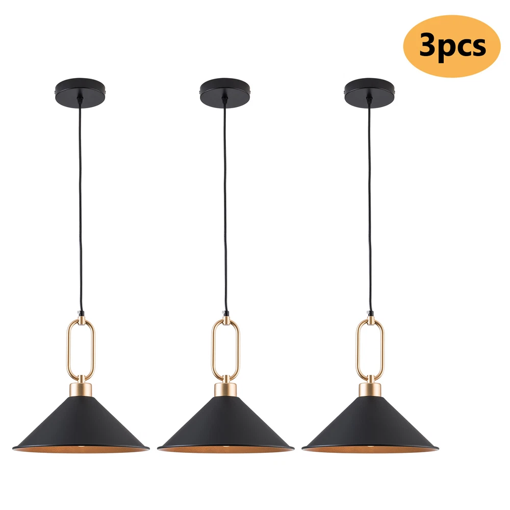 UPC: Does not apply Installation Type: Hanging Type: Pendant Light Color: Warm White Light Source: E26x3 (Not Included) gtin13: Does not apply Features: Industrial Pendant Light, 3-Light, High-quality Material, 3-Pack, Adjustable Height, Firm Design Assembly Required: Yes  Brand: Unbranded Finish: Baking Paint Department: Adults Room: Living Room,Bedroom,Dining Room,Hallway,Home Office,Kitchen,Bar Voltage: 110 V Lighting Technology: LED/CFL/Incandescent Wattage Per Bulb: 60W Style: Modern Power Source: Hardwired Energy Star: A+++ MPN: Does Not Apply Installation Area: Indoor Wire Length (Adjustable): 100cm/3.3 ft Material: Iron, PPC, Copper Labels & Certifications: Energy Efficient Cord Color: Black,Gold Color: Black