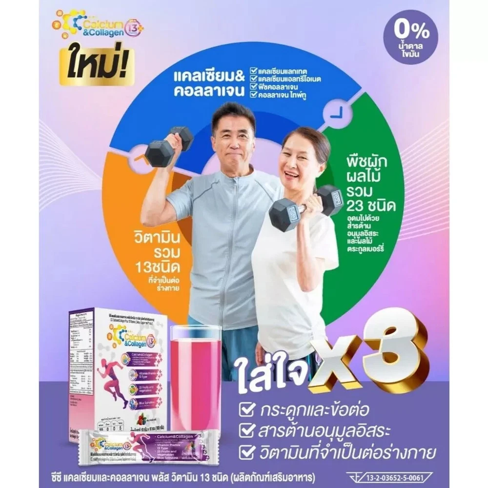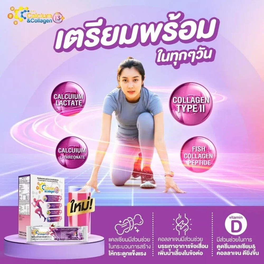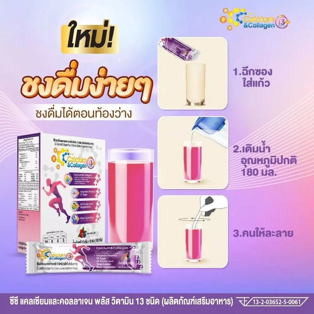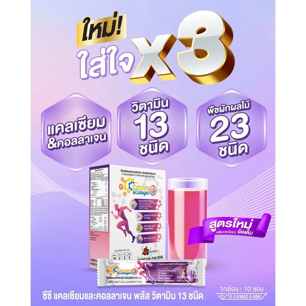 3X CC Calcium Collagen Vitamin Plus Antioxidant Joint Bone Knee Skin Mix Berry Free Shipping with tracking number Condition : New , Original Quantity : 3 Boxes (30 sachets) Size : 10 sachets / 1 Box FDA Registration Number 13-2-03652-5-0061 Product details CC Calcium & Collagen Plus 13 (New Product / New Formula) (CC Calcium and Collagen Plus 13 Vitamins) 1 box, new size, contains 10 sachets Main components 1) Calcium Lactate Pentahydrate 2) Calcium L-Threonate 3) Tri-Peptide Fish Collagen 4) Type II Collagen 5) BCAAs (L-Leucine, L-Isoleucine, L-Valine) 6) Vitamin Premix 13 Type 7) 23 Fruits & Vegetables 8) Blue Spirulina 0% sugar 0% fat How to eat: Mix and drink 1 sachet a day with 1 glass of water On an empty stomach (morning or before bed) Benefits of CC Calcium and Collagen Plus 1. Strengthens tissue Reduce inflammation of joints, knees are stuck, shoulders are stuck, walking is difficult, moving is painful 2. Strengthen bones, increase bone mass to be strong. Elderly people often have reduced bone mass, causing osteoporosis, brittle bones, thin bones, easy to break 3. Increase necessary collagen in the joints, reduce friction that causes joint inflammation, cracking sounds 4. Increase collagen in the skin to make it white, smooth, clear, plump, bouncy skin that looks younger ** Calcium that is soluble in water, can absorb more than 95%, helps increase bone mass and takes care of the problem of cracking knees. There is also collagen type two that helps increase tissue, connective tissue for the body more.** Note : The result may vary by individual. Thank you very much. Have a good day.