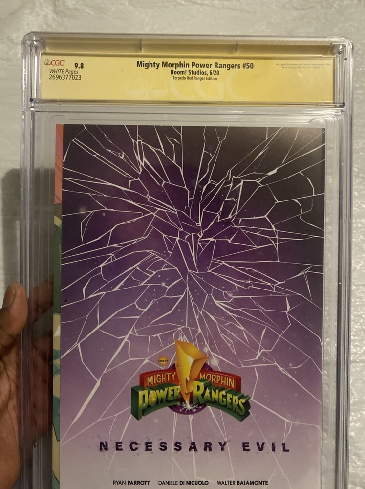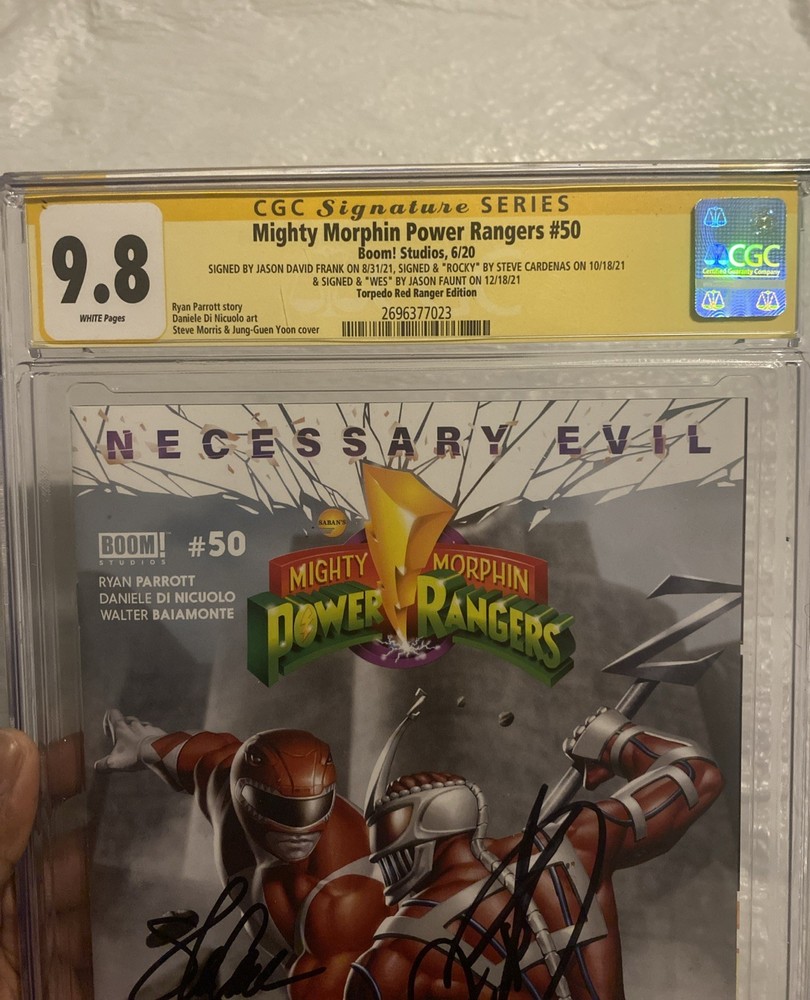 The product is a 3x signed Mighty Morphin Power Rangers "Red" comic book graded CGC 9.8 Mint by Frank, Steve, and Jason Wes. Published by BOOM! Studios, this modern age comic book in English language features the Power Rangers universe and is intended for a general audience. With autograph authentication by Certified Guaranty Company (CGC), this single issue is a collectible item for fans of the Mighty Morphin Power Rangers series.
