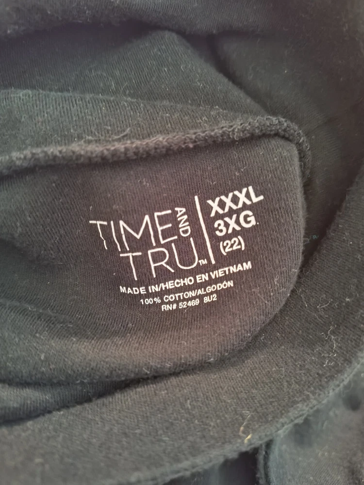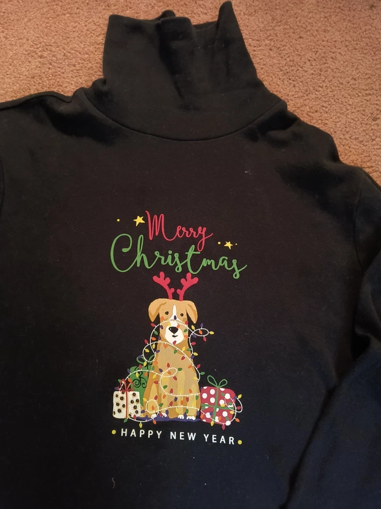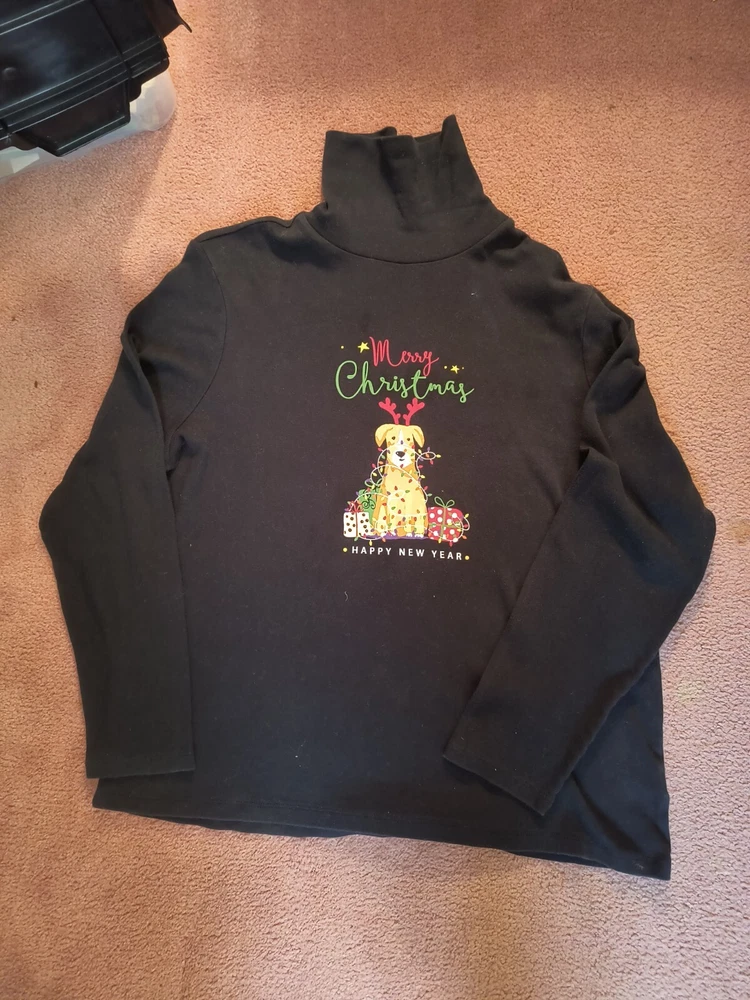 This long sleeve Christmas shirt features a graphic of a dog tangled in Christmas lights and gifts on either side of it. "Merry Christmas" in bold red and green fancy print and happy new year in white subtle soft print. The shirt is solid black with long sleeves and a turtle neck for extra warmth during the cold season. The material is 100% cotton and very soft to the touch. Soothing! The size is 3XL. This shirt has been very gently used and is like new.