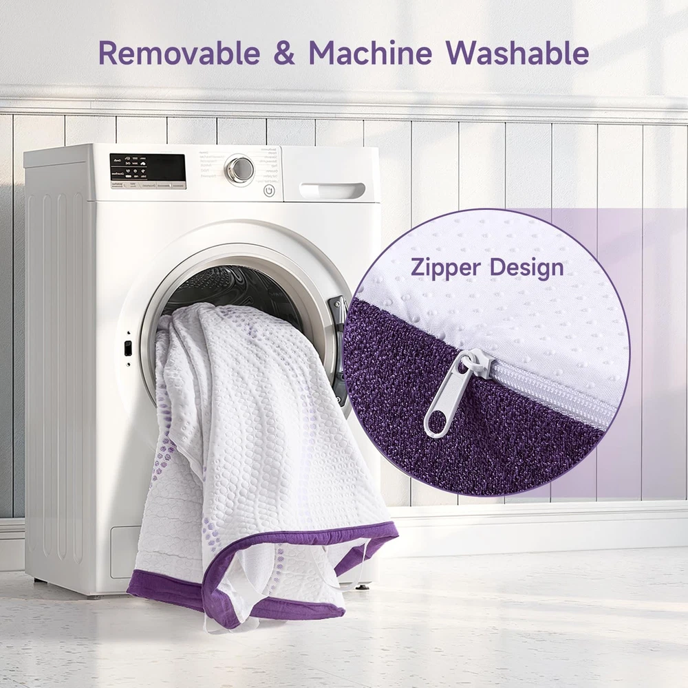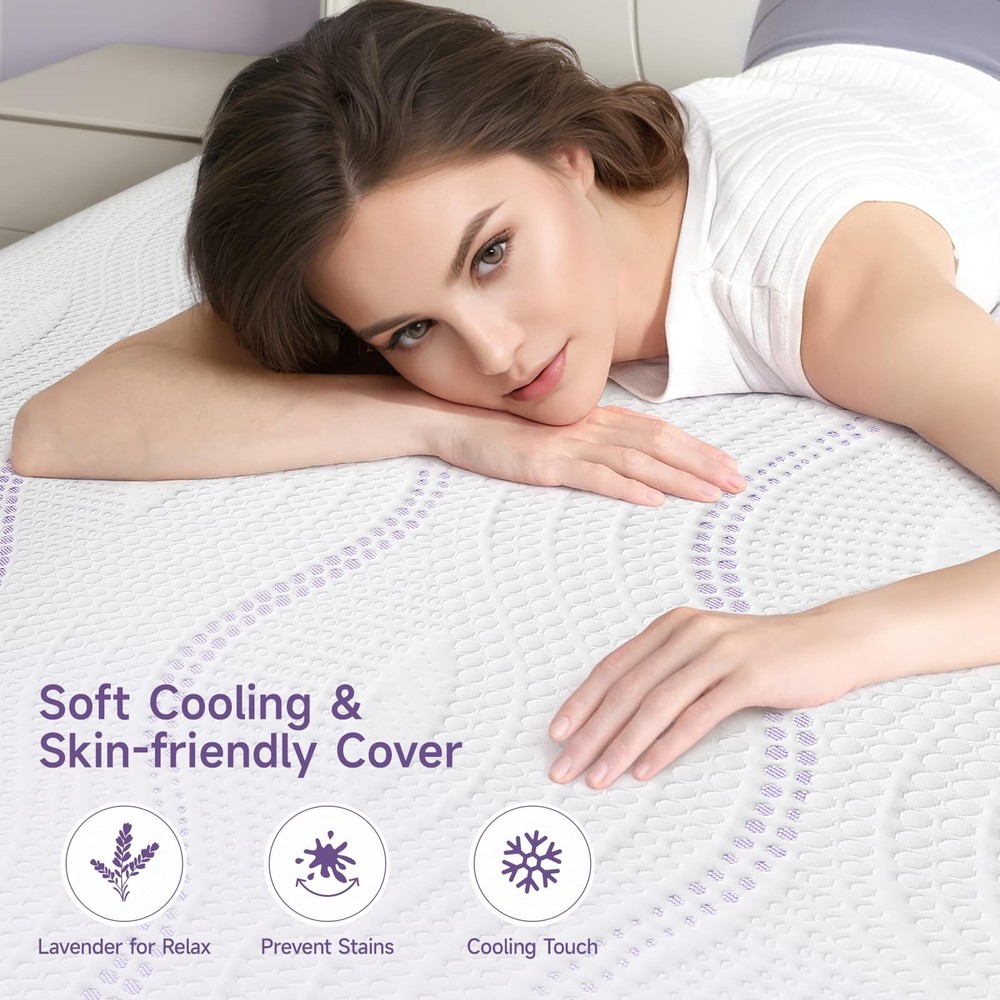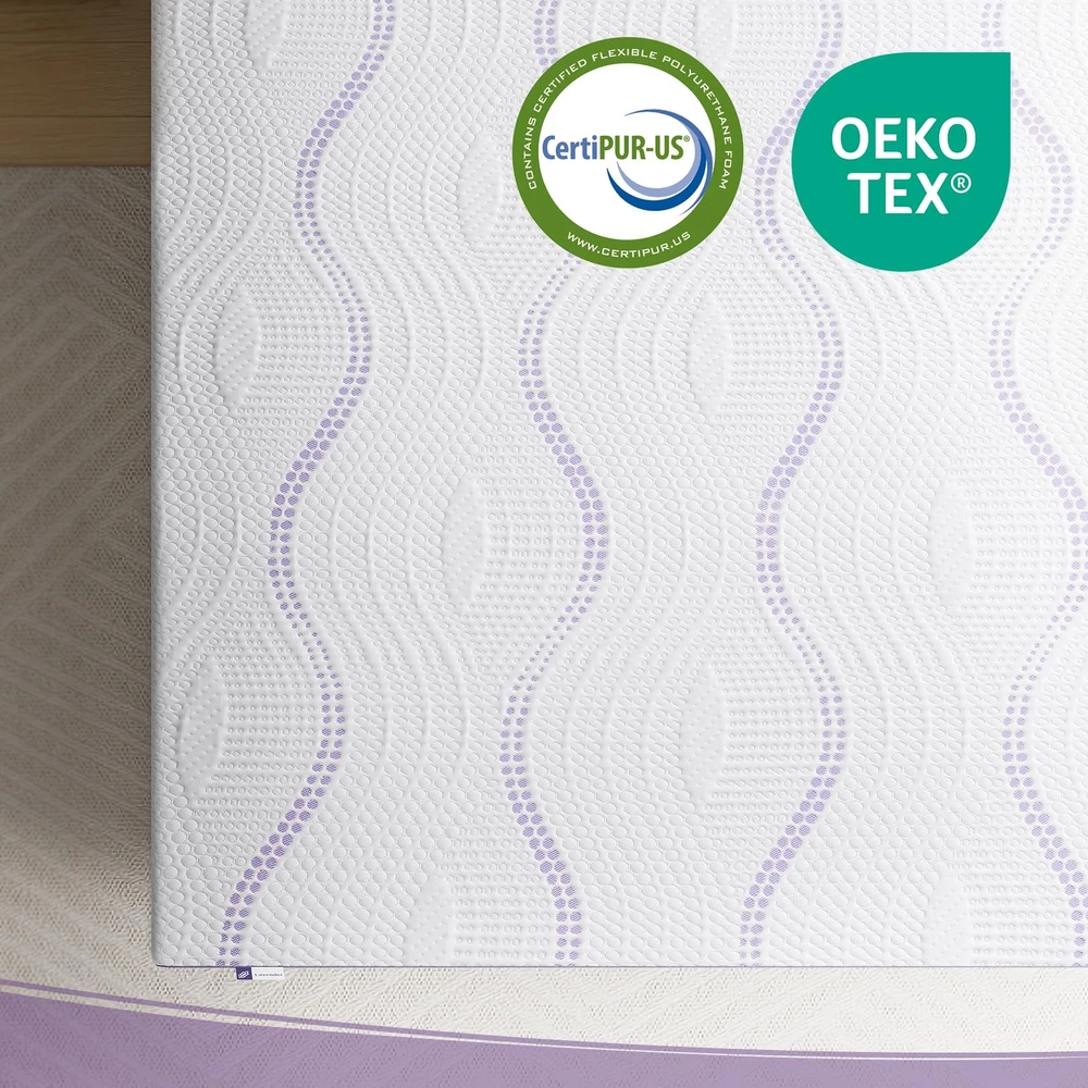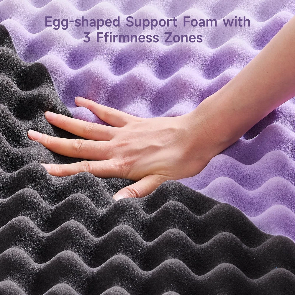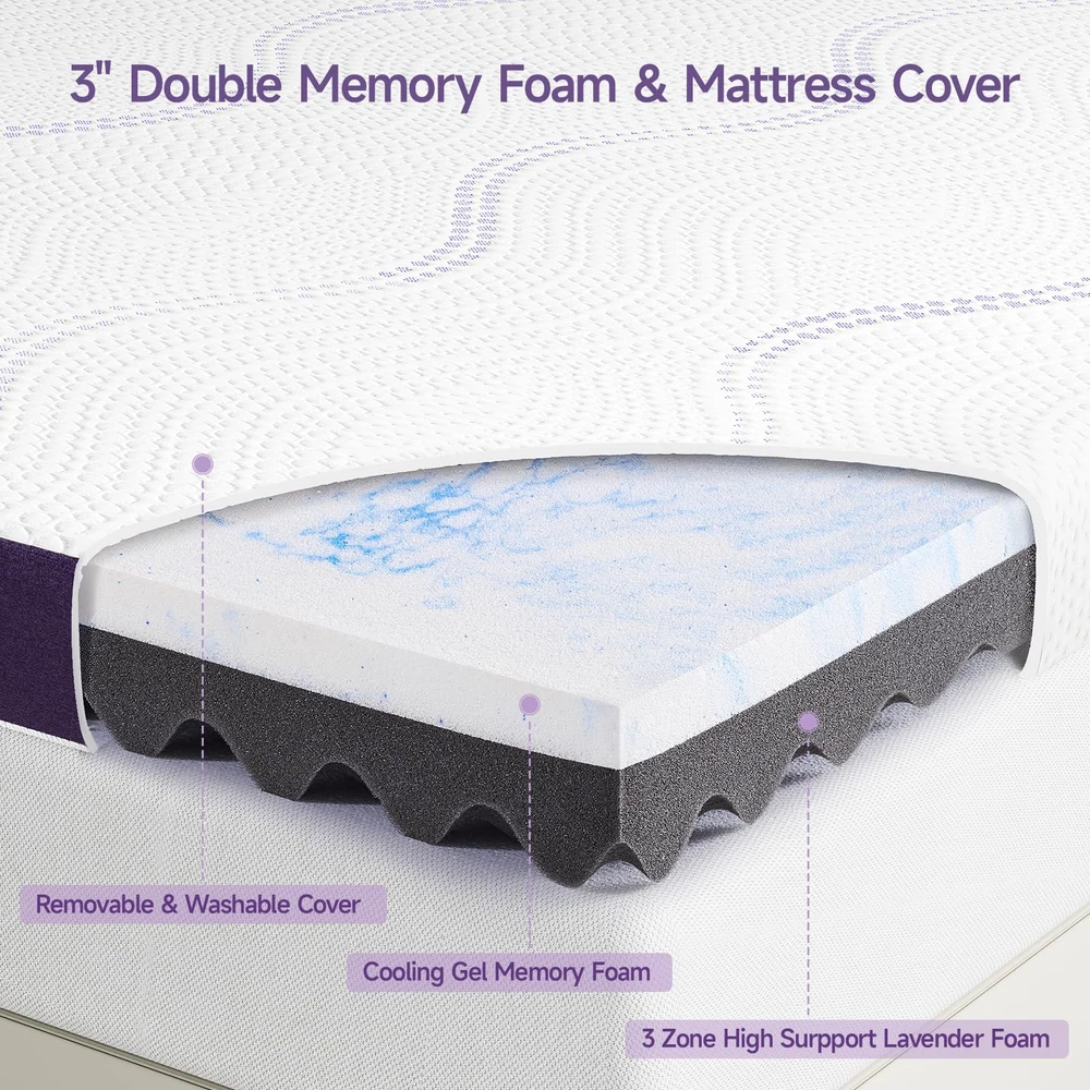 Dimensions: 80"L x 76"W x 3"H. Before first use, please lay the topper flat in a ventilated area for 48-72 hours until it is fully expanded. Low temperature may need more time Dimensions: 75"L x 54"W x 3"H. Before first use, please lay the topper flat in a ventilated area for 48-72 hours until it is fully expanded. Low temperature may need more time 3-Zone Directional Support: According to the curvature of the human spine, the memory foam mattress pad is divided into 3 zones: the two ends of the foam are slightly soft to gently support the shoulders and hips, and the middle is firmer to give sufficient support to the lumbar and back Luxurious Lavender Fabric: 's upgraded mattress padding is made of high-end lavender fabric, which is not only skin-friendly and soft, but also relaxing. The cover is removable for machine washing Dual-layer Egg-shaped Memory Foam: The top layer of memory foam infused with cooling gel, which can slowly rebound to better fit your body and keep you cool and refreshed all night long; the second layer is composed of egg-shaped bamboo charcoal sponge and lavender sponge, which not only provides support but also dissipates the heat better and relaxes your body Non-Slip Bottom & Four Elastic Straps: The bottom fabric is made of non-slip fabric to increase friction, plus four elastic straps to keep the mattress in place, you won't have to adjust the mattress frequently the next day Certified Mattress Topper: Our memory foam mattresses not only have the CertiPUR-US certificate (which measures odor, material, performance, and durability) but also the rigorous certification from OEKO-TEX