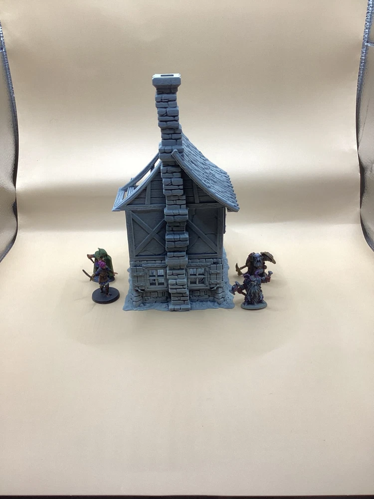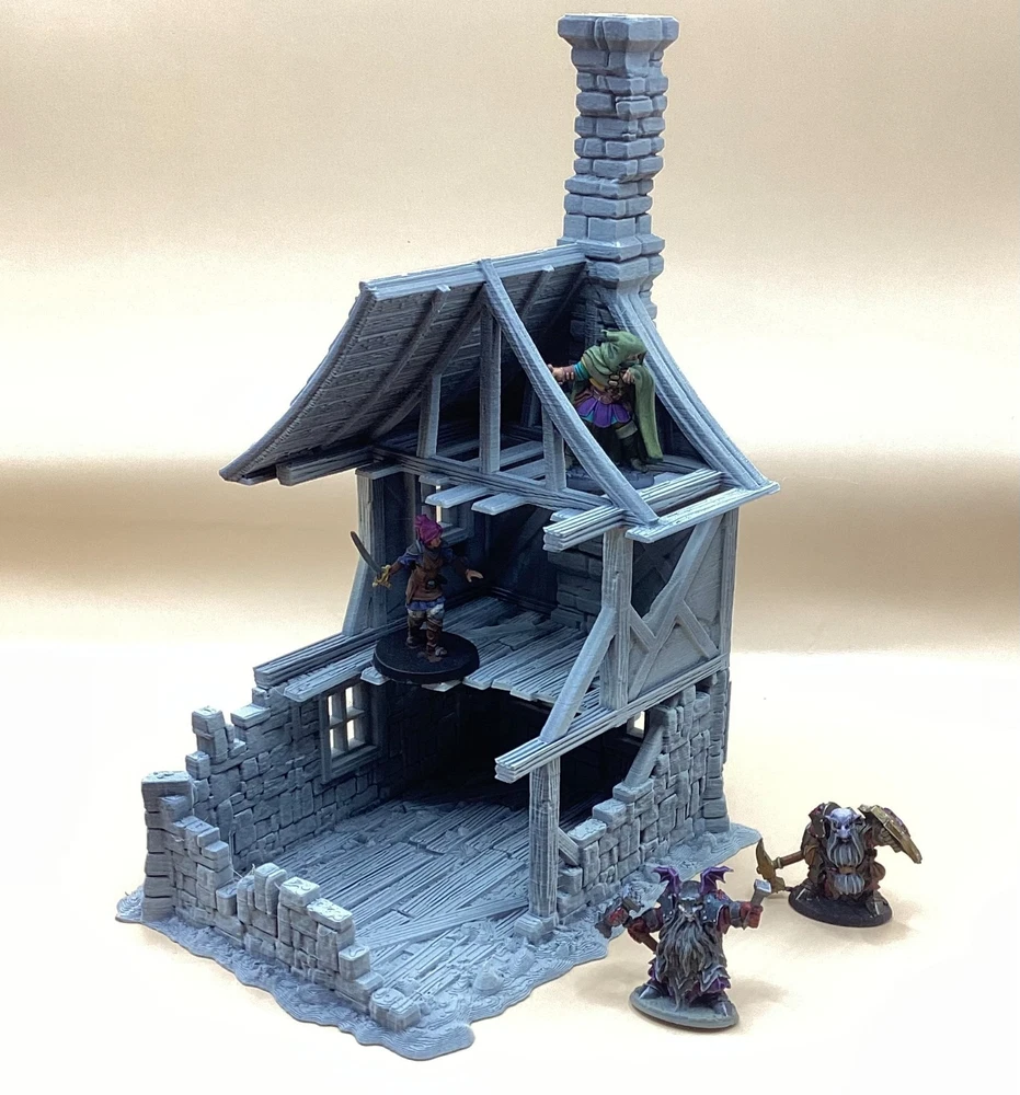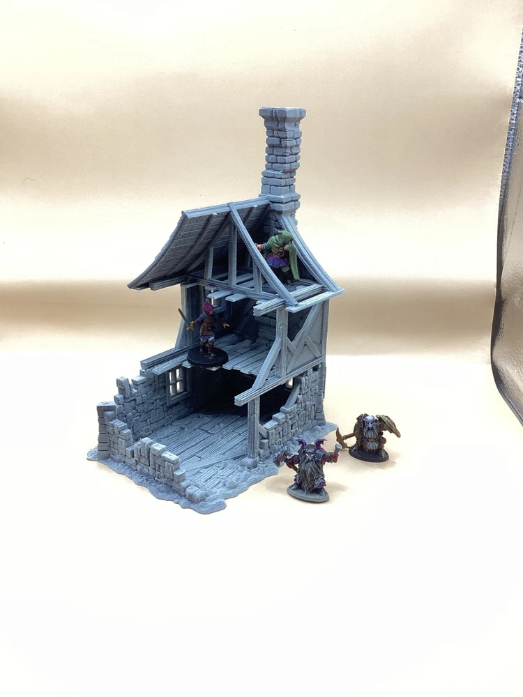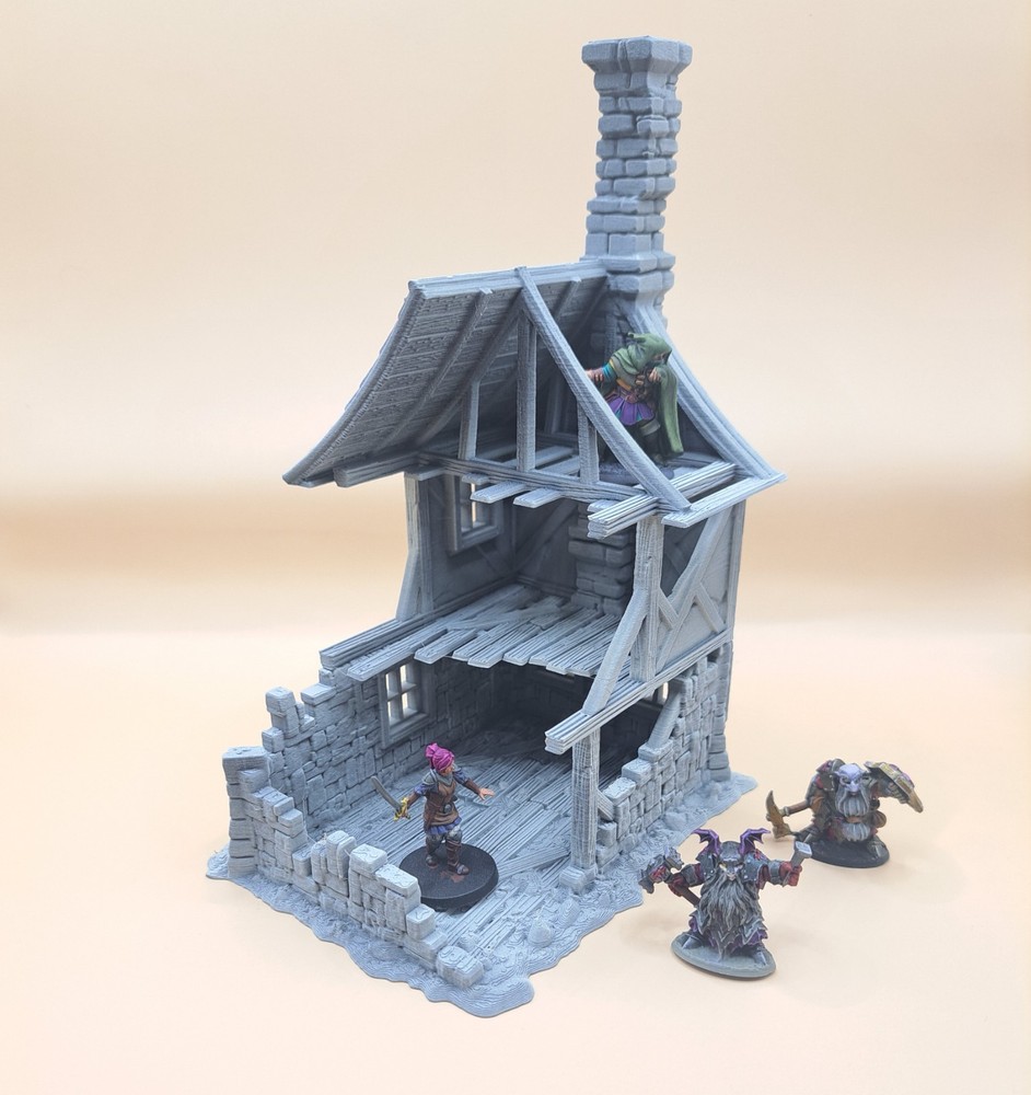 Note: Set is delivered unpainted in Grey or Black PLA. Pictures shown in listing that are painted are only for demonstration purposes. If you have any questions regarding assembly of this item, please message me for additional detail. Minis for reference are 28mm scale. This 3d printed ruined house is perfect for tabletop roleplaying games and scenery. It's a great addition to any miniature or war game collection. The intricate details and high-quality printing make it a must-have for any fantasy enthusiast. The house is ideal for creating a unique and exciting atmosphere for your games whether in a spooky horror setting, an abandoned village, or one that's under attack. This tower covers 3 floors, comes in 3 pieces and we have variants for28mm and 32mm miniatures. Returns are accepted if the item does not match the listing description or is not accurate as advertised. If you have any questions or concerns please contact me. Accreditation Designer: 3dpforU Check them out on myminifactory. https://www.myminifactory.com/users/3dpforu I am a licensed printer of 3dpforU