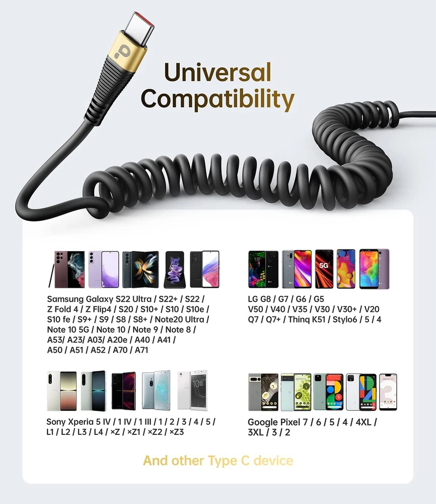 USB C Cable Fast Charging, 2Pack 3ft Coiled USB A to Type C Charge Cord for Car, USB-C Charging Cable Compatible with Samsung Galaxy S20 S10 S9 S8 Plus Note 10 9 8 and Other USB C Devices-Gold Elastic Coiled USB C Cable Made for Car: The USB Type-C cable is designed with stretchable, no tangle, no knot, and does not take up space. This coiled USB C charging cable is made of upgraded high quality PU material, which is flexible, easy to stretch, effortless, quick to rebound and not easily deformed. Length of Use: 1.3 Feet before stretching, maximum stretch length is 4 feet. Comfortable length of use is 2-3 feet and bounce back to normal length well. Convenient for charging your devices in the bedroom, on the sofa, in the office, while travelling. Easy to use for different occasions, perfect for your different needs. 66W Fast Charge & Data Transfer: PRAKIE USB a to USB c cord supports fast charge and sync fast data transfer, max current is 66W , speed of data transfer up to 480Mbps.This USB c charging has a built-in intelligent safety chip, intelligent thermostat, supports charging while playing, and automatically filters voltage fluctuations to effectively protect the device. Widely Compatibility: USB type-c cables charging cord compatible with Samsung Galaxy S10 S10e S10+ Plus 5G S8 S8+ S9 S9+ S8 Plus S9 Plus, Note 8 Note 9 Note10 Note10+ Plus 5G, A10e A20 A30 A40s A50 A60 A70 A80 M30s A9/9s A9 Star A8s(2018) A6s C9 C7Pro C5Pro. Google Pixel 2 2XL/Pixel XL/Nexus 5X/Nexus 6P. LG V30 V20 G6 G5, Power Bank、tablets and other type c devices. What You Get: 2PCS 3 feet USB a to USB c cable(66W) and 12-Month warranty. We have a professional customer service team that will do our best to provide you the satisfactory service and give you pleasant shopping experience. Elastic Coiled USB C Cable Made for Car: The USB Type-C cable is designed with stretchable, no tangle, no knot, and does not take up space. This coiled USB C charging cable is made of upgraded high quality PU material, which is flexible, easy to stretch, effortless, quick to rebound and not easily deformed. Length of Use: 1.3 Feet before stretching, maximum stretch length is 4 feet. Comfortable length of use is 2-3 feet and bounce back to normal length well. Convenient for charging your devices in the bedroom, on the sofa, in the office, while travelling. Easy to use for different occasions, perfect for your different needs. 66W Fast Charge & Data Transfer: PRAKIE USB a to USB c cord supports fast charge and sync fast data transfer, max current is 66W , speed of data transfer up to 480Mbps.This USB c charging has a built-in intelligent safety chip, intelligent thermostat, supports charging while playing, and automatically filters voltage fluctuations to effectively protect the device. Widely Compatibility: USB type-c cables charging cord compatible with Samsung Galaxy S10 S10e S10+ Plus 5G S8 S8+ S9 S9+ S8 Plus S9 Plus, Note 8 Note 9 Note10 Note10+ Plus 5G, A10e A20 A30 A40s A50 A60 A70 A80 M30s A9/9s A9 Star A8s(2018) A6s C9 C7Pro C5Pro. Google Pixel 2 2XL/Pixel XL/Nexus 5X/Nexus 6P. LG V30 V20 G6 G5, Power Bank、tablets and other type c devices. What You Get: 2PCS 3 feet USB a to USB c cable(66W) and 12-Month warranty. We have a professional customer service team that will do our best to provide you the satisfactory service and give you pleasant shopping experience. Shipping from the USA All of our products are shipped from the USA, ensuring quick delivery to your destination. Payment We offer the following payment methods: PayPal, credit card, bank transfer, and eBay's secure payment system. Free Shipping & Free Returns Shipping within the USA is FREE. Additionally, any return is absolutely free for you. Risk-Free Purchase You have the option to return an item within 30 days without any justification. We cover the return shipping costs! Fast Shipping We ship immediately upon receipt of payment. Generally, the package is delivered within 2-3 days in the USA. If it takes longer, we will contact you. Quality and Costs Made in Europe, USA, China No customs fees or additional charges Total satisfaction guarantee Invoice with declared VAT available upon request in .pdf format Feedback Your feedback is very important to us. After you pay for your purchase, you will automatically receive positive feedback from us.