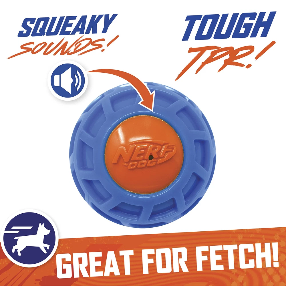 3in TPR EXO Squeak Ball - Blue/Orange nerf-tough: nerf-quality materials make our squeak ball perfect for fetch and for teaching your dog new tricks high visibility: our toy is easily trackable for both you and your pet, no matter where or how far you toss it made to last: lightweight, durable, and weather & water resistant for small, medium and large breeds: great for dogs of all sizes safety first: designed with you dog's safety in mind, each of our dog toys are tested to ensure endless hours of family fun.Age range description: All Life Stages